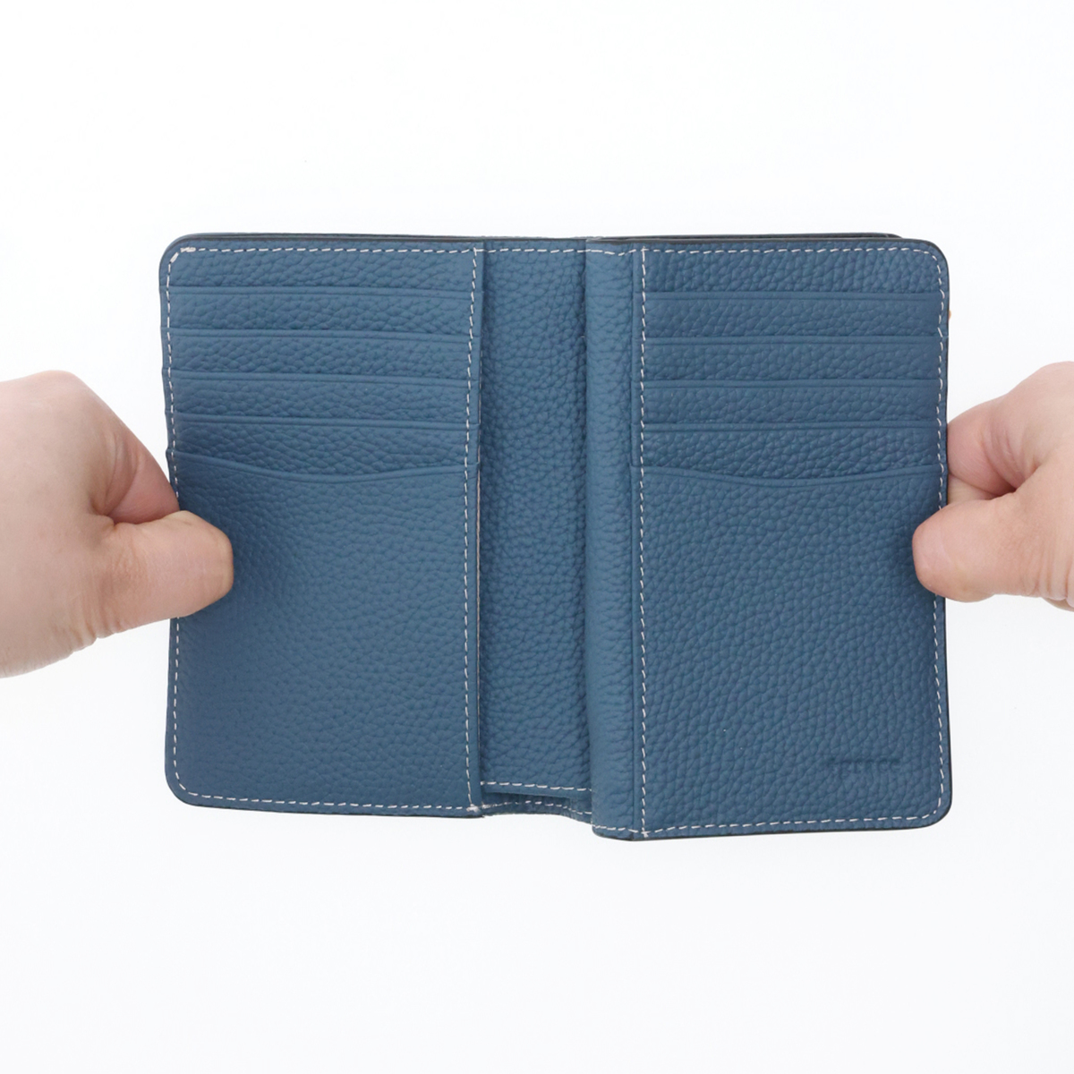[サイズ(約)] 縦9×横13.5×厚み3cm [重量(約)] 120g [素材] 表地:牛革 内側:ポリエステル ※裏地有 [仕様] 開閉:フラップ式 [ポケット] 内側:札入れ×1、ファスナー式小銭入れ×1、オープンポケット×2、カード入れ×10 外側:無 [注意事項] ※摩擦や水濡れ等により、色落ちし、衣類などへ色移りする場合がございます。薄い色の洋服との組み合わせや雨の日のご使用は十分にご注意ください ※著しく重いものや、鋭利なものを入れた場合、通常のご使用でも型崩れを起こしたり、付属品及び製品が破損する恐れがありますので、お取り扱いにはご注意ください ※ファスナー・ホック・ボタン・金具・ストラップベルト等の付属品は正しくご使用ください。誤った使用をされた場合、もしくは極度の負担がかかった場合は、付属物及び製品が破損することがありますので、お取り扱いにはご注意ください ※水分やアルコールを含む製品(香水、ウエットティッシュなど)や油分を含む製品(化粧品など)に直接触れないようご注意ください <磁石を使用した製品について> ※磁石を飲み込んでしまった場合、重大事故につながる恐れがありますので、小さなお子様やペットの手の届かないところに保管してください ※万が一磁石を誤飲した場合は、直ちに医師の診察を受けてください ※マグネット近くに磁気カードなどを近づけると磁気データが消えてしまうことがあります <革製品のお手入れ方法及び保存方法> ※日常のお手入れとして、使用後はブラシでホコリや汚れを払ってください ※濡れた場合は、乾いたやわらかい布で手早く水気を取り、風通しの良い場所で陰干ししてください ※素材に合ったクリーナーやクリーム等を説明書に従って使用してください ※直射日光、高温な場所、湿度の高い場所での保管は、退色、色落ち、変形、型崩れ、質感の変化の原因となりますので、お避けください <防カビ剤が入っている場合> ※使用する製品にワサビの香りが移ることがありますが、袋から出し通気性の良い場所に置くことで香りは軽減されます 【中国製】