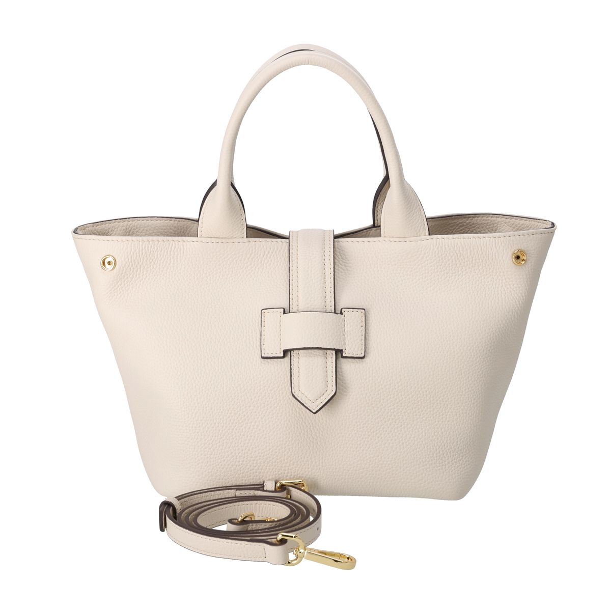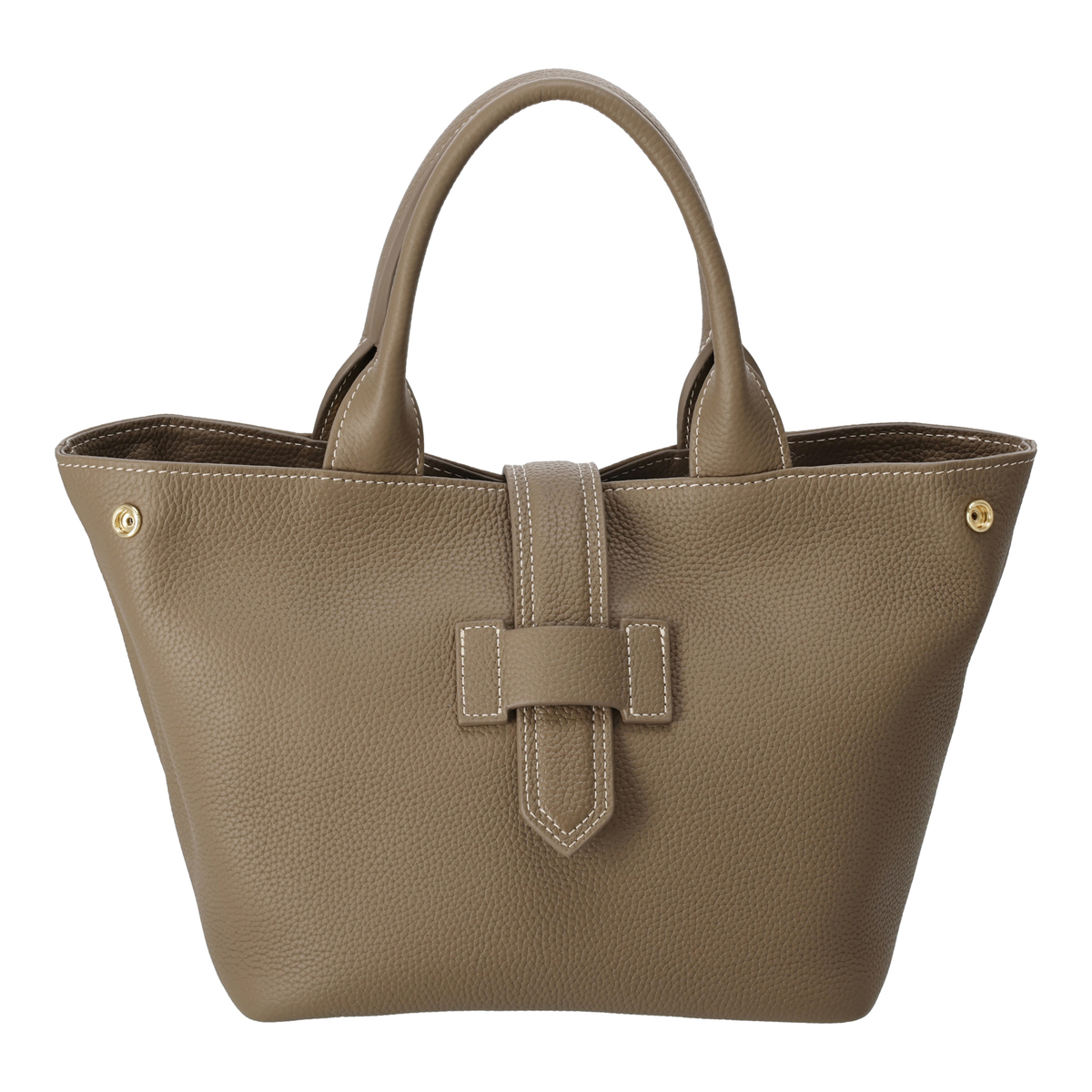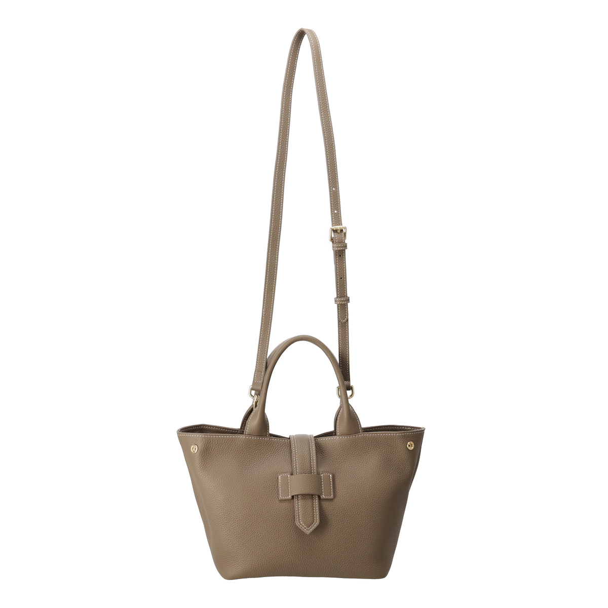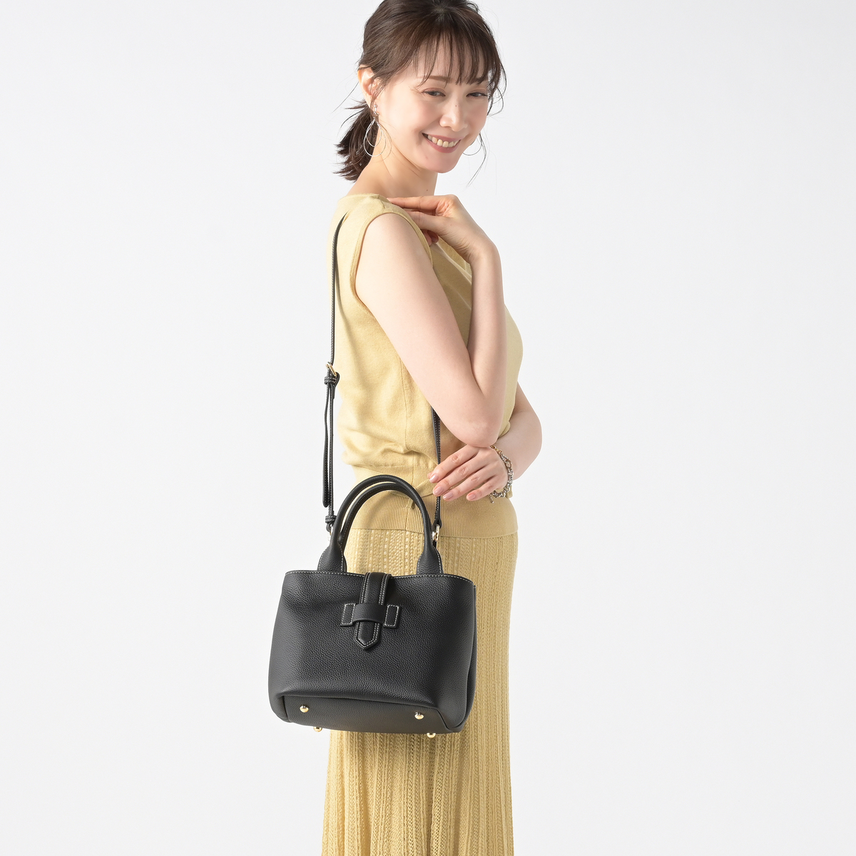 表面に凹凸のあるシュリンクレザーを使用した2WAYトートバッグ。エレガントで気品漂うベルトデザインがアイコンに。サイドホックと内側のベルトで、形状のアレンジも。ステッチ使いが絶妙で、上品な印象を与えてくれます