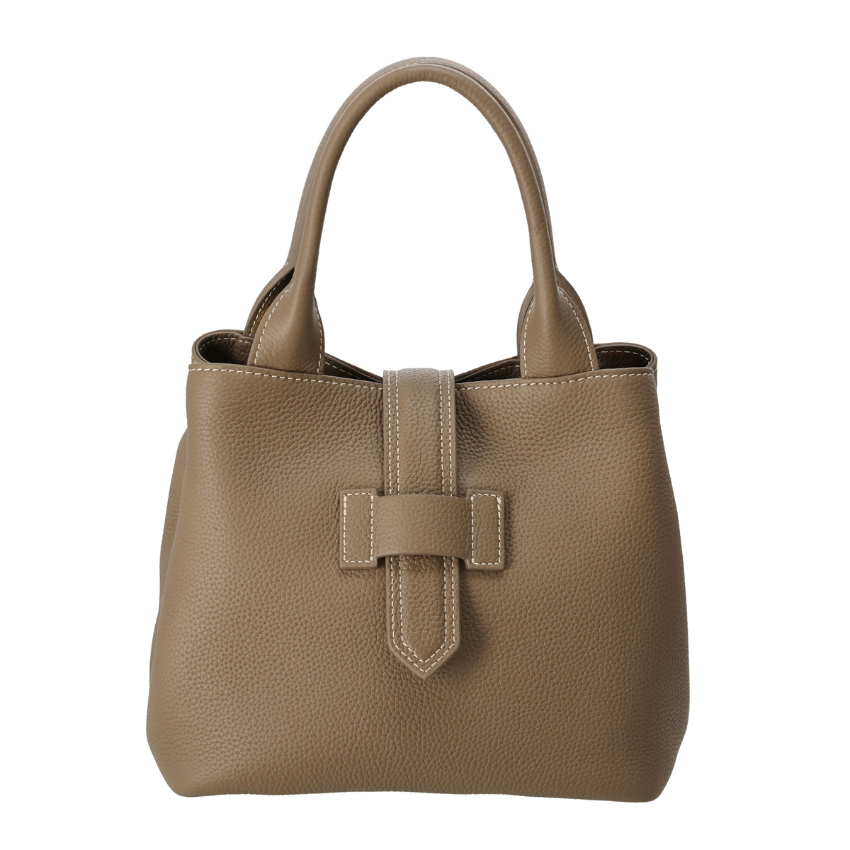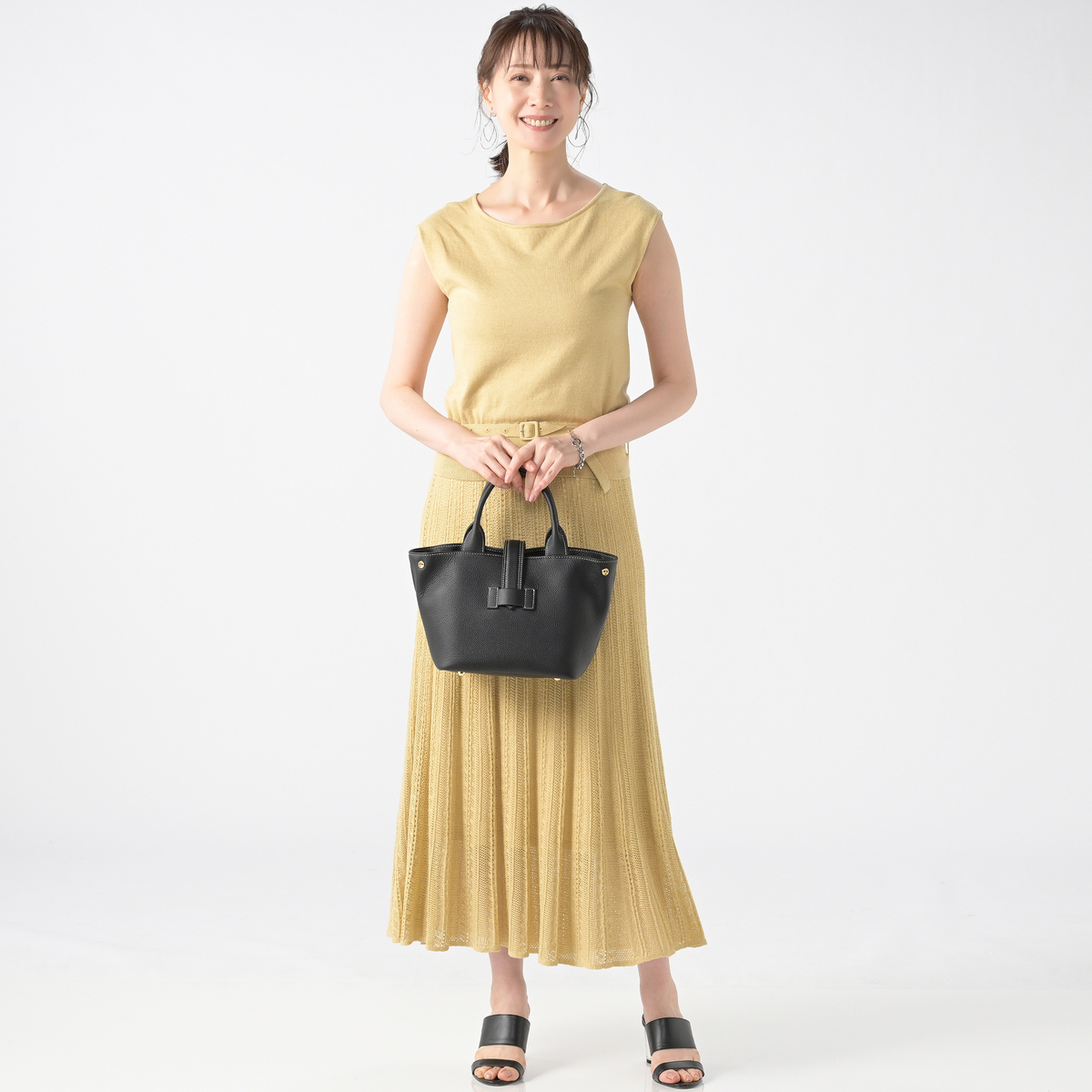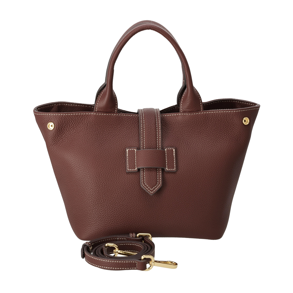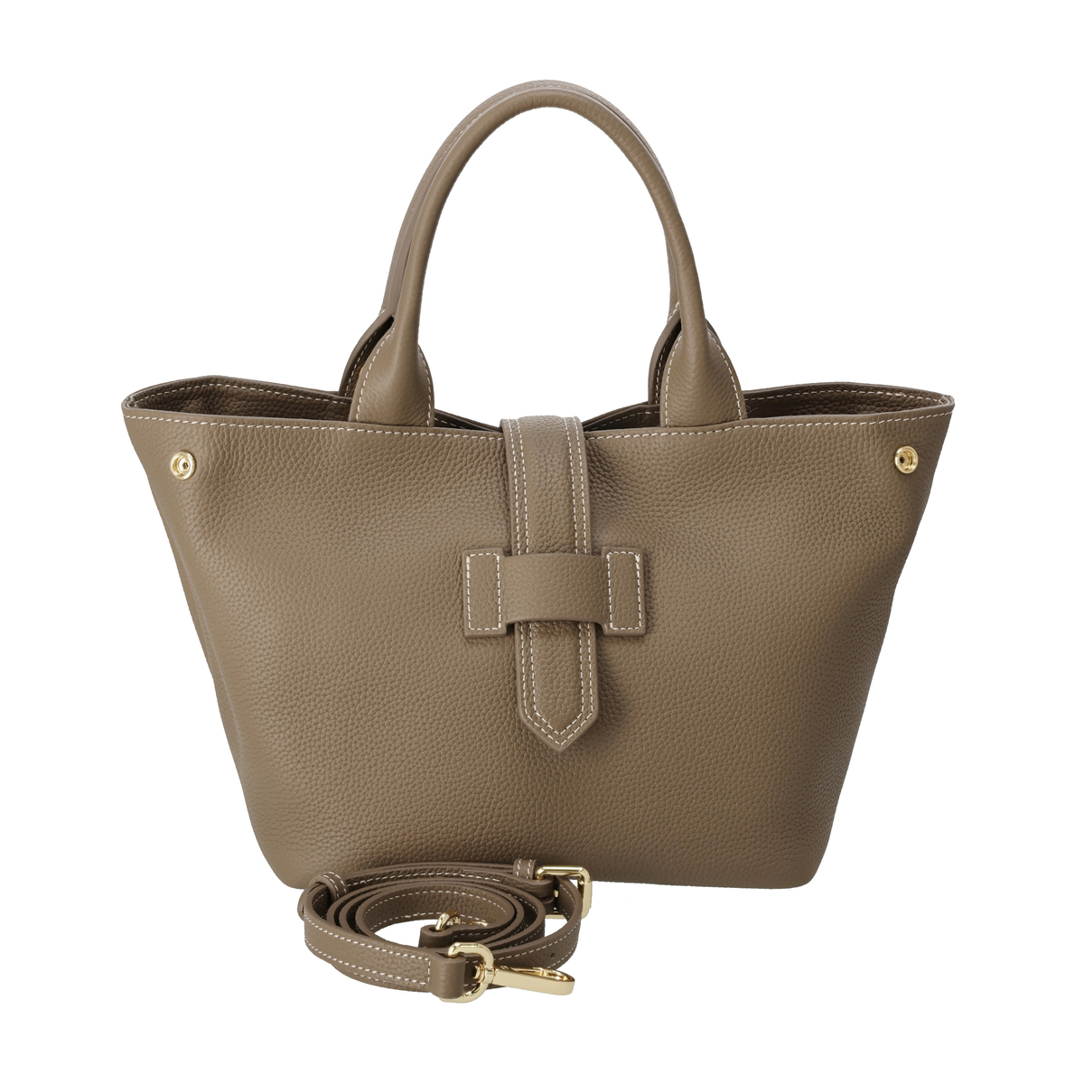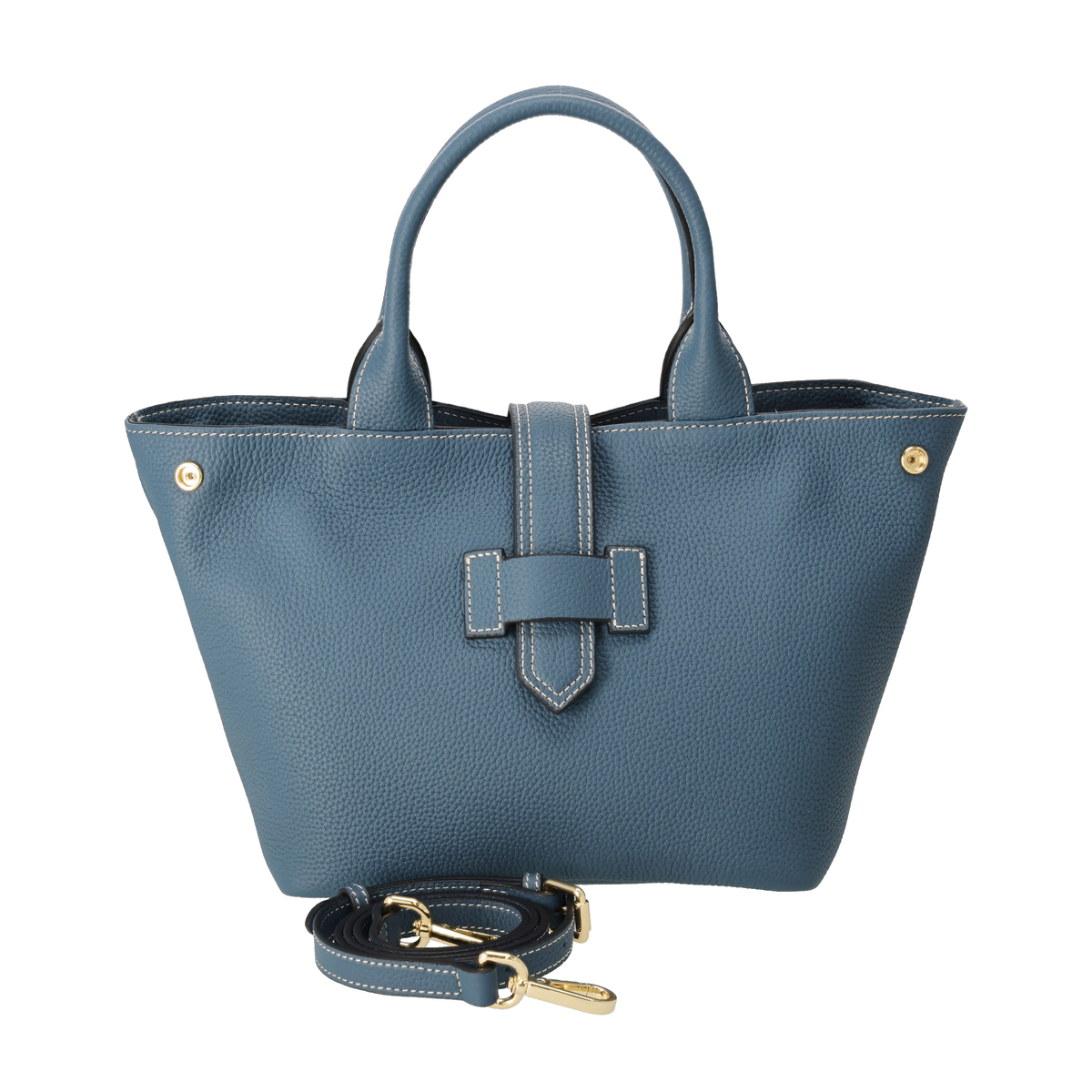 表面に凹凸のあるシュリンクレザーを使用した2WAYトートバッグ。エレガントで気品漂うベルトデザインがアイコンに。サイドホックと内側のベルトで、形状のアレンジも。ステッチ使いが絶妙で、上品な印象を与えてくれます