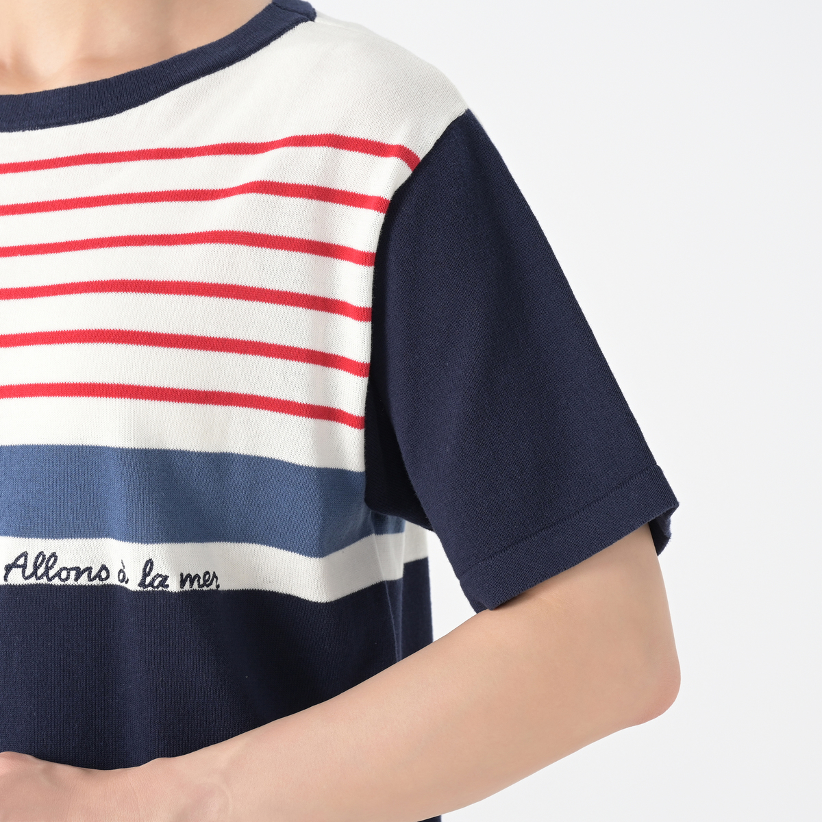 ボーダーのピッチを部位によって変えてデザインした、ニットプルオーバーです。シャリっとした風合いながらも、安心感のある肉感に仕上げました