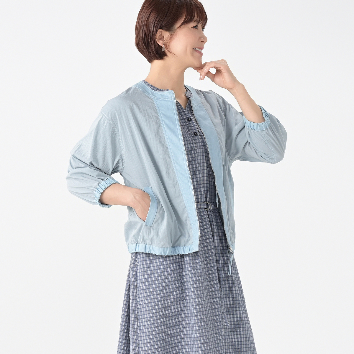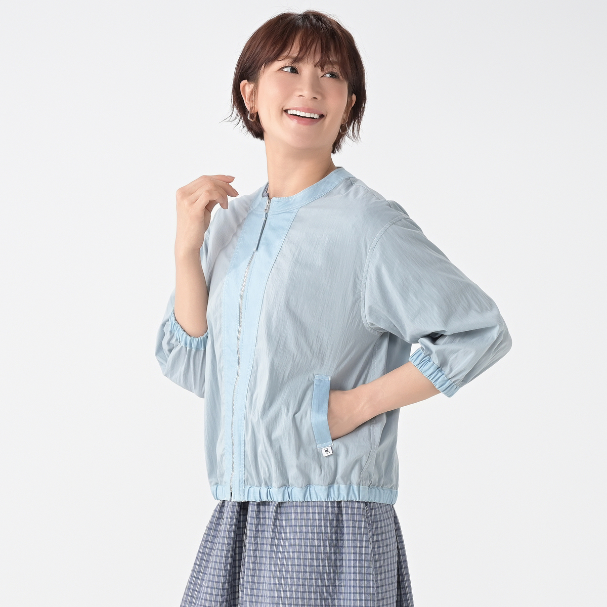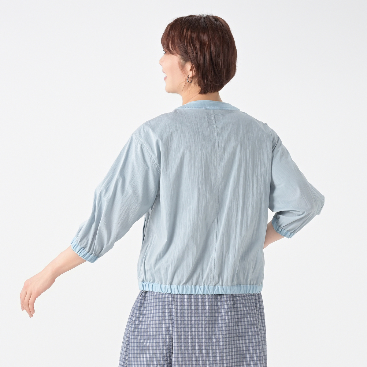 ノーカラーで使い勝手の良い、ショート丈のライトブルゾン。さまざまなアイテムと合せやすいデザインです。裾と袖口にギャザーを入れて、メンズライクなアイテムにフェミニンな印象をプラスしました