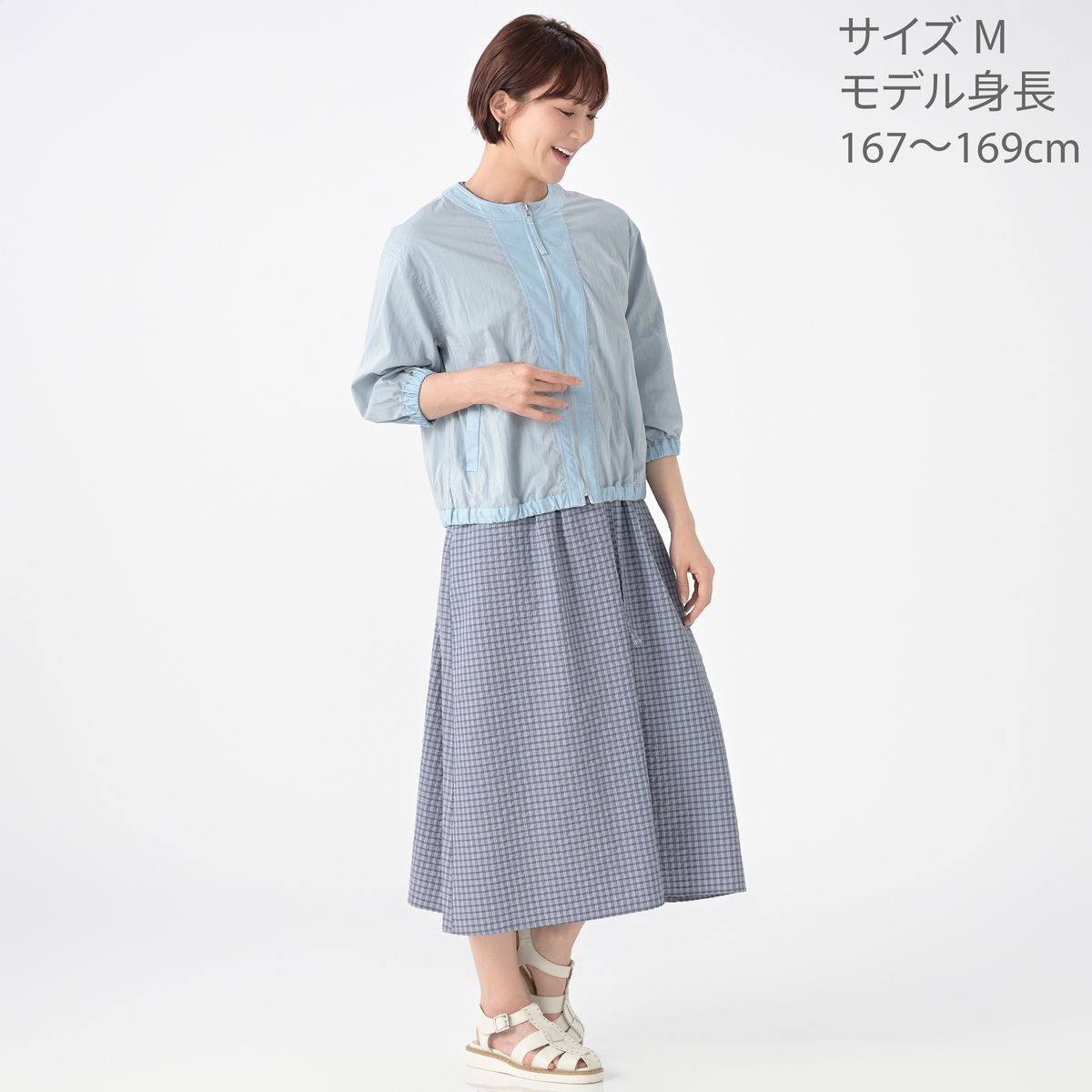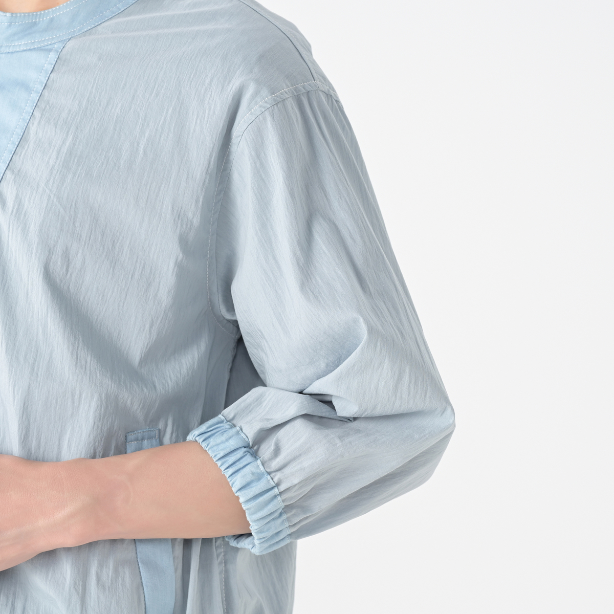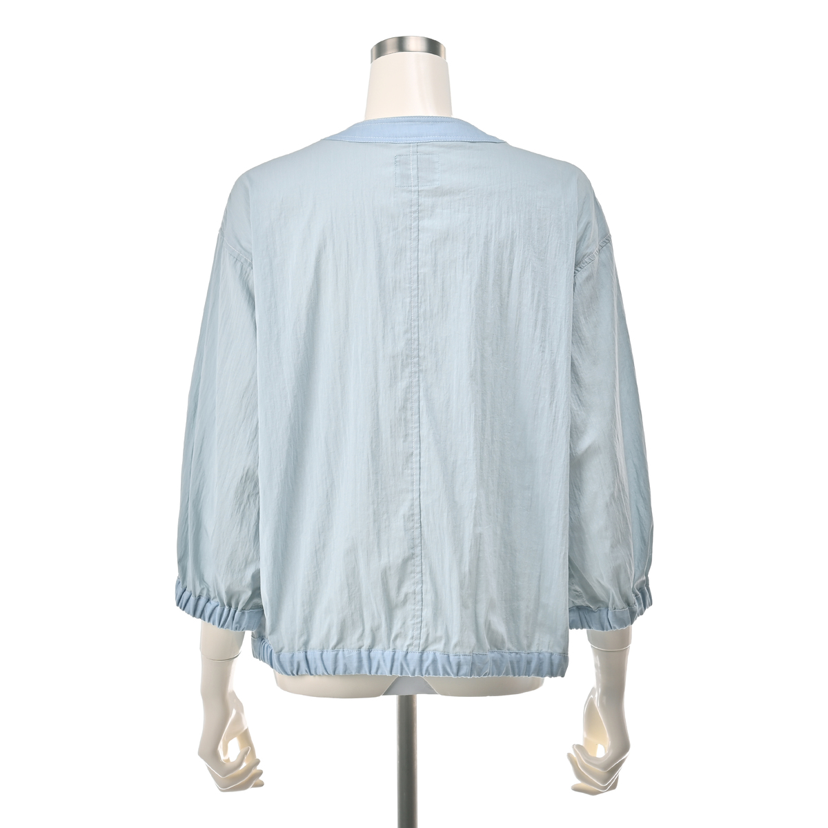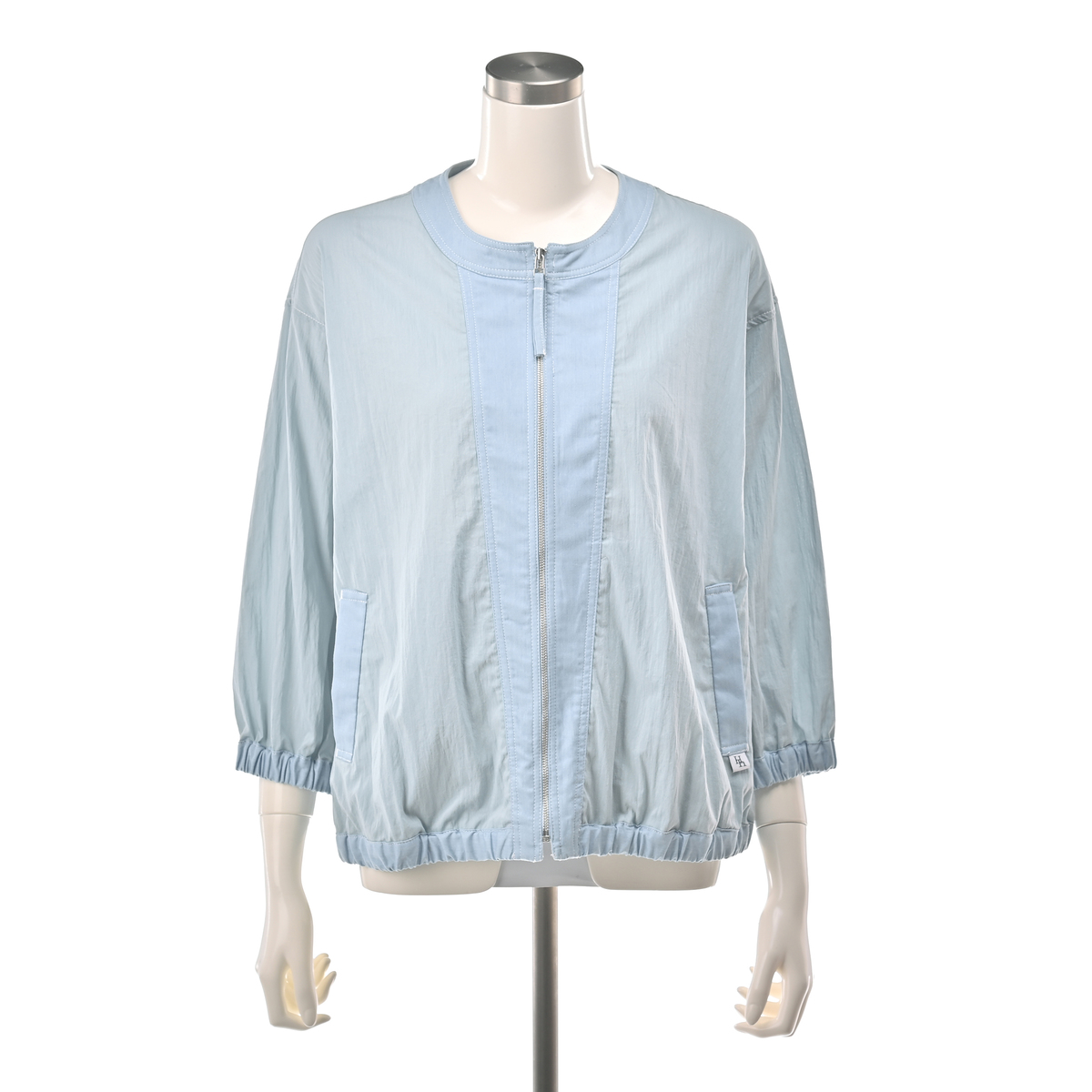 ノーカラーで使い勝手の良い、ショート丈のライトブルゾン。さまざまなアイテムと合せやすいデザインです。裾と袖口にギャザーを入れて、メンズライクなアイテムにフェミニンな印象をプラスしました
