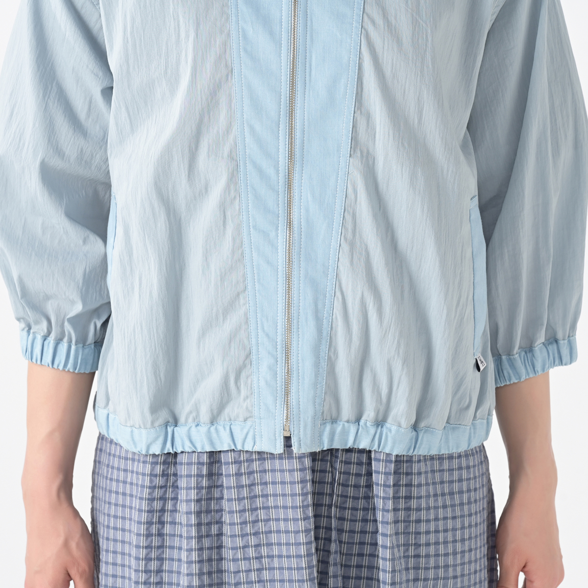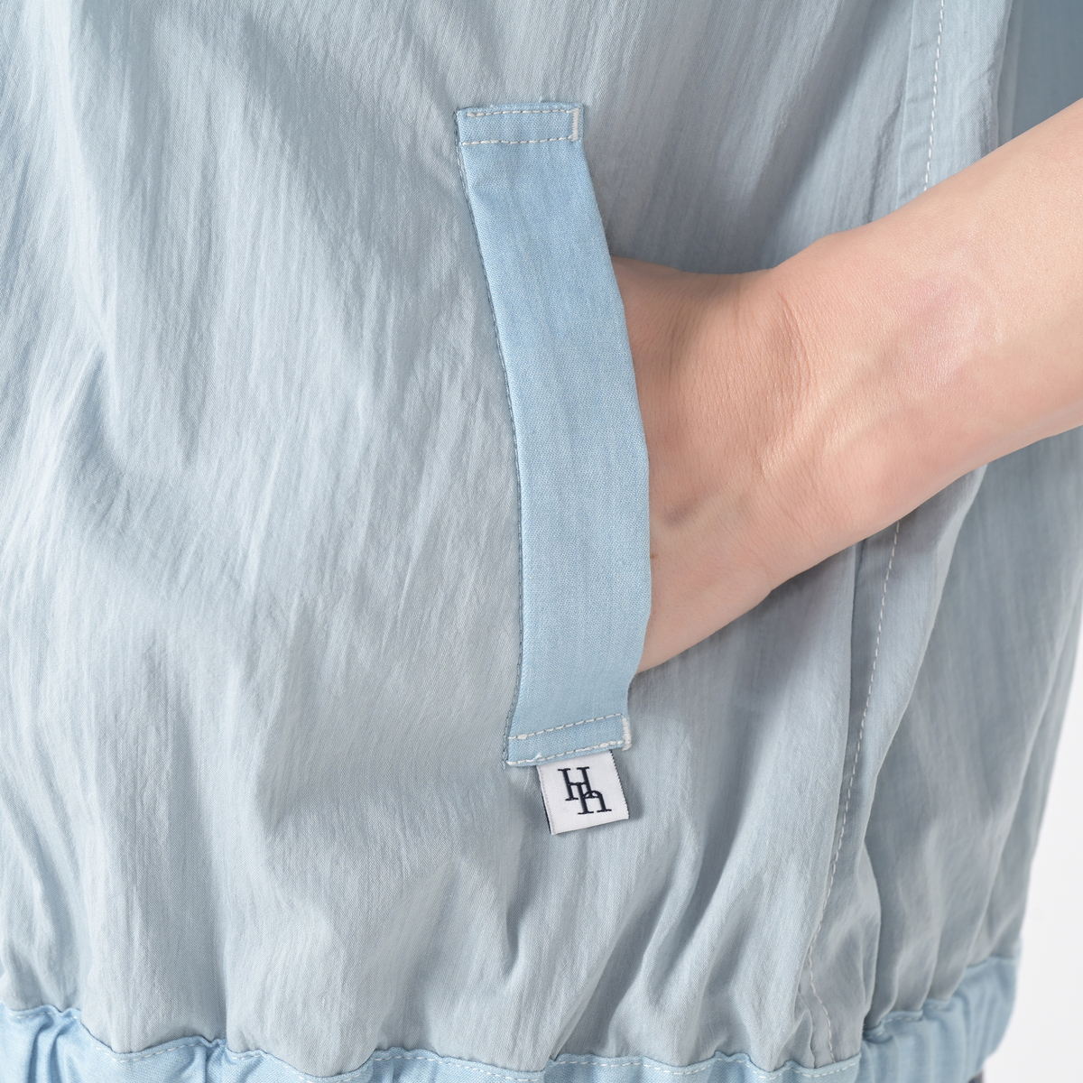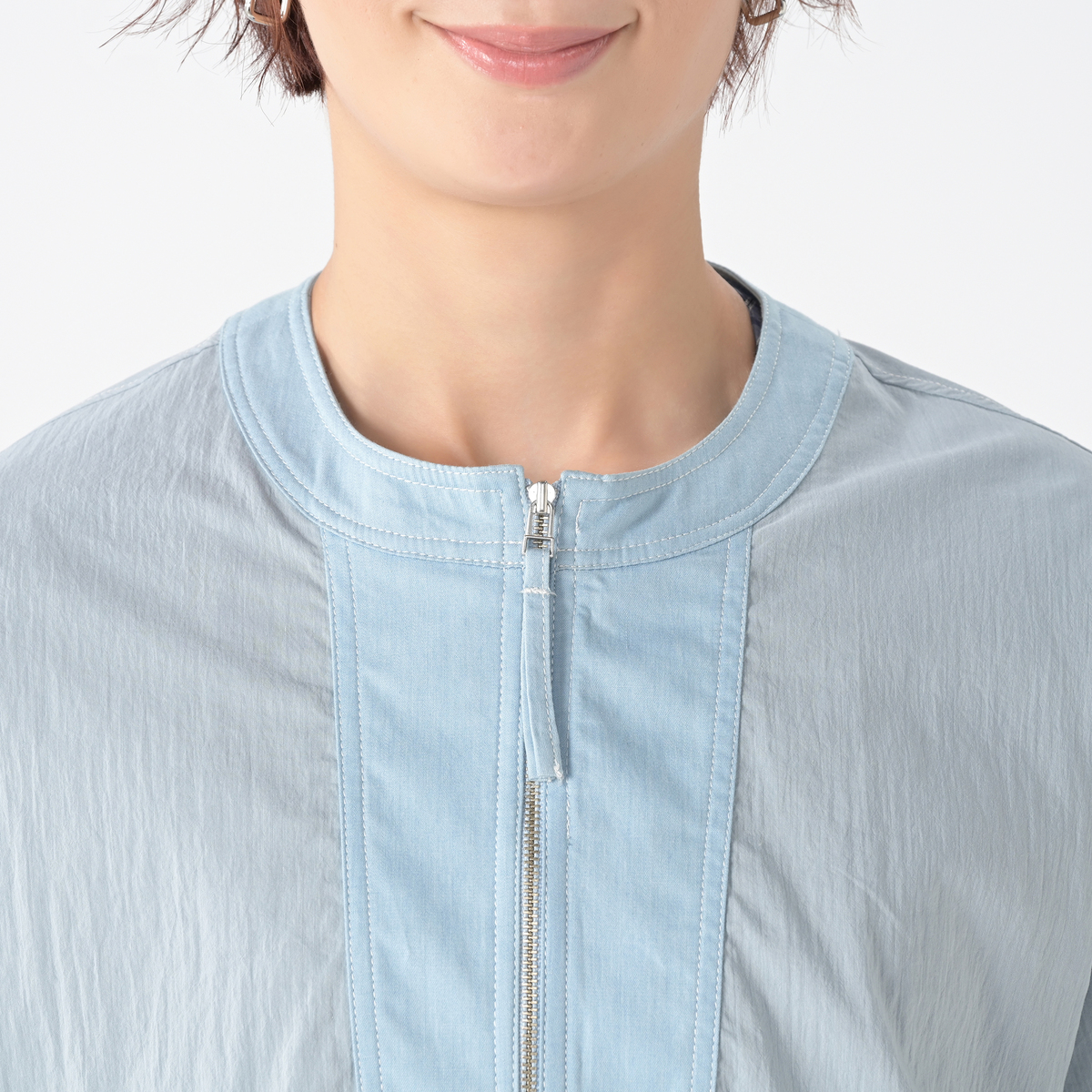 本体は綿ナイロン混の薄手素材で、別布には綿100%のライトオンスデニムを使用。軽やかに着用できる素材感です。デニム素材がカジュアルな雰囲気を演出します
