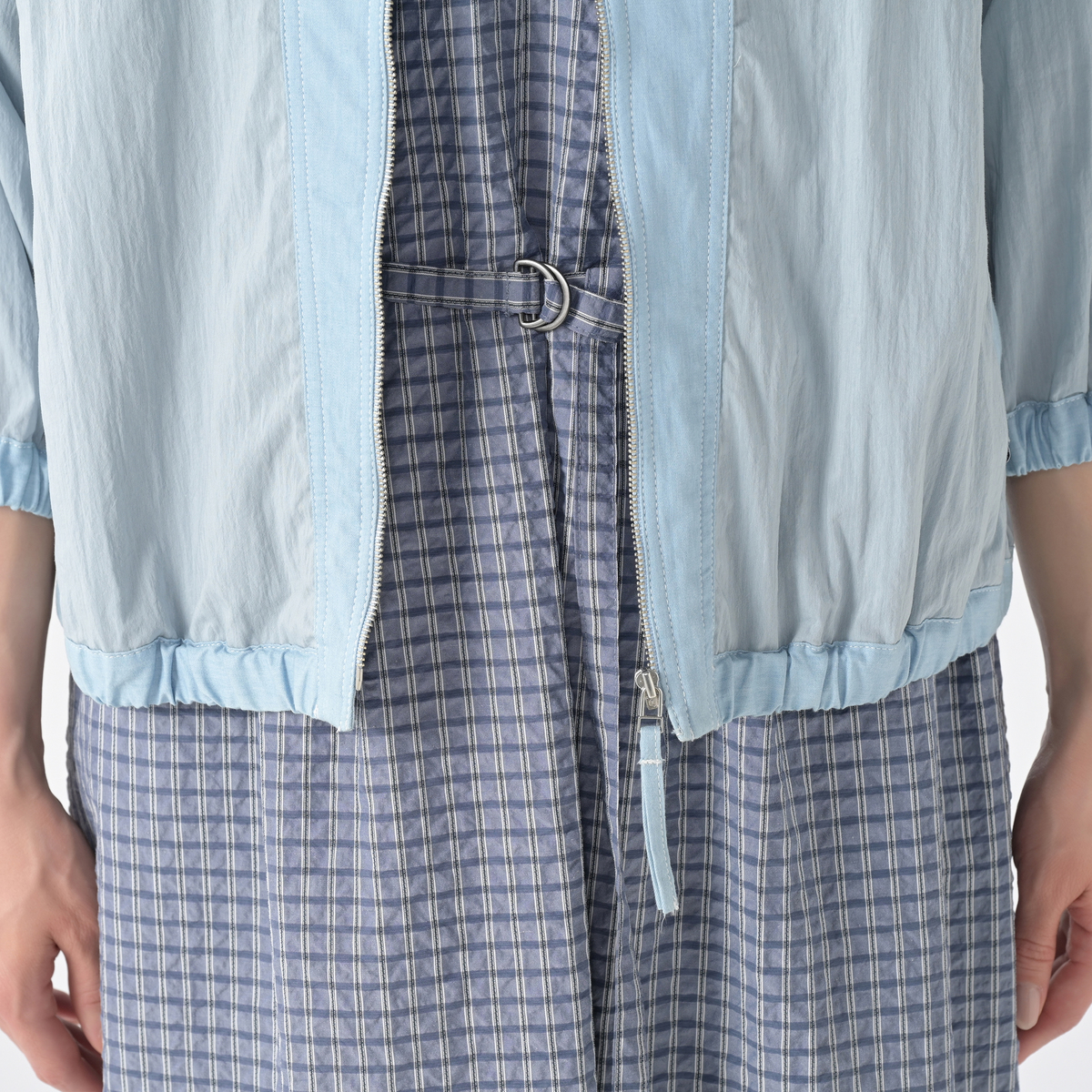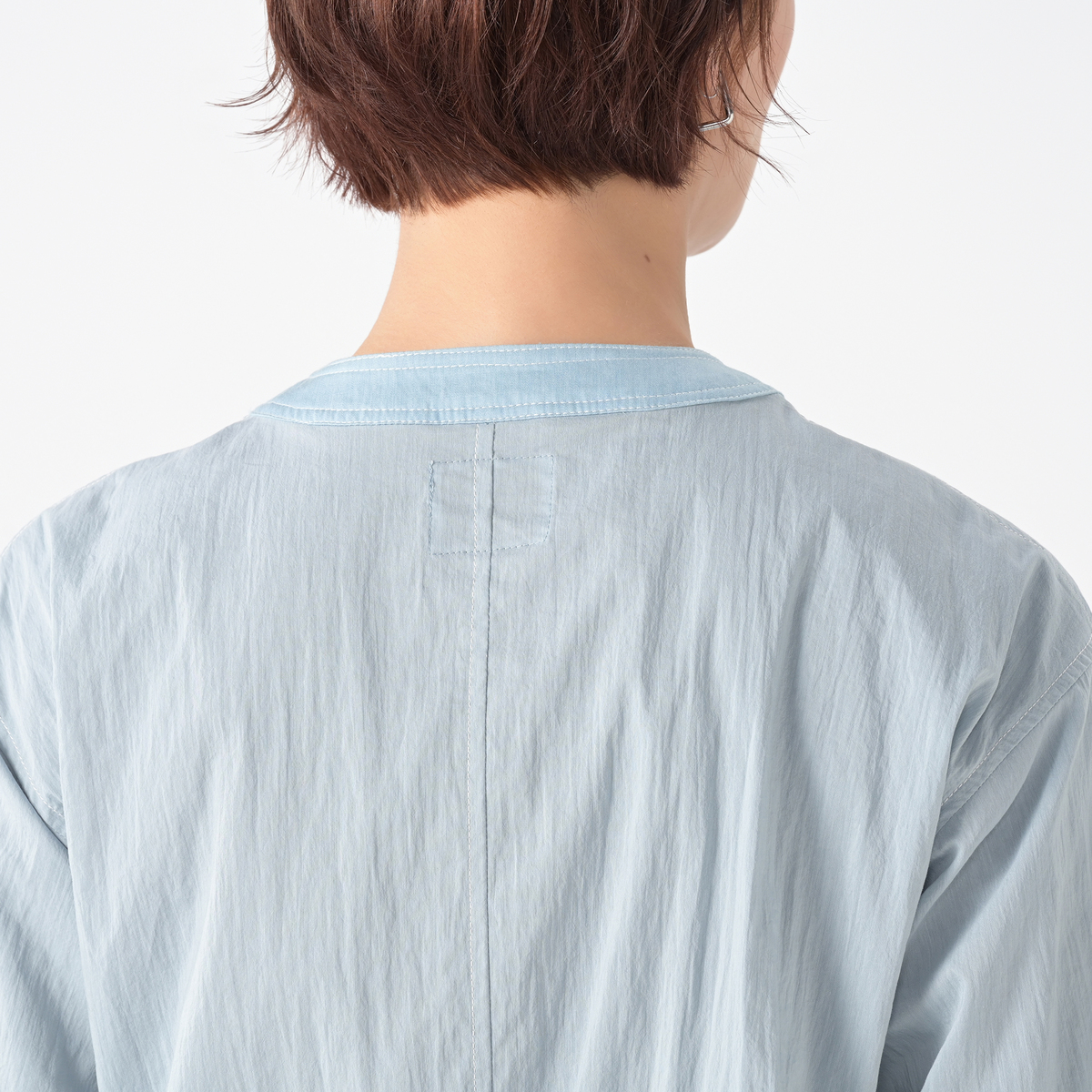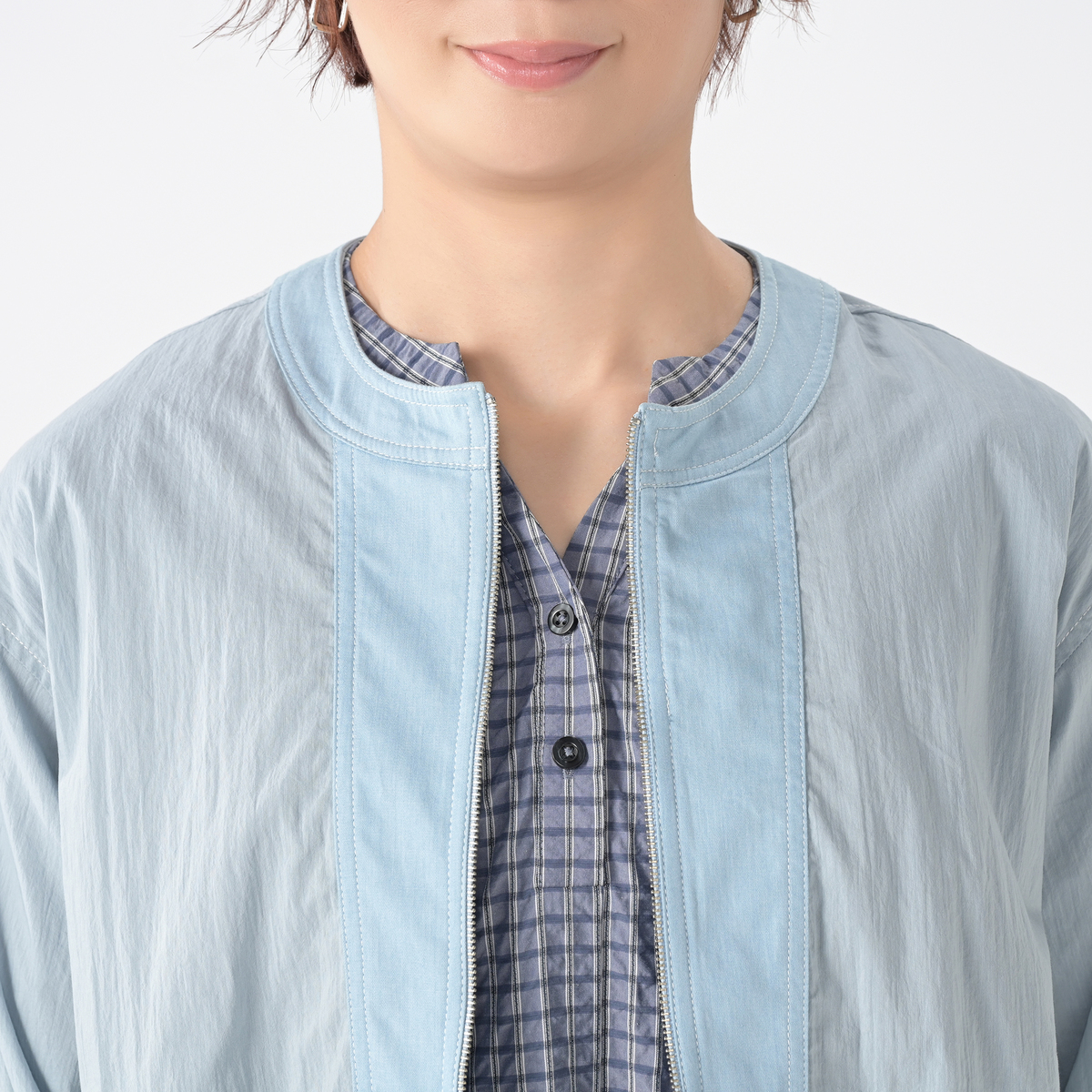 本体は綿ナイロン混の薄手素材で、別布には綿100%のライトオンスデニムを使用。軽やかに着用できる素材感です。デニム素材がカジュアルな雰囲気を演出します