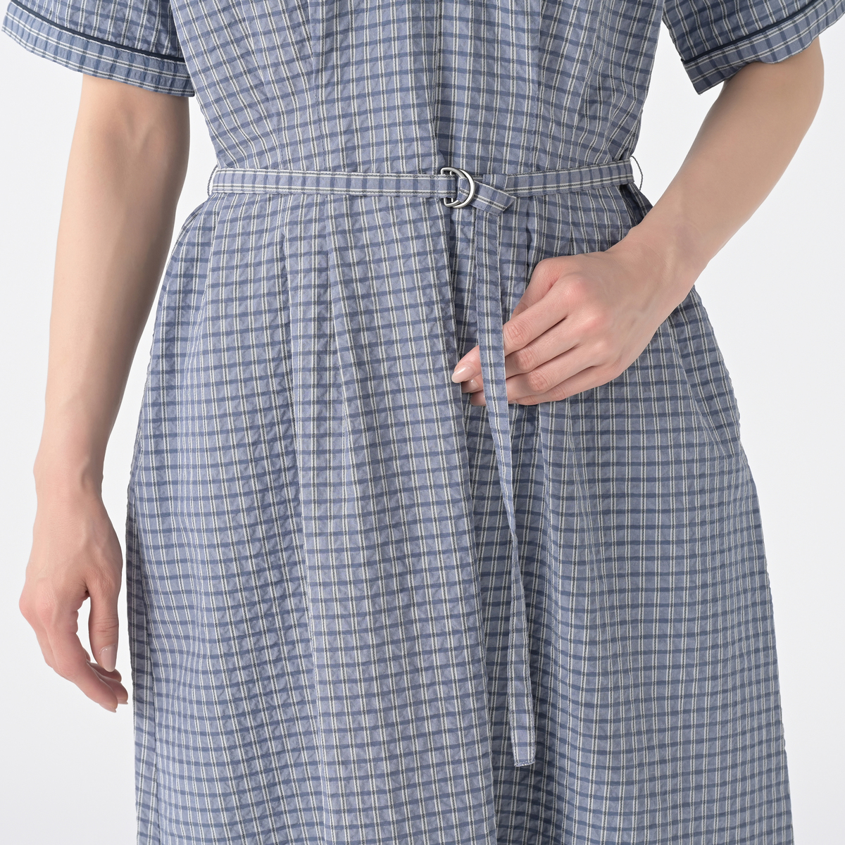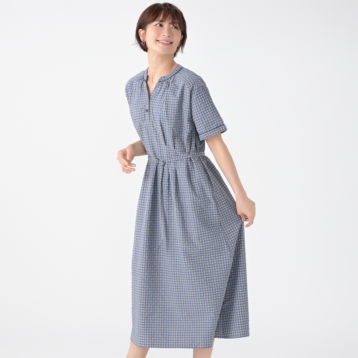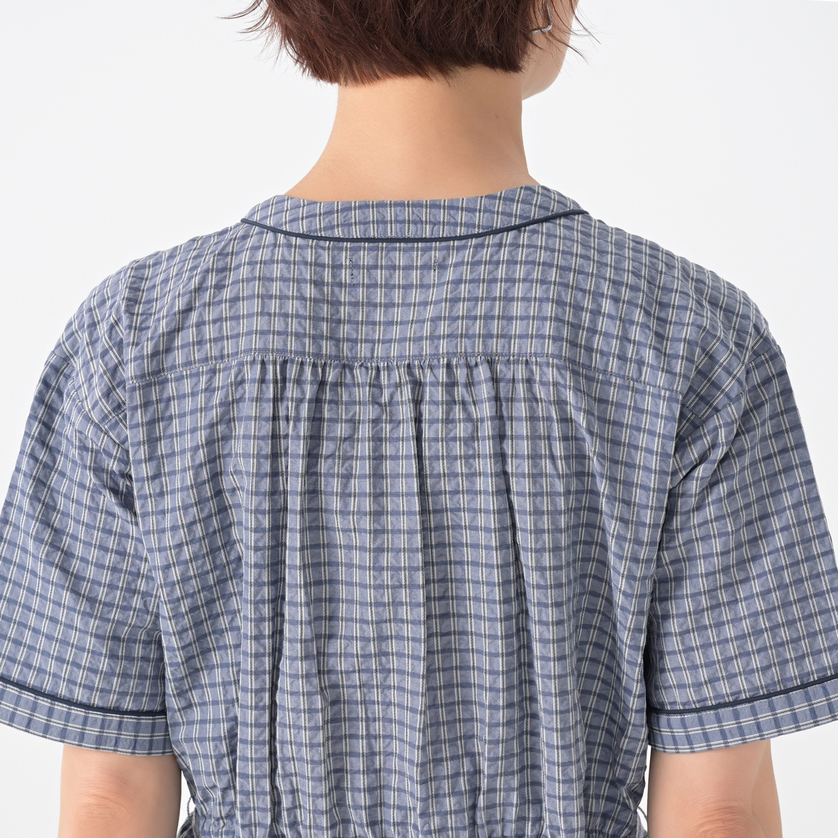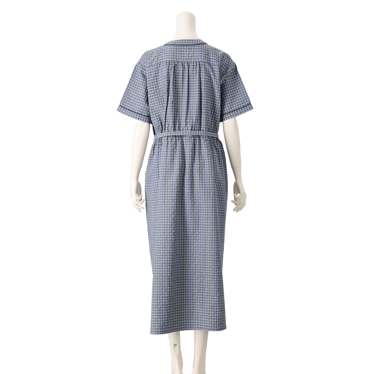 スキッパー衿のシャツワンピース。丈感、バスト共にたっぷりとしたシルエットで、上からバサッと羽織るだけでサマになる一枚です