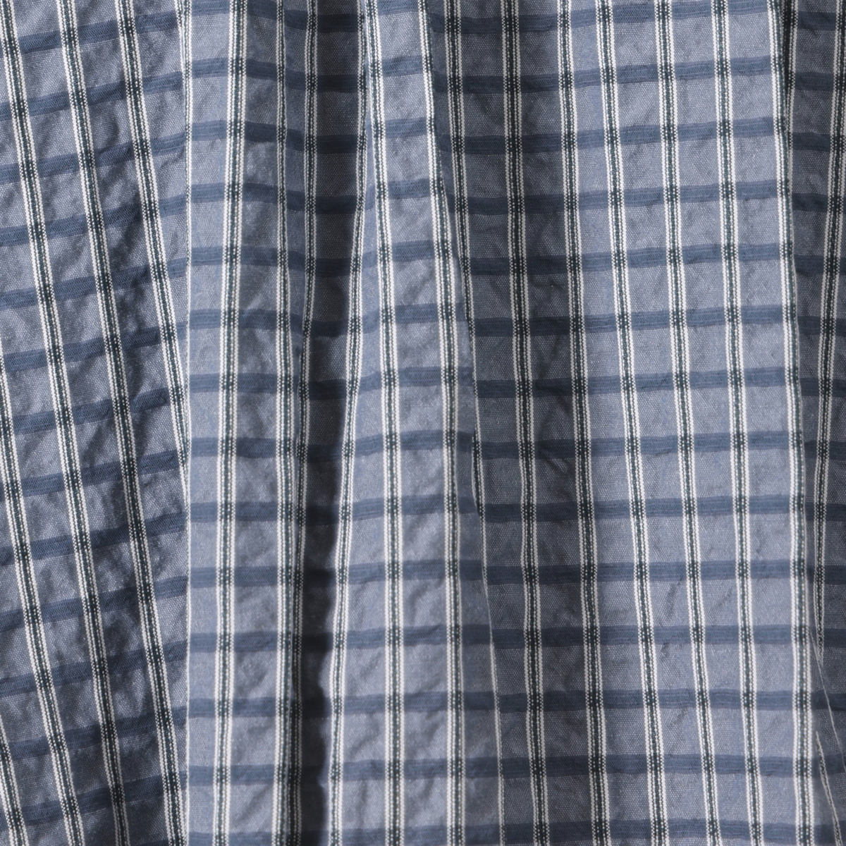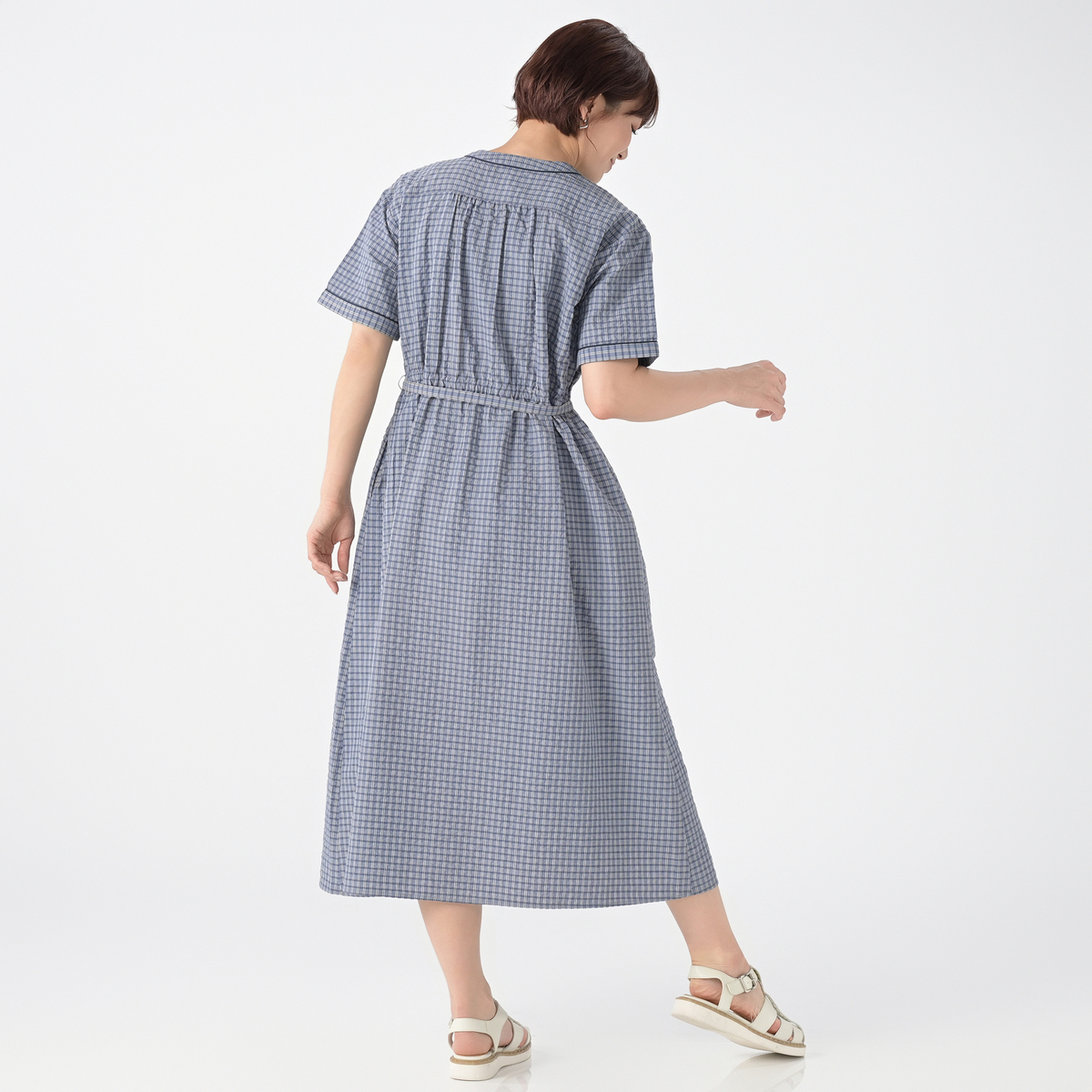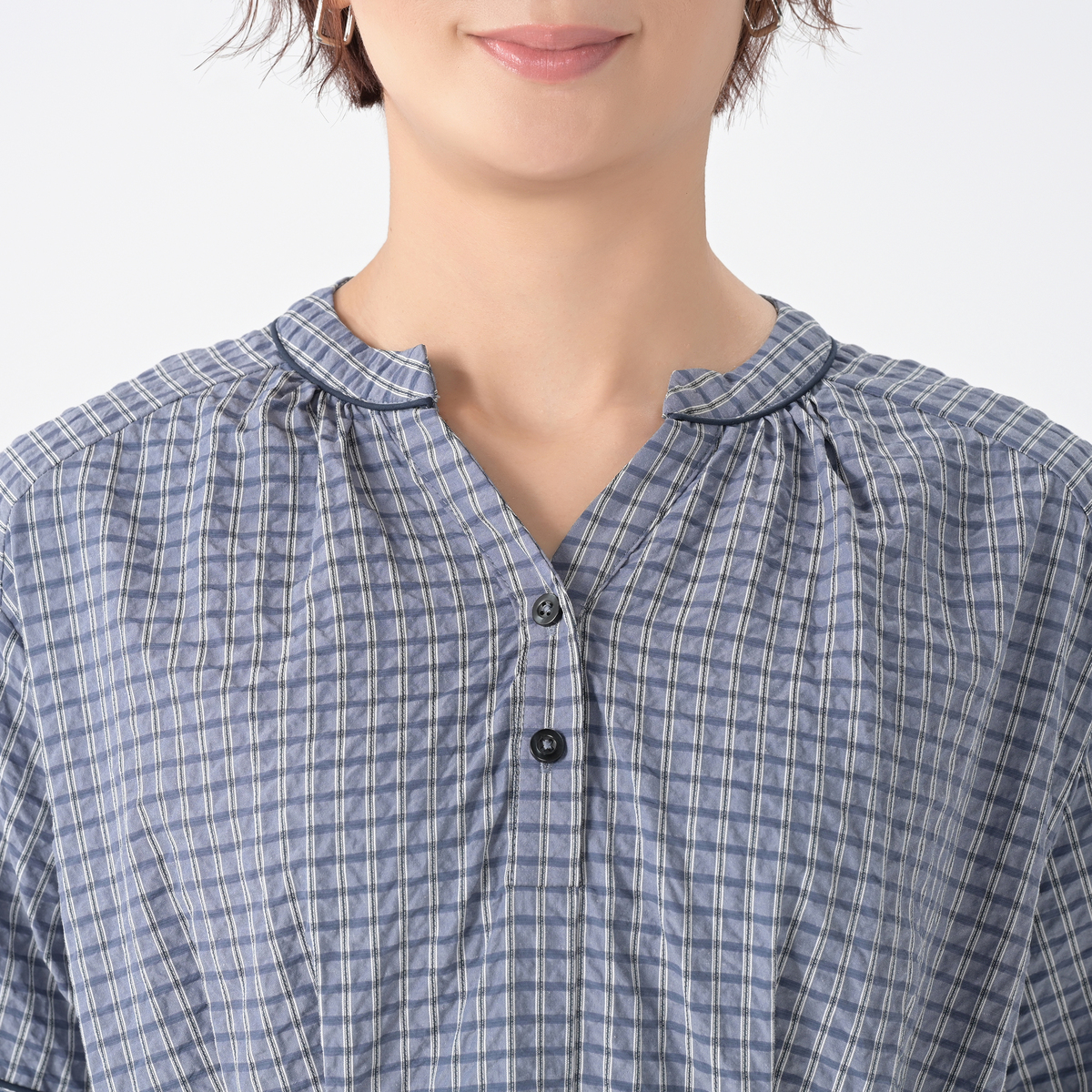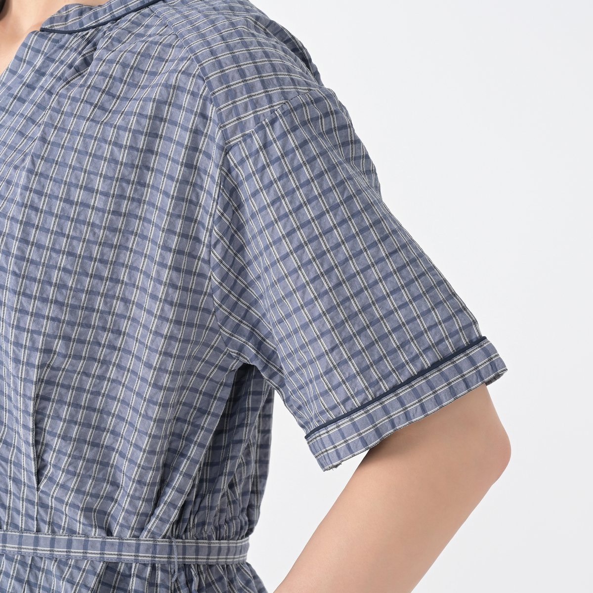 スキッパー衿のシャツワンピース。丈感、バスト共にたっぷりとしたシルエットで、上からバサッと羽織るだけでサマになる一枚です