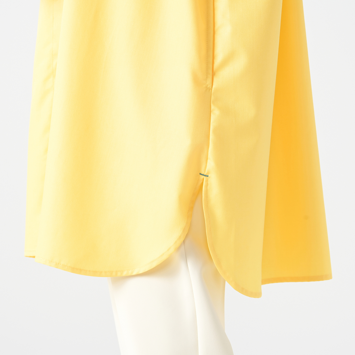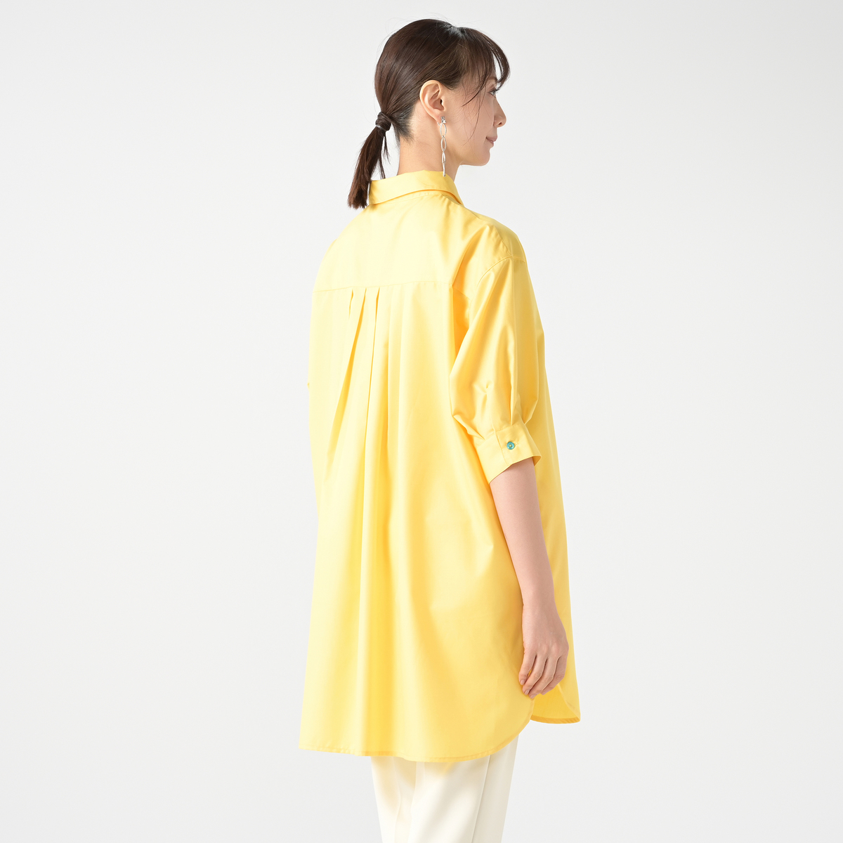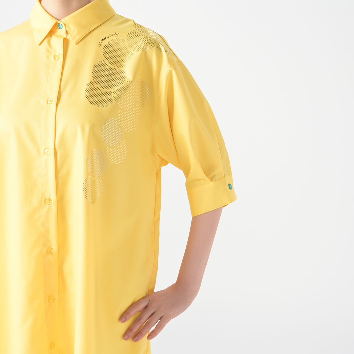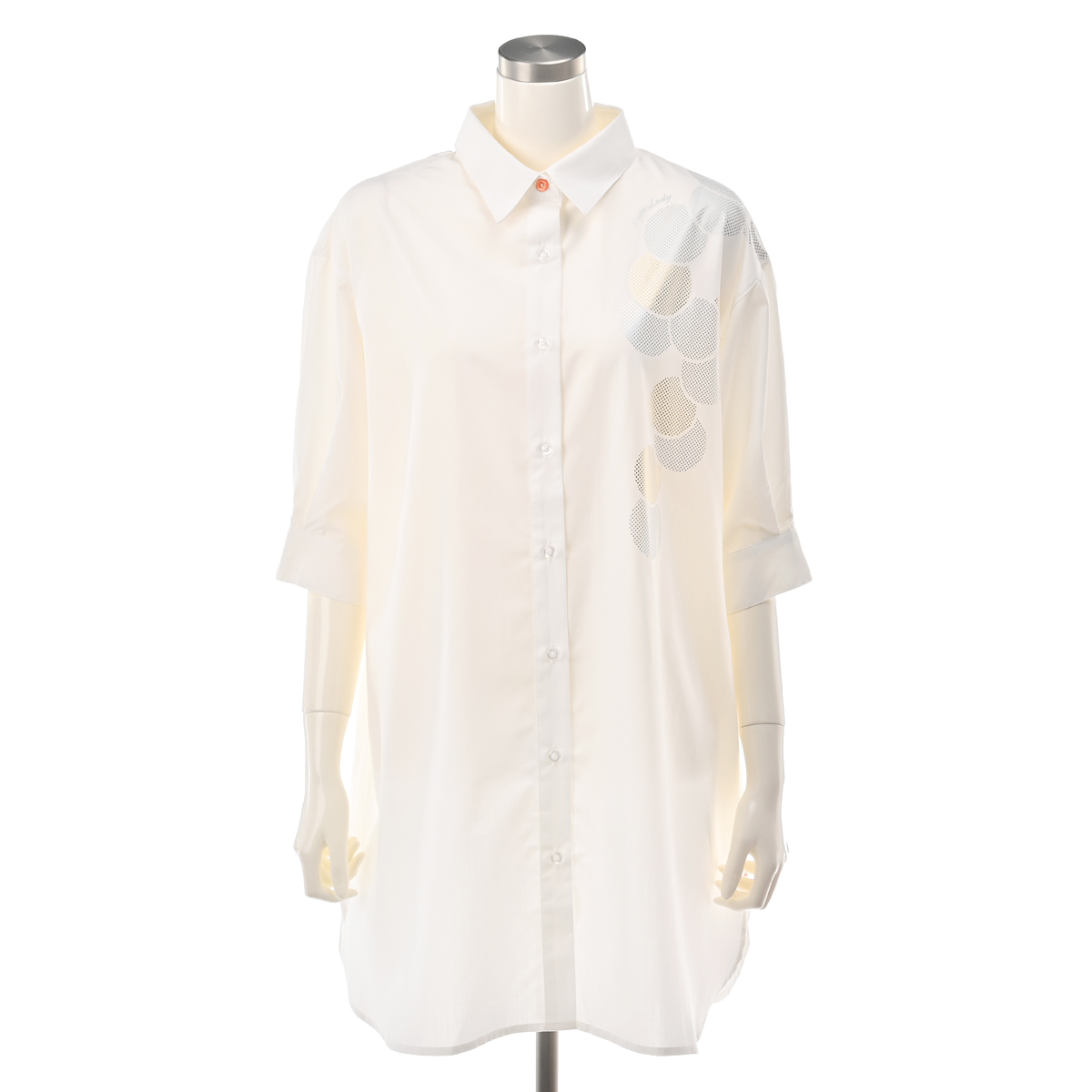 ゆったりとしたシルエットのロングシャツ。左肩からウエストにかけて、箔プリントで表現したドット柄がきらりと美しいアクセントをプラス。背中にはタックデザインを入れて、フェミニンな後ろ姿を演出しました
