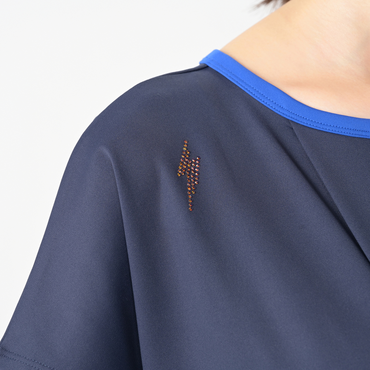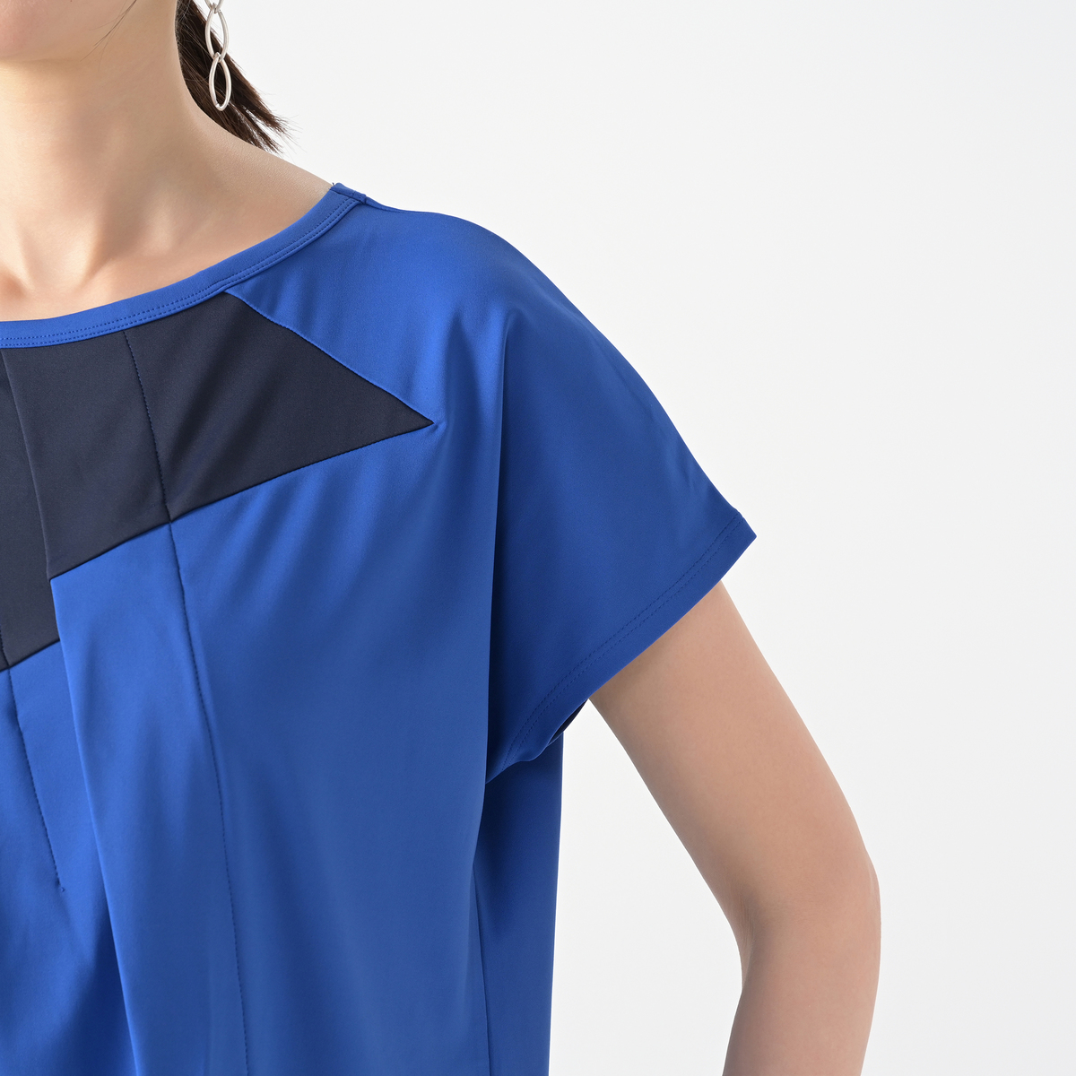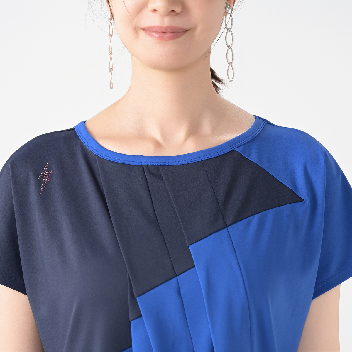 イナズマをかたどった大胆な配色切替が目を惹くプルオーバー。計算されたタックとドレープが美しいシルエットを生み出しています