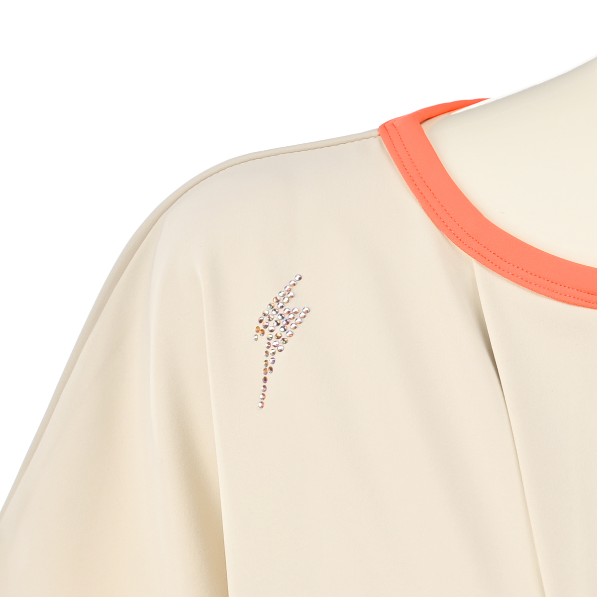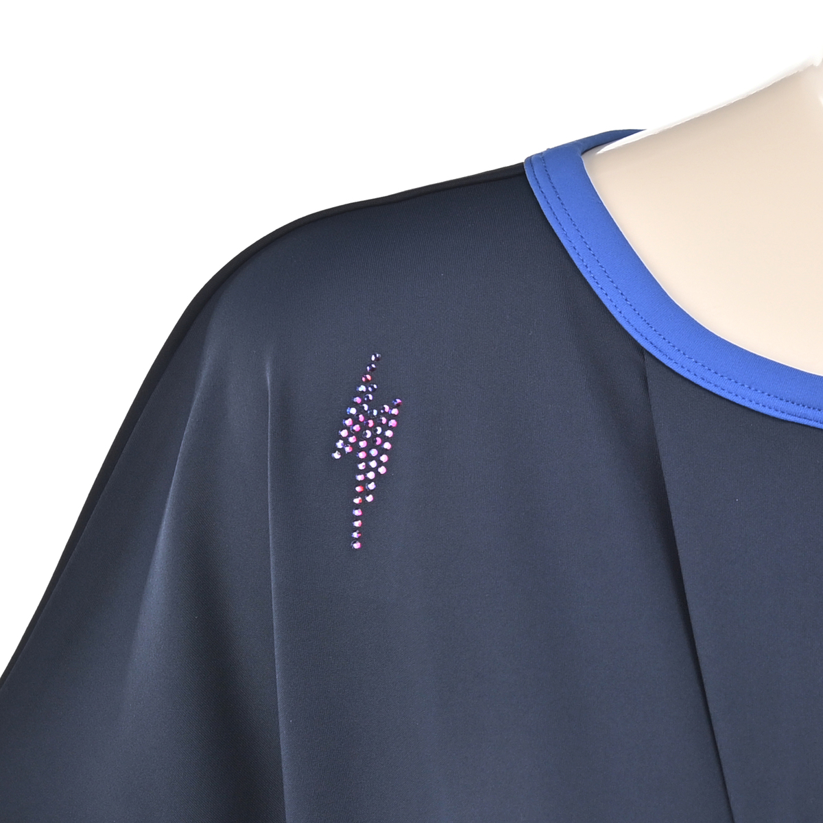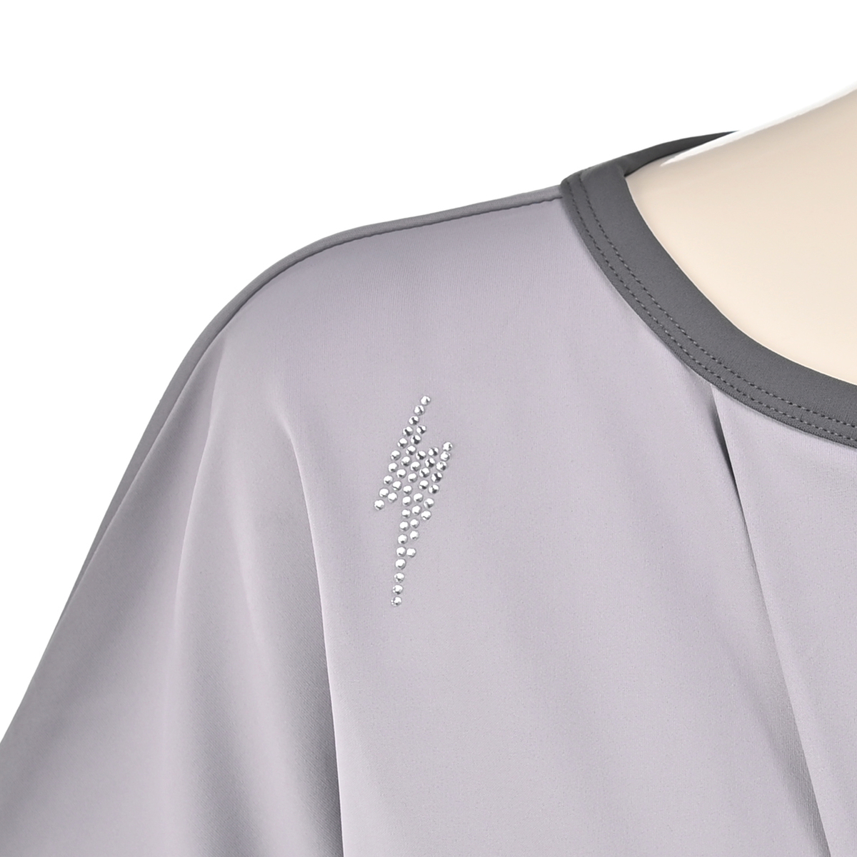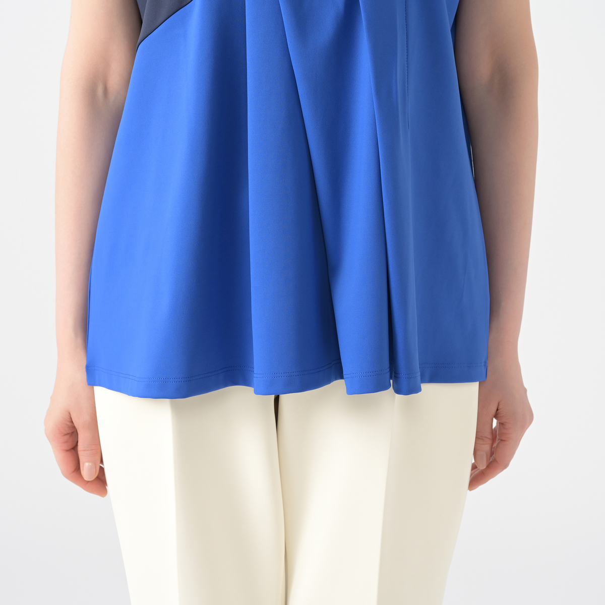 イナズマをかたどった大胆な配色切替が目を惹くプルオーバー。計算されたタックとドレープが美しいシルエットを生み出しています