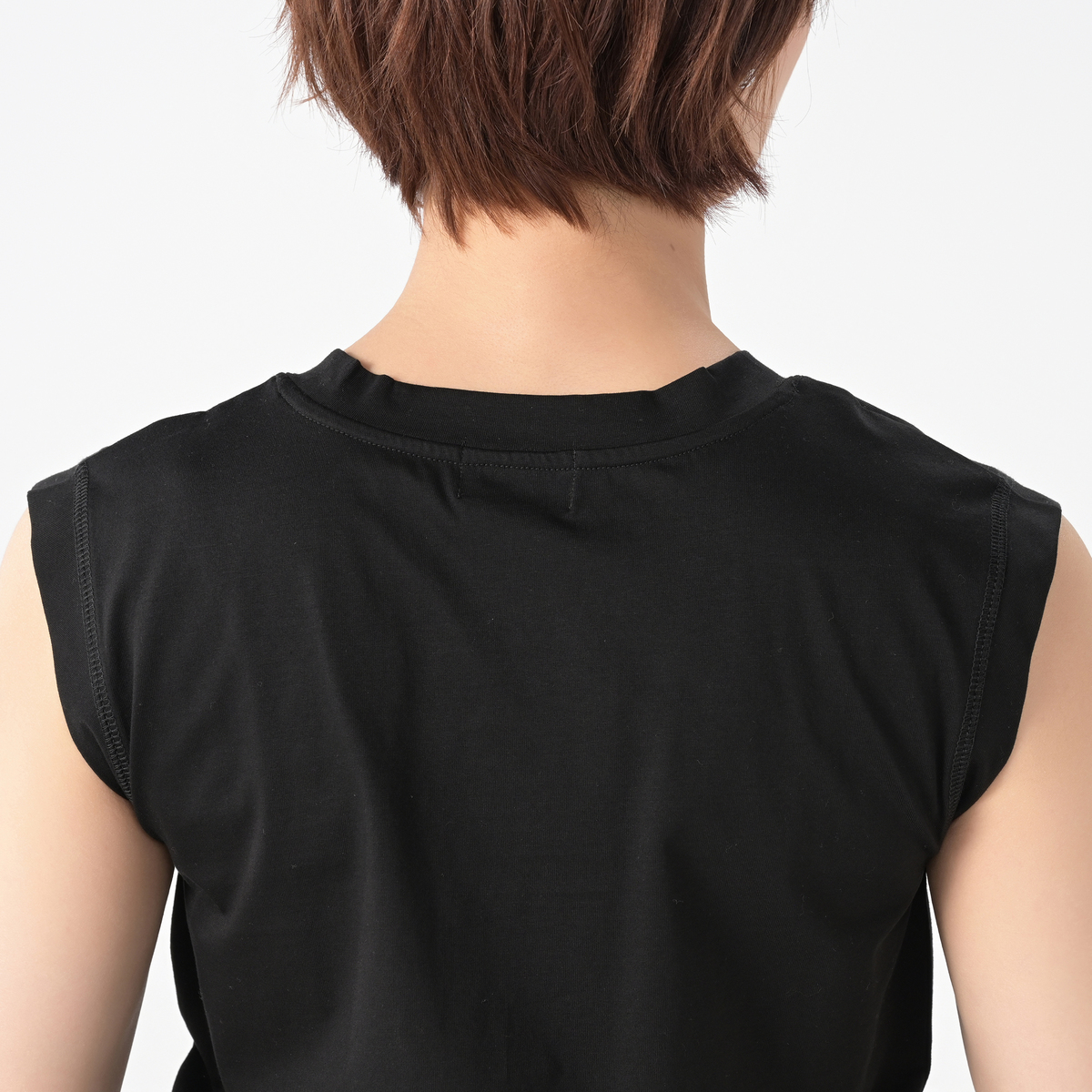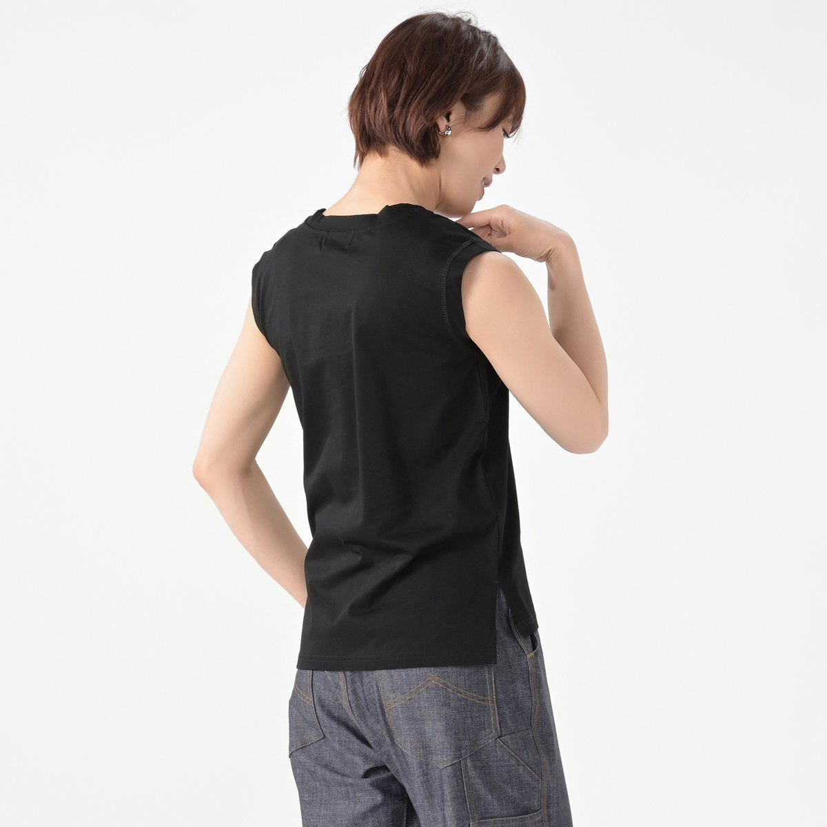 サラッとした滑らかな生地感のノースリーブシャツ。肩幅をしっかり出したデザインなので一枚着でも安心です。ジャケットやシャツ、ニットのインナーとしても活躍します。裾のお洒落なプリントネームもポイントです