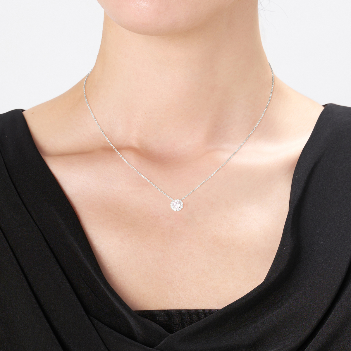 大粒のダイヤモニークピンクCZが美しい輝きを放つペンダント。メレサイズのダイヤモニーククリアCZで取り巻いた、大人っぽくゴージャスなデザインです