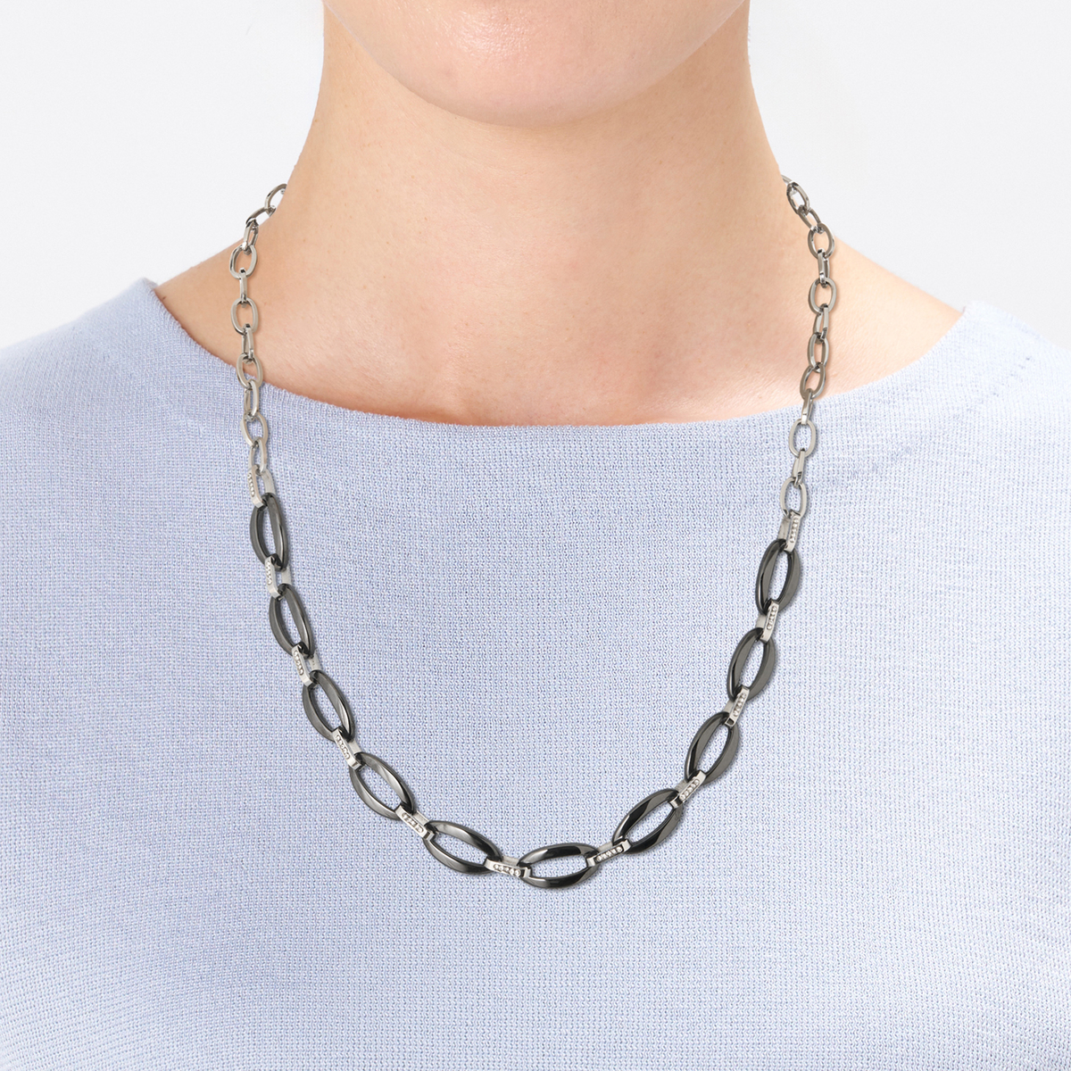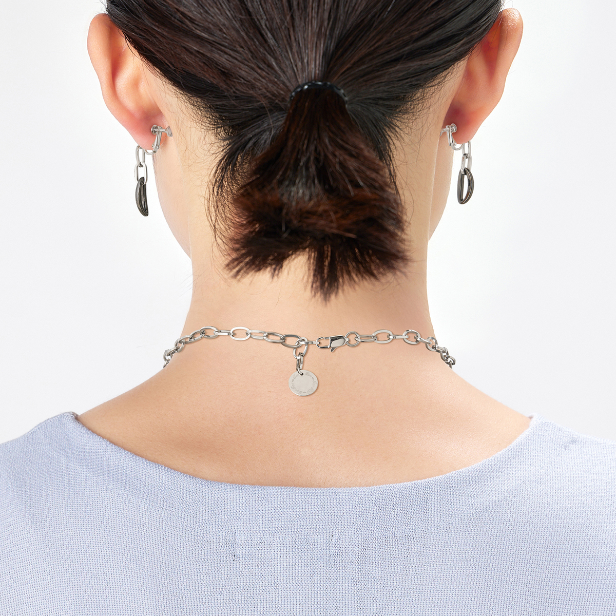 ブラックセラミックを使用したネックレスとイヤリングまたはピアスのセット。トレンドのチェーン風のデザインがお顔周りをスタイリッシュに演出します