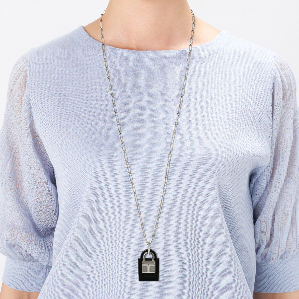 ハンドバッグ型にカットした牛の角と、お揃いの金属製チャームを組合せたチェーンネックレス。洗練されたデザインで装いのポイントになってくれます