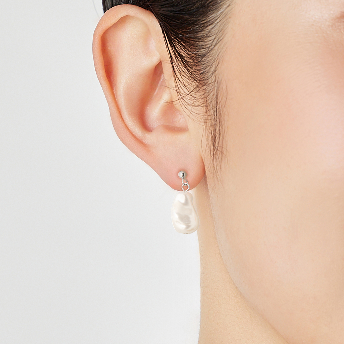 ステーション状に連ねたロングネックレスと、スイングタイプのイヤリングまたはピアスのセット。バロック風のフェイクパールを使用しました。ネックレスは、大小のフェイクパールと華奢なチェーンの組合せが上品な雰囲気を演出。非常に軽い着用感で、デイリーユースにもおすすめです