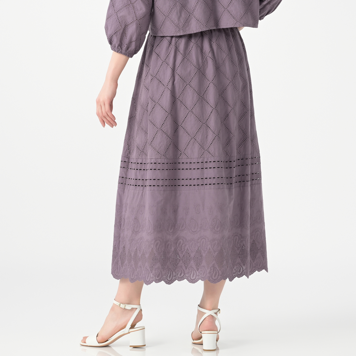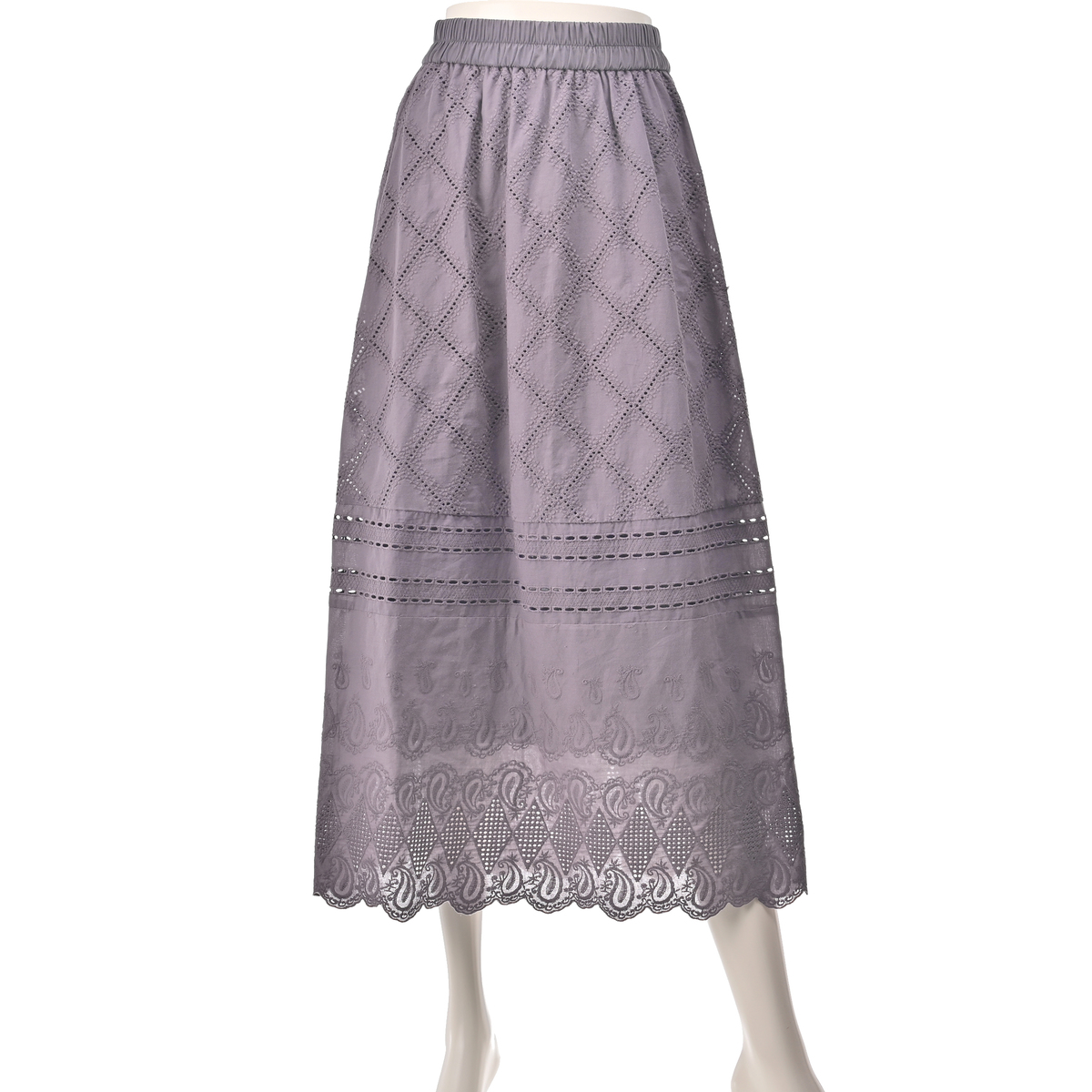 ダイヤ柄、ボーダー柄、ペイズリー柄のカットワーク刺繍生地を贅沢に使用したスカート。ボドレーの裏地付きです。裾のスカラップ部分が、クラフト感を添えます