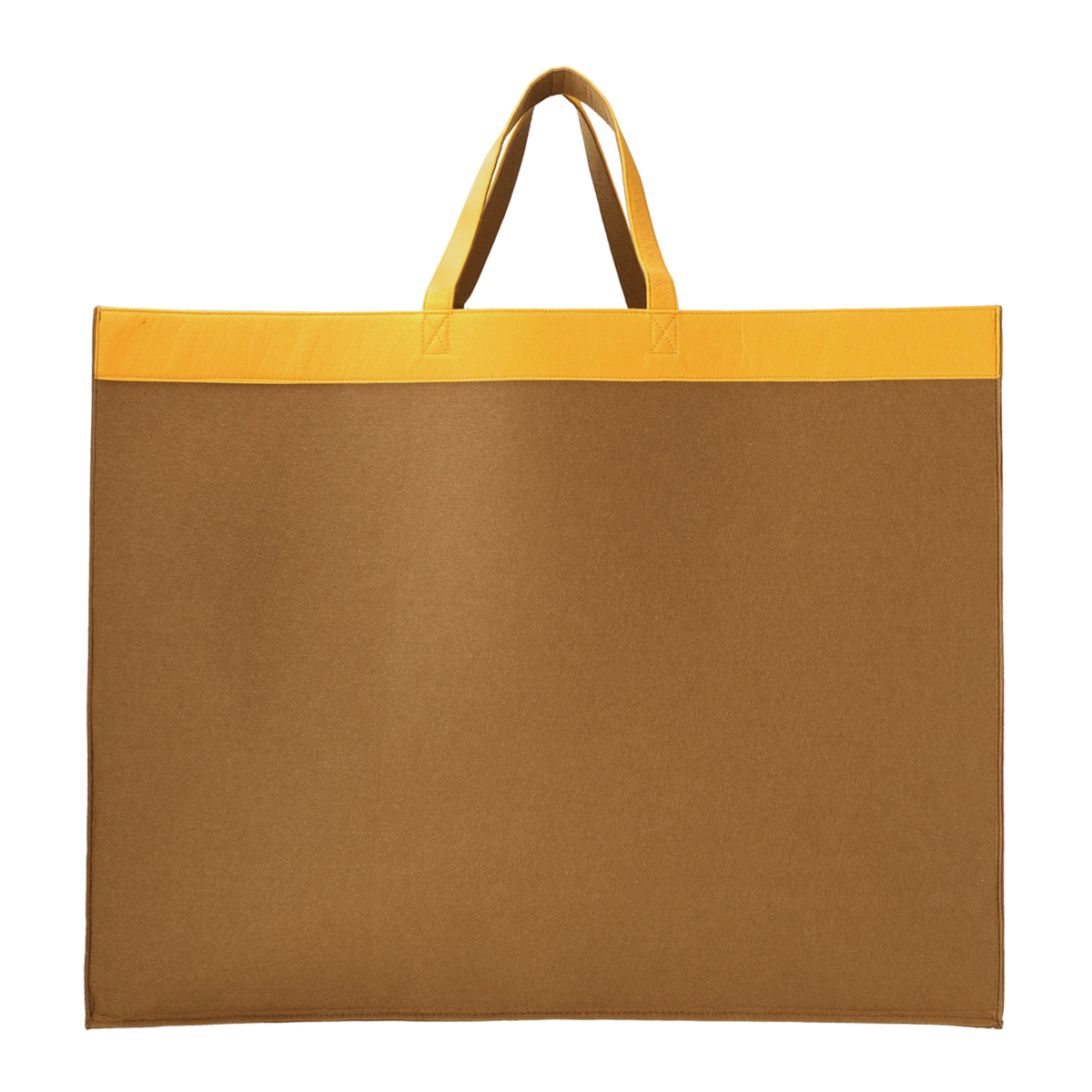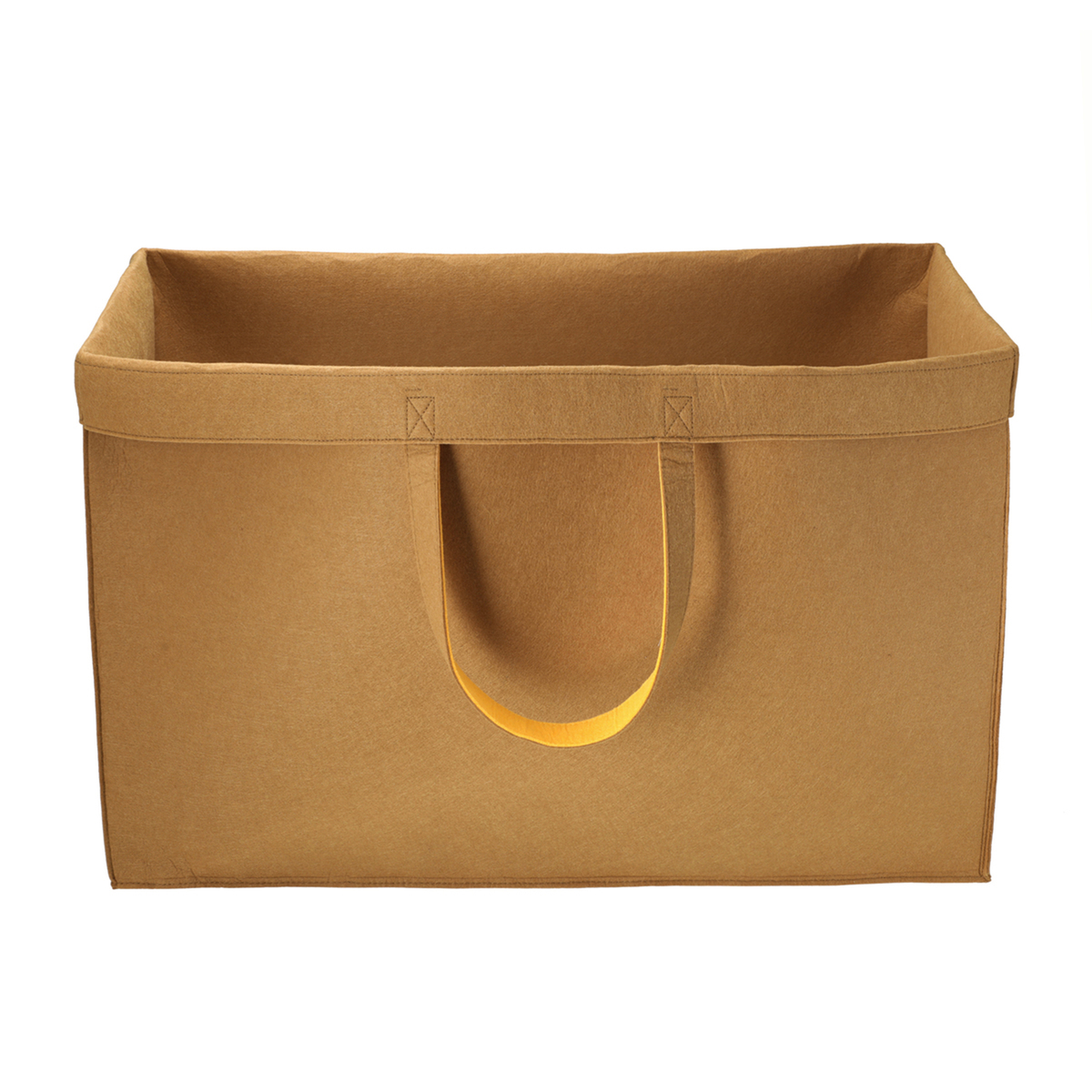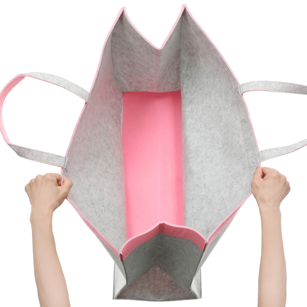 柔らかいフェルト素材の収納バッグ。持ち手付きで持ち運びも可能。開口部、把手、底部分はおしゃれなバイカラーに。使用しない時は折りたたんでコンパクトになり、隙間などに収納できます