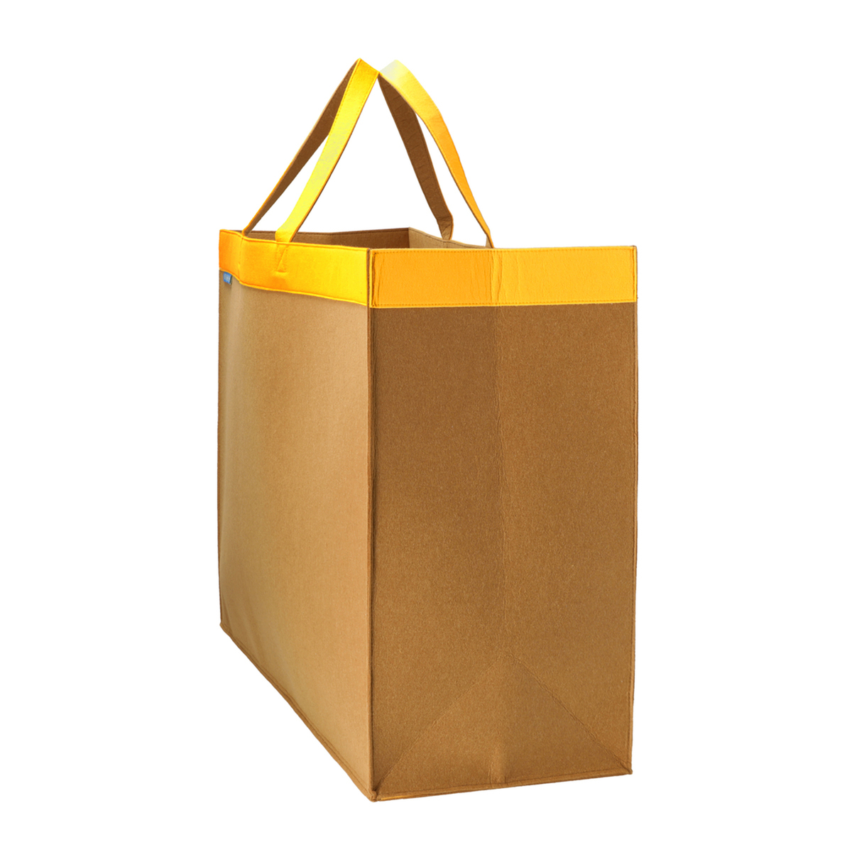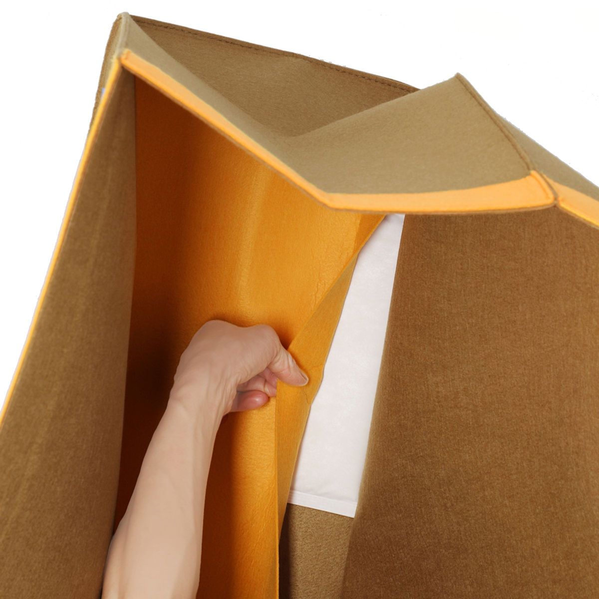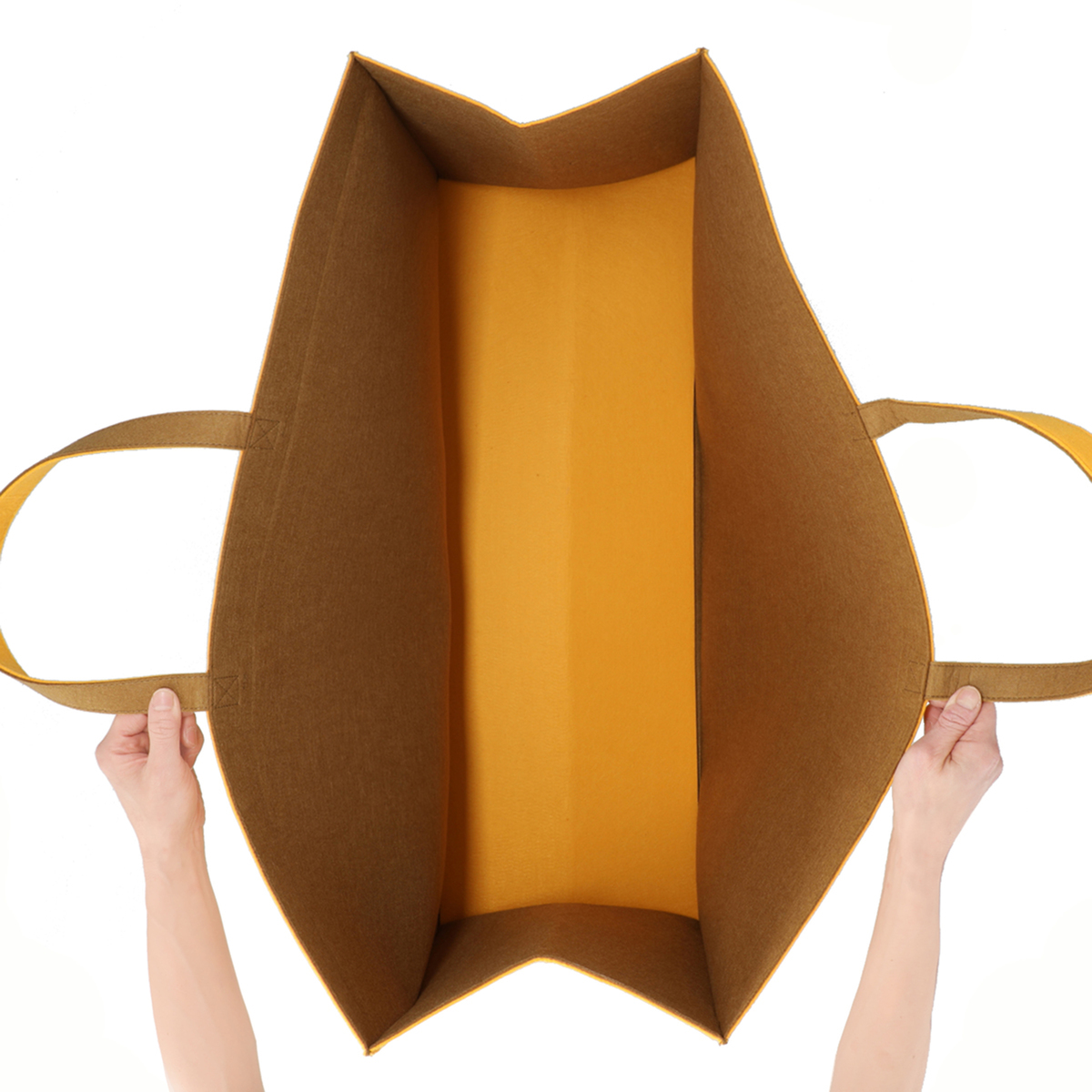 柔らかいフェルト素材の収納バッグ。持ち手付きで持ち運びも可能。開口部、把手、底部分はおしゃれなバイカラーに。使用しない時は折りたたんでコンパクトになり、隙間などに収納できます