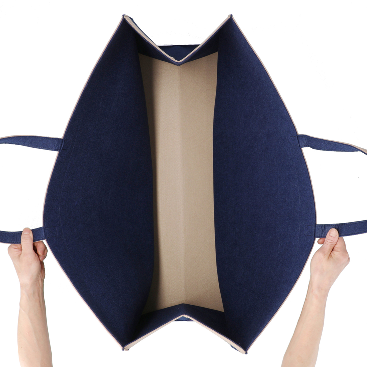 厚みが約2mmあるのでバッグだけで自立して置きやすく。開口部の差し色部分を外側へ折り返すと把手も邪魔にならず収納もスムーズ。同シリーズのサイズ違いで使い分けすれば、おしゃれでキレイな収納ができます