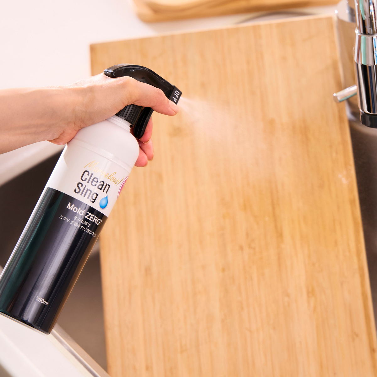 [液性] アルカリ性 [用途] 水廻り:浴室タイル目地、洗面台、排水口、ゴムパッキン、トイレ廻り等 室内:壁紙(*色付きは確認が必要)、コーキング、押入れ、すのこ、家具、その他木材 外部:木材柱、ウッドデッキ、ベンチ、木製ドア、外壁、コンクリート材等 ※木材は、塗装等の塗膜がある場合、カビ取り効果が落ちます [適用面積] 1平方メートル当り約10回スプレー [使用期限] 未開封の場合、製造より1年 [使用方法] <使用する前の準備> ・Mold ZEROの使用箇所が濡れている場合、水分をタオルで拭き取る等、しっかり乾燥させた状態にします ・使用環境に応じてゴム手袋、マスク、眼鏡等の保護具を着用して、ご使用願います ・室内で使用する場合は、窓を開け換気をよくして下さい。換気扇を回したり、ドアや窓を2カ所以上開けると、換気の効率が上がります <使用方法> ・キャップ(安全キャップ)を押しながら、左に回し開け、付属されているスプレーを取り付けて下さい ・スプレーロックを解除し、20〜30cmほど離れた位置から塗布して下さい ・塗布後、カビが消えるのが確認出来ましたら、必ず水洗いもしくは、水拭きをして下さい ・ゴムパッキンや洗面台のシリコン目地などのしつこいカビは、噴霧後にラップで覆うと効果的です ■取り扱い説明を充分にご確認の上、ご使用下さい 【日本製】 [注意事項] 【使用できない物、場所】 1.繊維で出来ている物(例:衣類等) 2.紙で出来ている物 3.ステンレス以外の金属で出来ている物 ※モールドゼロ使用中にステンレス以外の金属に万が一かかった場合は、直ちに十分な水で洗い流して下さい 4.金属を含む物(例:鉱石) 5.塗装やワックス、コーティングされた木材 6.ビニールクロス以外の壁紙 7.鏡 8.冷蔵庫の中への直接噴霧 ※冷蔵庫のゴムパッキンには、刷毛などでご使用下さい。また、取り外し可能な棚板や仕切り版にはご使用いただけます ※電化製品の機械部分や金属部品には使用及びかからない様にして下さい ※電化製品のプラスチック部分に使用の際は、直接噴霧でなく、刷毛などでご使用下さい 9.人工大理石 10.漆喰の壁 ※事前に見えない部分で変色の有無を確認して下さい ※他の液体と混合しないで下さい ※心臓病・呼吸器疾患のある方、体調のすぐれない方は使用しないで下さい ※まぜるな危険/塩素系 ・酸性タイプの製品と一緒に使う(まぜる)と有毒なガスが出て危険 ・必ず換気を良くして使用する ・液が目に入ったら、すぐ水で洗う ・子供の手にふれないようにする ※繊維、金属(金属メッキも含む)には使用しないで下さい ※事前に見えない部分で変色の有無を確認して下さい ※木材は、カビの部分だけでなく全体的に塗るとムラを防げます ※衣服に付着すると変色することがありますので、ご注意下さい ※一度に大量に使ったり、続けて長時間使用しないで下さい ※目より高い箇所に使用する場合、保護具を付けて刷毛などを使用し、液がたれないように注意して下さい ※外傷がある場合、肌の弱い方や不安がある方は、保護具を着用するようにして下さい ※皮膚に付いたり、目に入った場合は直ちにきれいな水で十分に洗い、異常がある場合は、医師に相談して下さい ※風がある日は外での使用には十分注意して下さい ※飲まないで下さい。もし、飲んでしまった場合は直ちに医師に相談して下さい ※他の液体と混合しないで下さい。酸性タイプの製品や食酢、アルコール等と混ざると有毒ガスが発生して危険です。Mold ZERO使用後も、必ず洗い流してから次の洗剤を使うようにして下さい ※誤って使用される恐れがある為、本来の容器で保管して下さい ※使用後は必ず蓋を閉め、お子さまの手の届かない所に保管して下さい ※風通しの良い場所に保管し、直射日光、 高温の場所を避けて下さい ※Mold ZERO専用スプレーを使用して下さい ※スプレーの取り外しの際は、液はね等に注意して下さい ※パッキンやコーキング等の奥まで入り込んだカビは落し難くなるので、早目に手入れして下さい ※心臓病・呼吸器疾患のある方、体調のすぐれない方は使用しないで下さい ※品質向上のため、商品の仕様が変更になる事も御座います ※特殊木材(不燃木材等)は使用できません [成分] 次亜塩素酸塩、水酸化ナトリウム(0.2%)、界面活性剤(アルキルアミンオキシド)