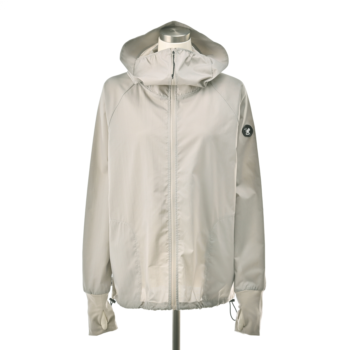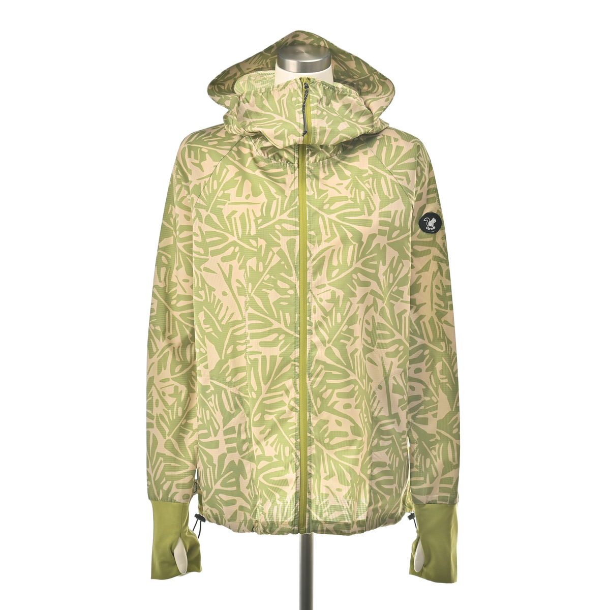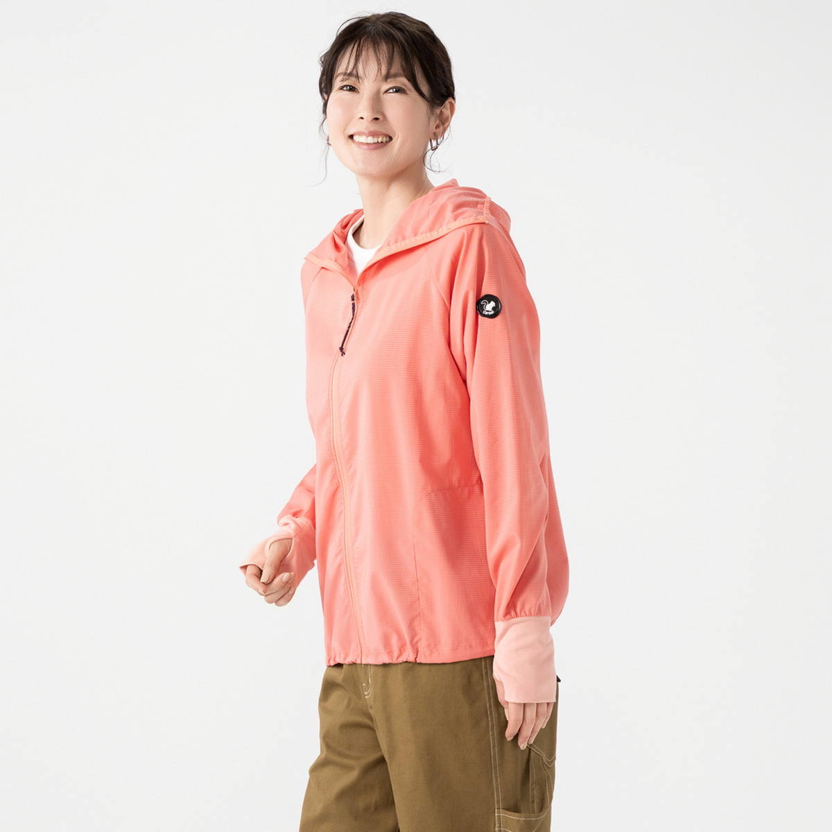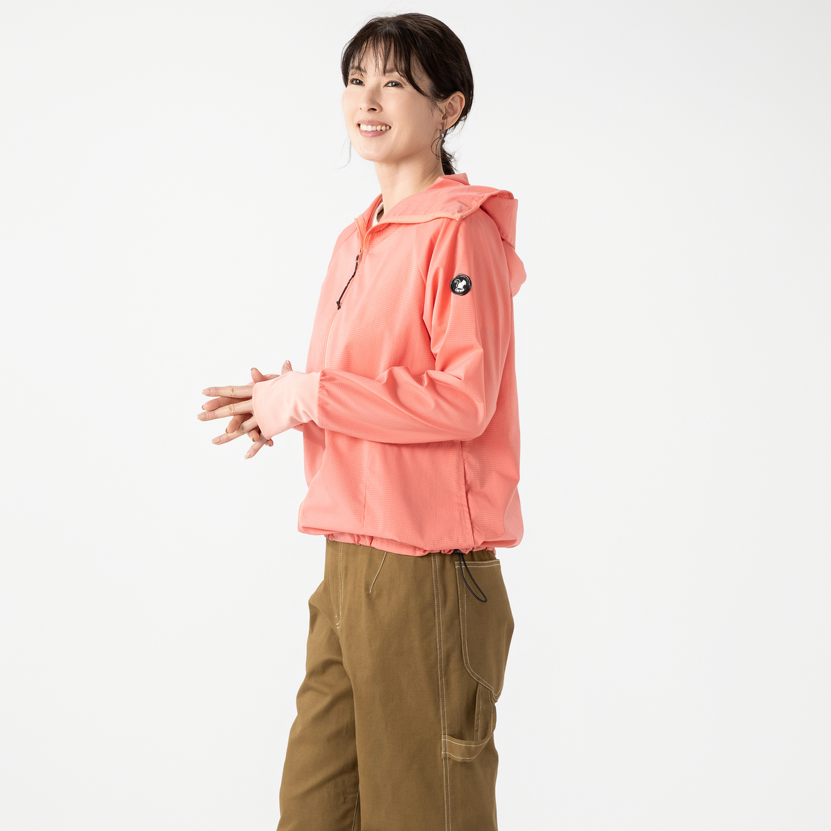 動きやすいラグランスリーブでフロントはファスナー開き。お顔周りをマスクのように覆う前衿の高さやフードに付けた大きめのツバ、袖口には手の甲を覆う指穴付きに。虫の接触や強い日差しから身を守ります。裾は丸ゴムとアジャスターで調節が可能です。両脇にはポケットも付いています