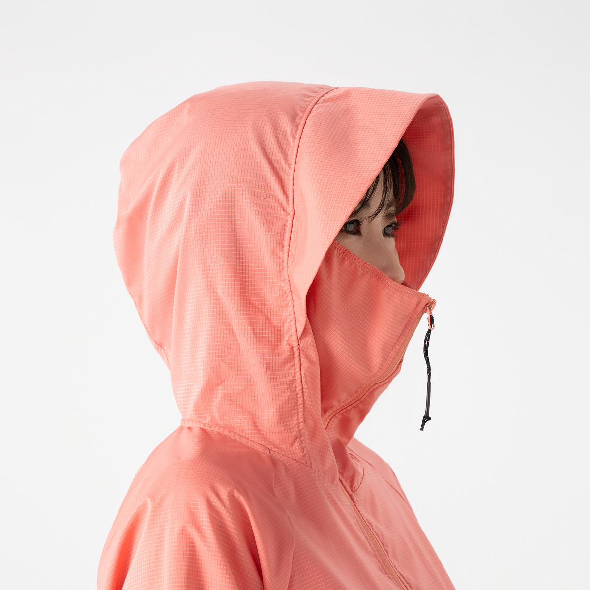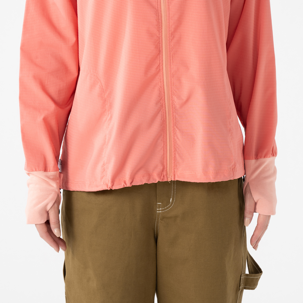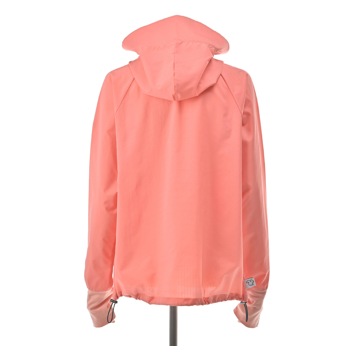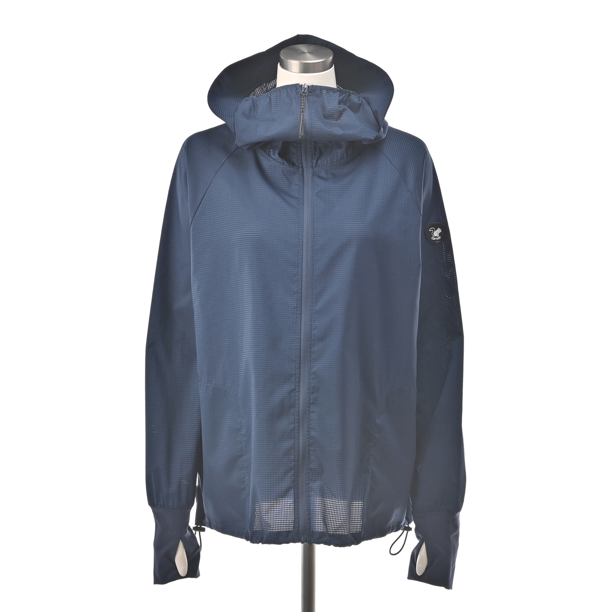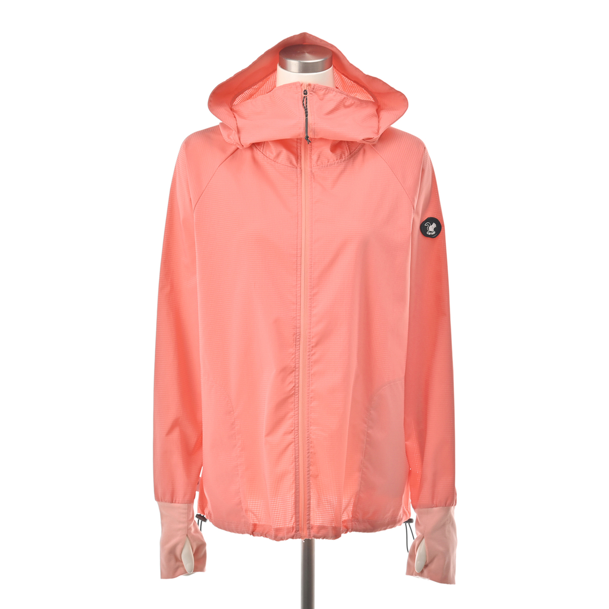 動きやすいラグランスリーブでフロントはファスナー開き。お顔周りをマスクのように覆う前衿の高さやフードに付けた大きめのツバ、袖口には手の甲を覆う指穴付きに。虫の接触や強い日差しから身を守ります。裾は丸ゴムとアジャスターで調節が可能です。両脇にはポケットも付いています