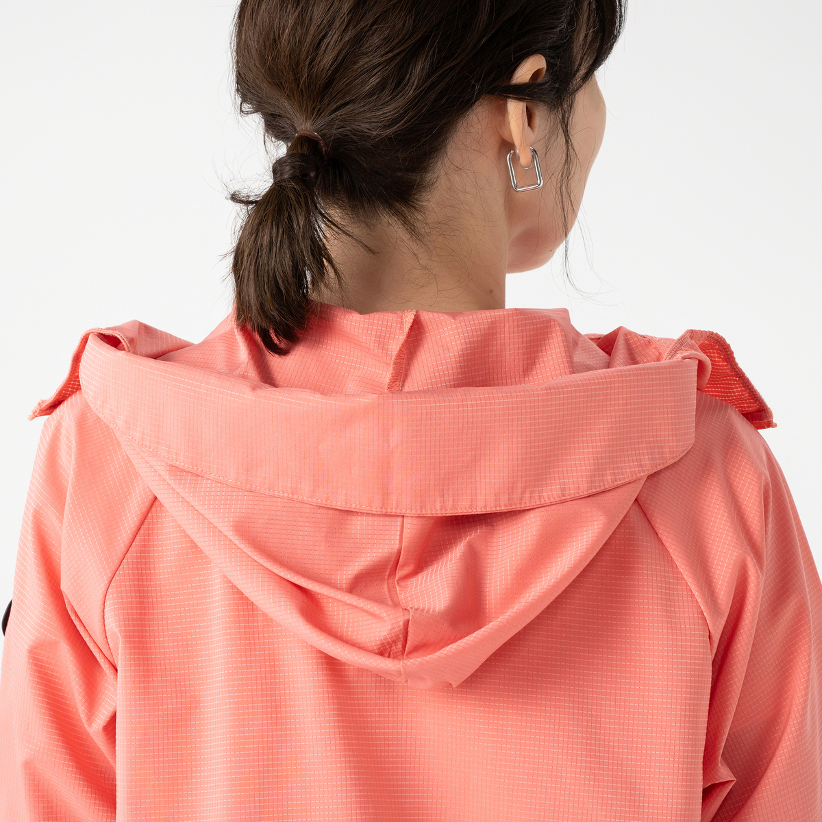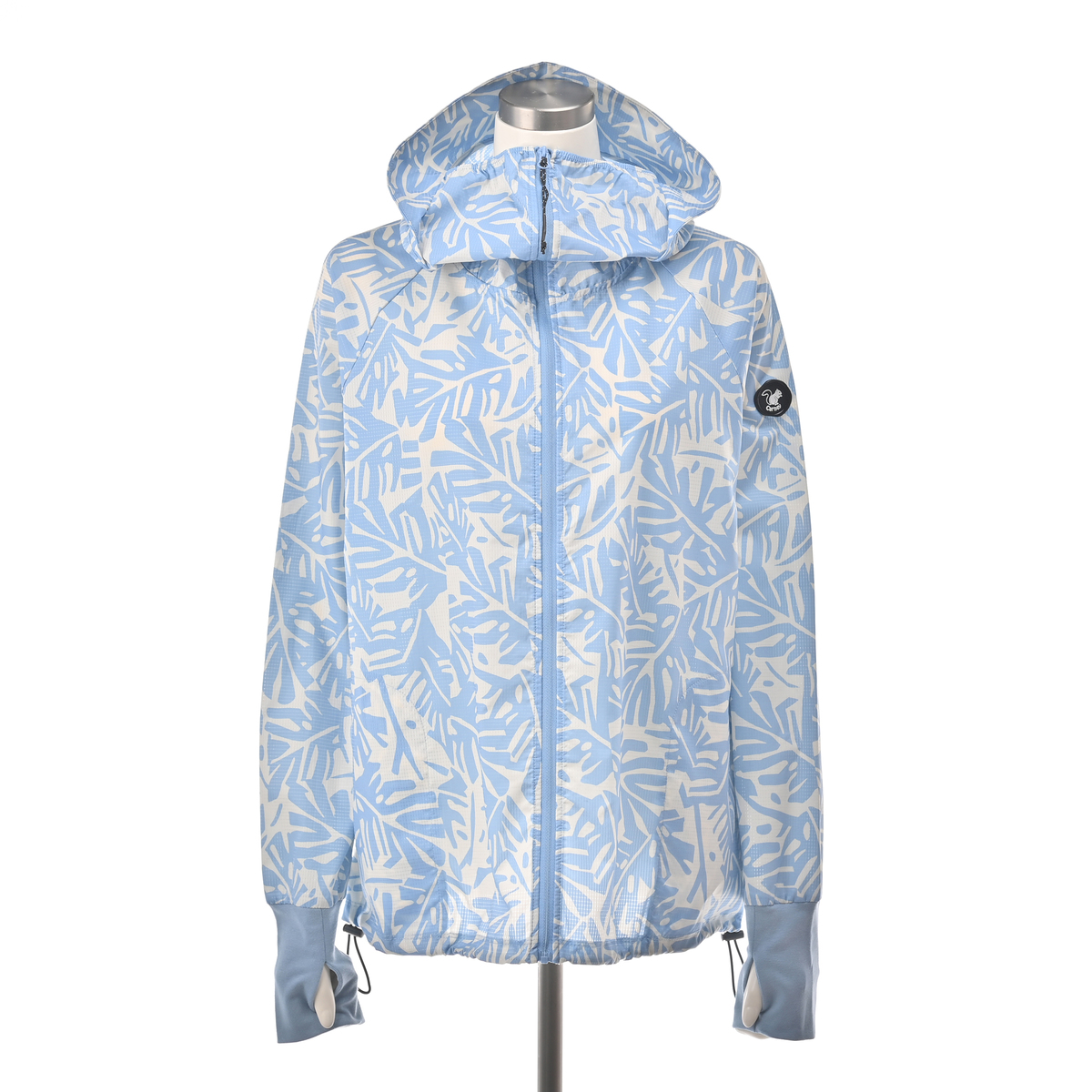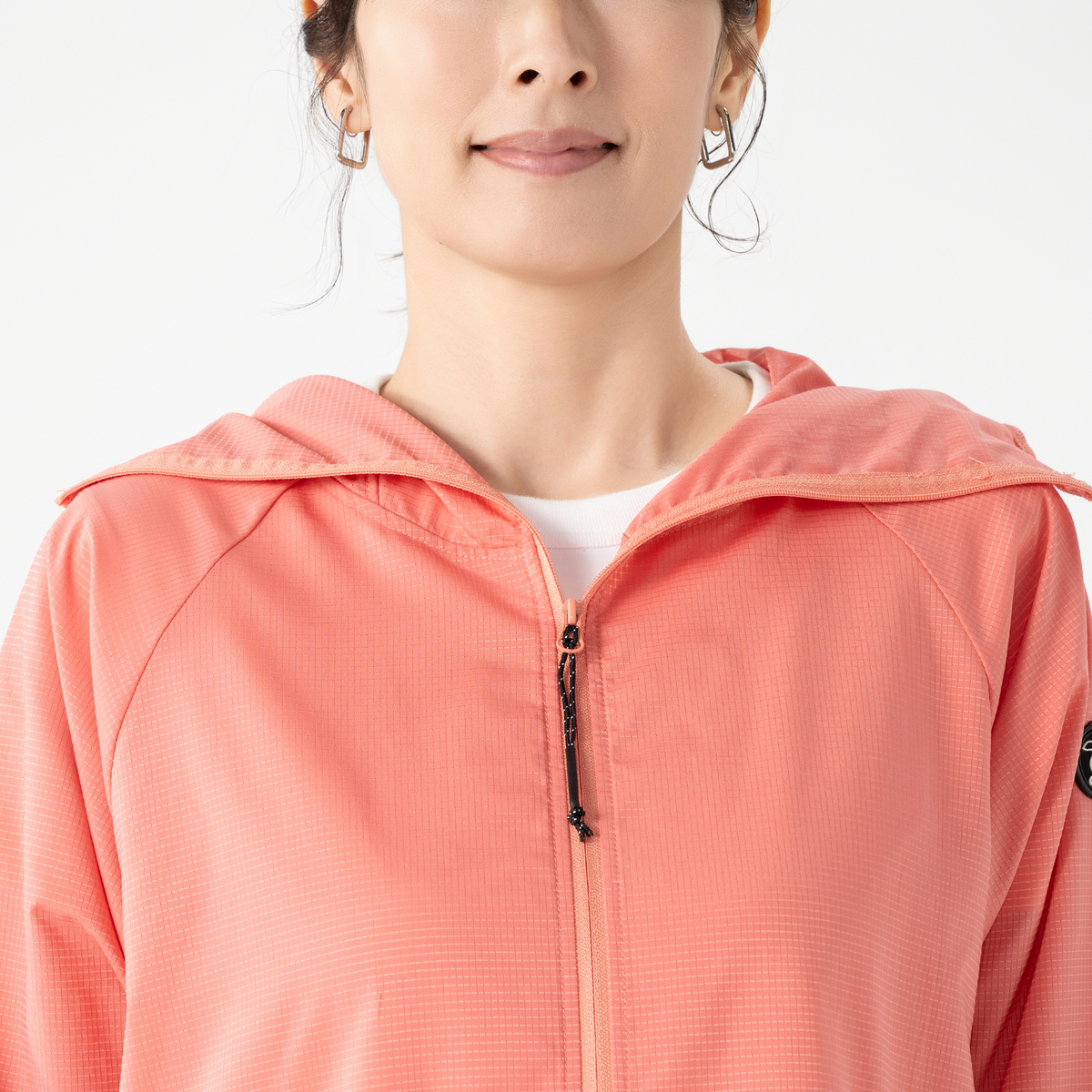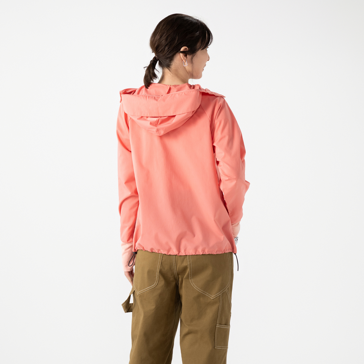 動きやすいラグランスリーブでフロントはファスナー開き。お顔周りをマスクのように覆う前衿の高さやフードに付けた大きめのツバ、袖口には手の甲を覆う指穴付きに。虫の接触や強い日差しから身を守ります。裾は丸ゴムとアジャスターで調節が可能です。両脇にはポケットも付いています