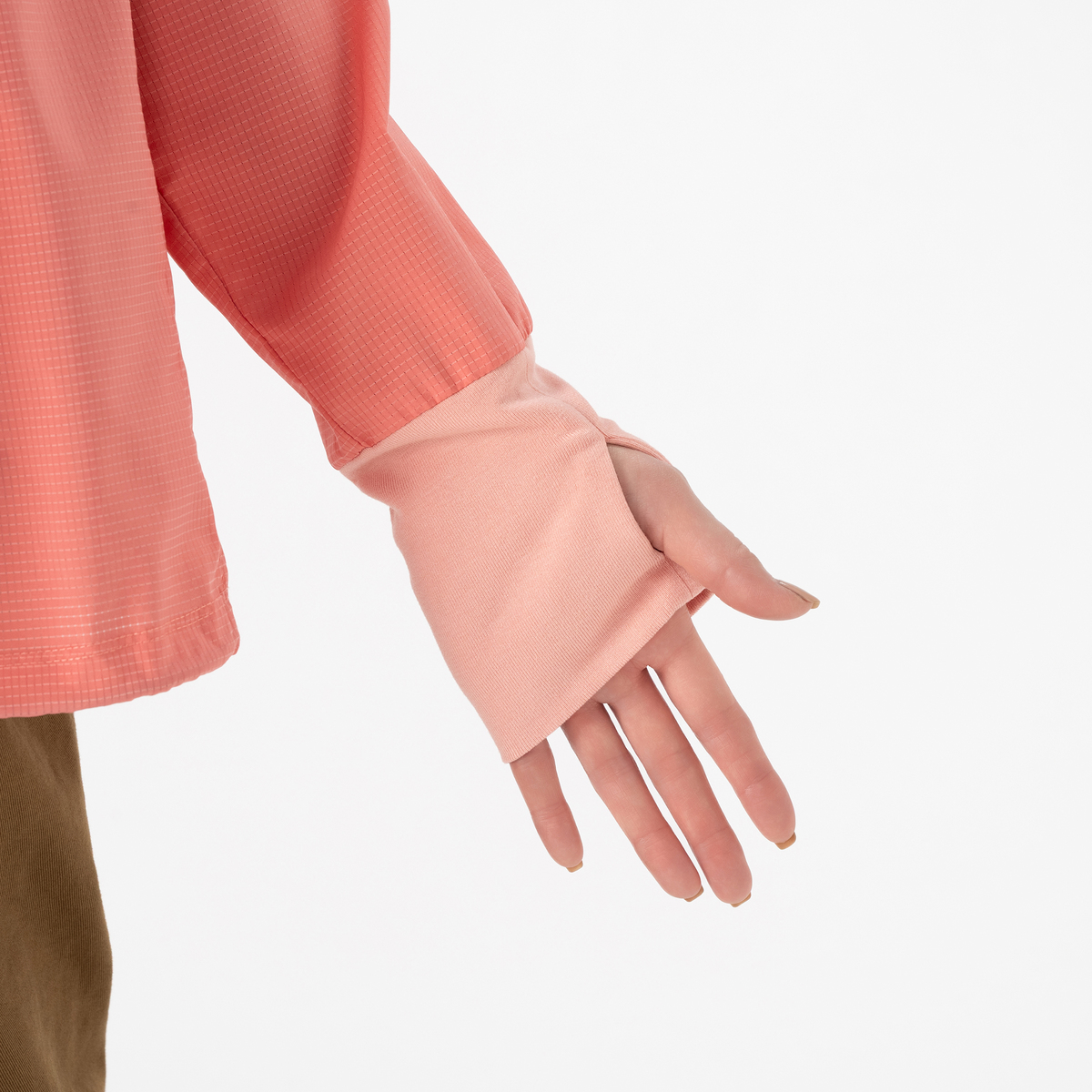 袖口にはリブを伸ばし付けることで適度な袖幅をキープ。さらにサムホール付きで、手の甲まで覆うことができます。触ったときにひんやりと感じる接触冷感機能、日差しを遮断するUVカット*に加え、虫を寄せ付けにくい虫よけ加工と、アウトドアに欠かせない機能をプラスしました