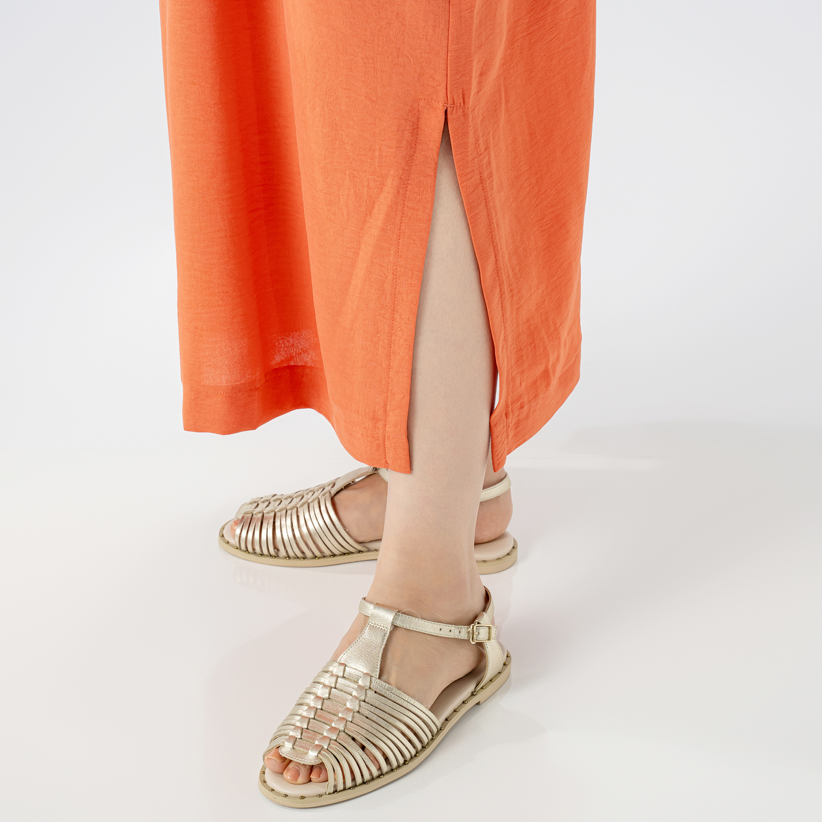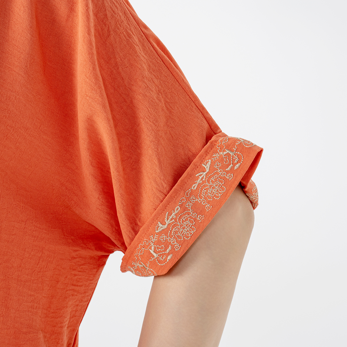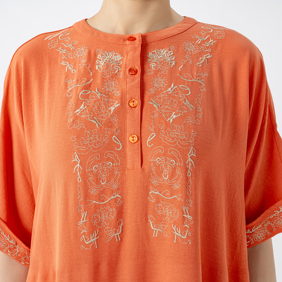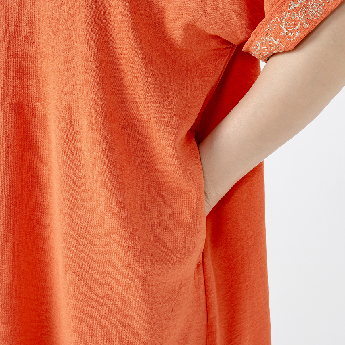 フロントの繊細な刺繍がエスニックな雰囲気を添えつつ、品のある仕上がりに。ゆったりとしたシルエットながら、裾にかけて緩やかにすぼまるデザインで、すっきりとした印象です。両サイドのポケットやスリットで機能性もプラスしました