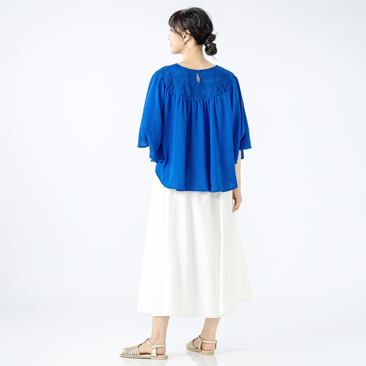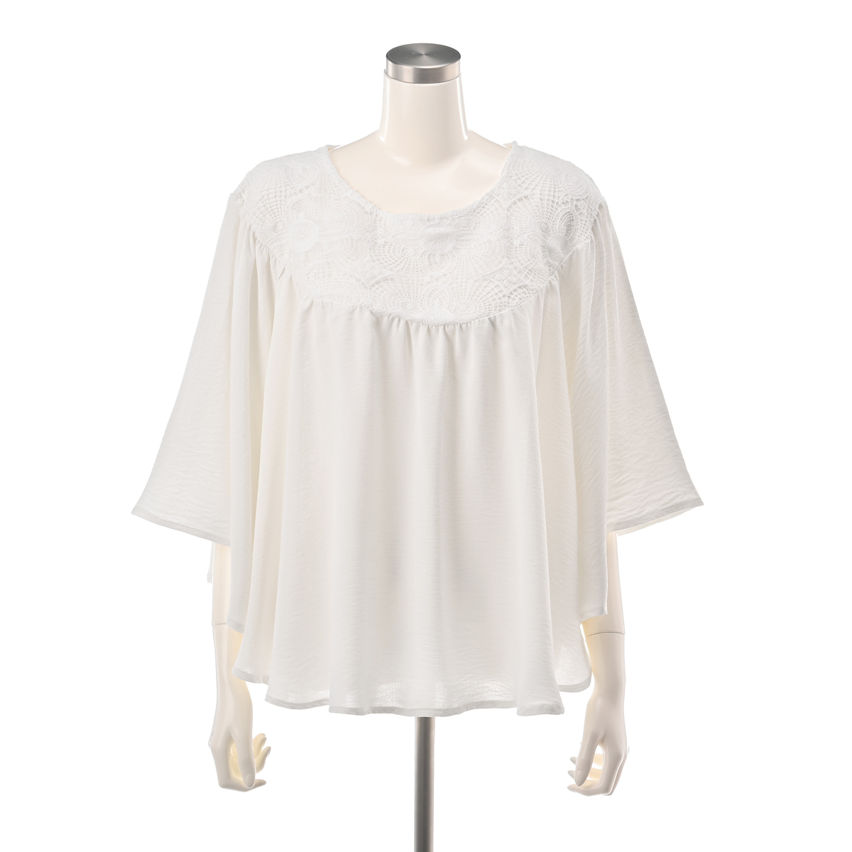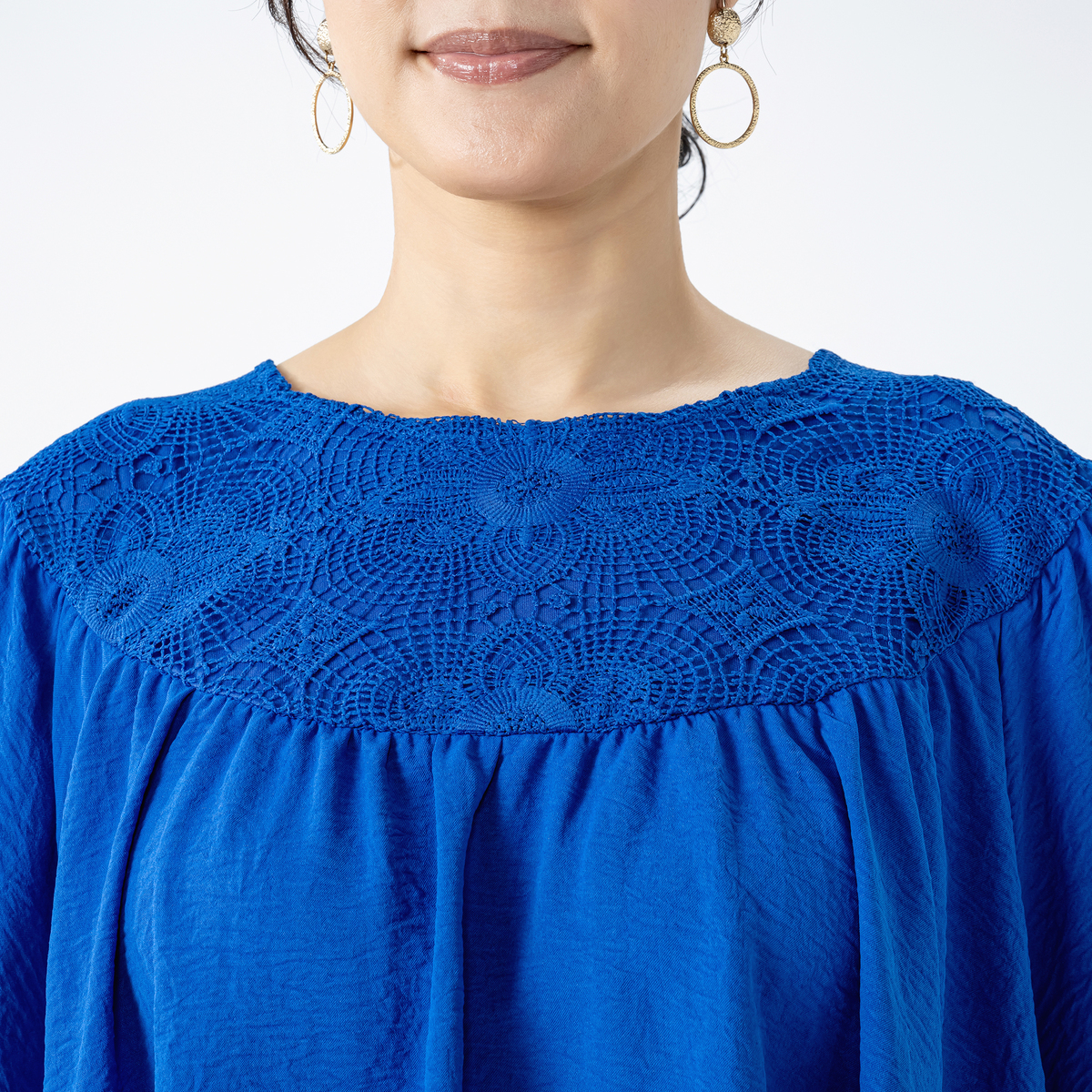デコルテのレースが上品さを演出。生地をふんだんに使用しているので動くたびに揺れて、華やかで優雅な印象を与えながら、体型カバーも叶えます。デニムやワンピースなどと組合せて、多彩なコーディネートが可能です