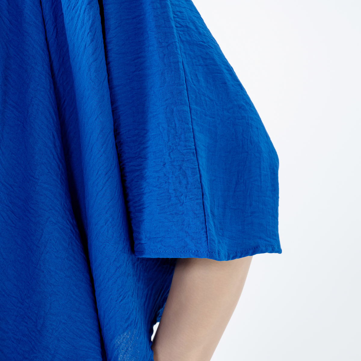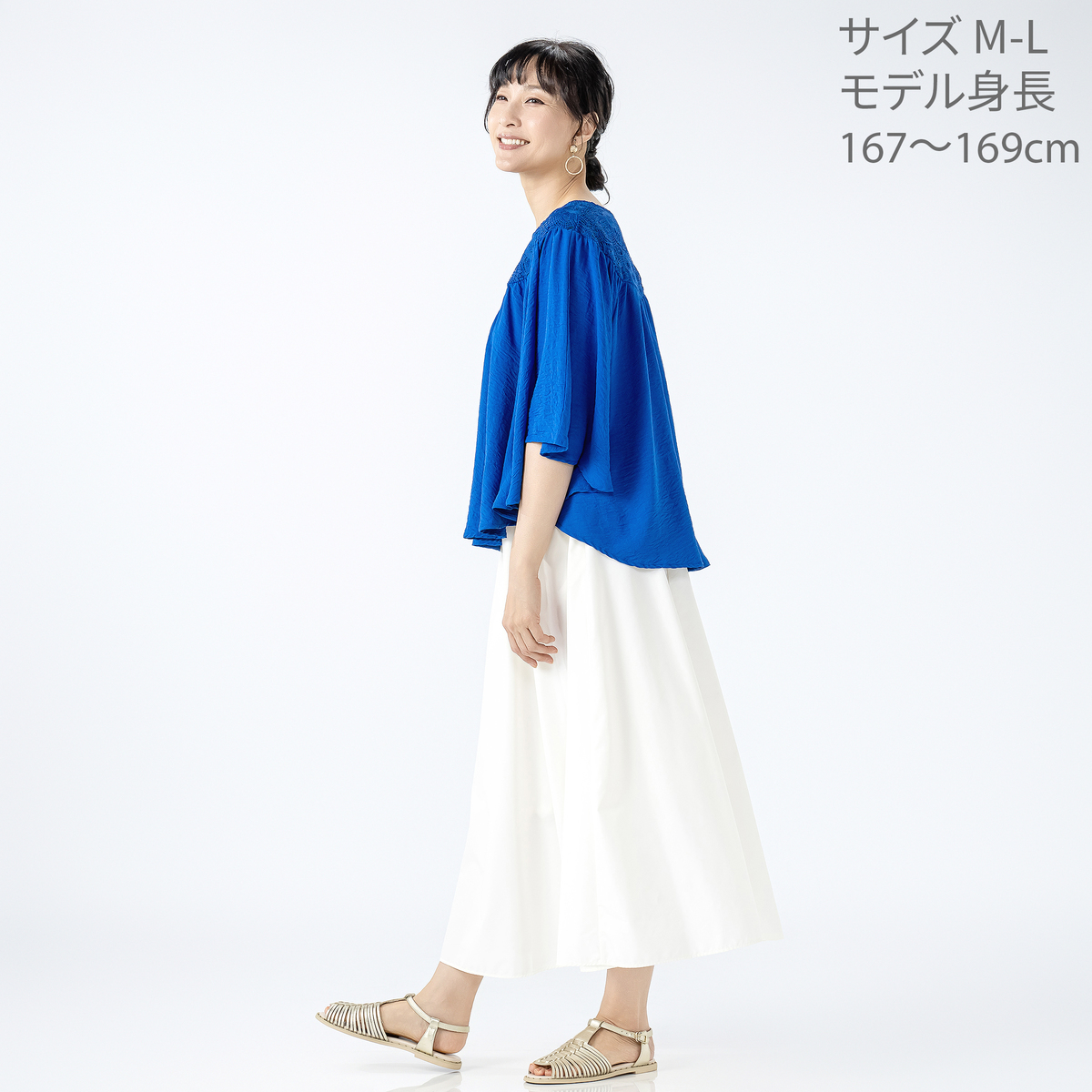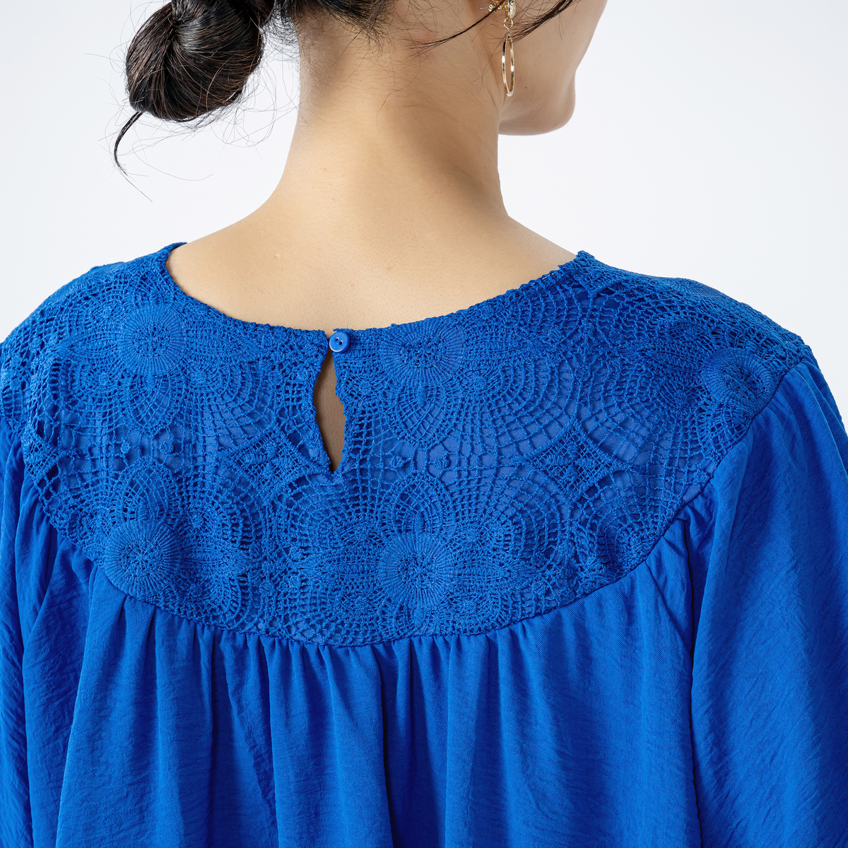 デコルテのレースが上品さを演出。生地をふんだんに使用しているので動くたびに揺れて、華やかで優雅な印象を与えながら、体型カバーも叶えます。デニムやワンピースなどと組合せて、多彩なコーディネートが可能です