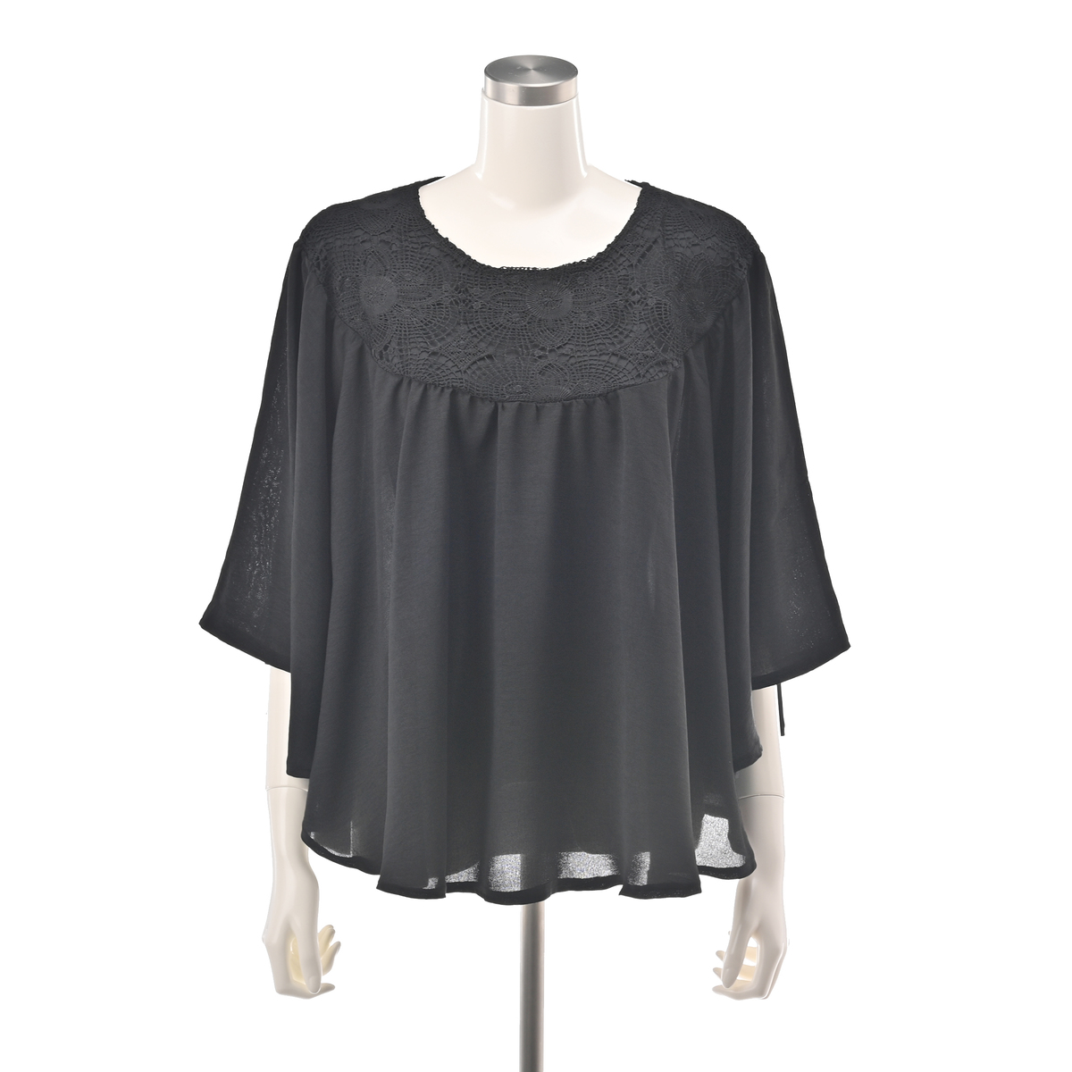 [商品寸法(ヌード寸法)cm] サイズ バスト 着丈 裄丈 MーL:(79〜94) 58.5 56 LLー3L:(93〜108) 61.5 58 [素材] 本体:ポリエステル100% レース部分布:ポリエステル100% 裏地:ポリエステル100% [お手入れ] 洗濯機洗い可 [注意事項] ※商品寸法の誤差は多少発生します。ご了承下さい ※洗濯時はネットを使用して下さい ※蛍光剤の入っていない洗剤をご使用下さい ※洗濯の際に色落ちする事がありますので、他の商品との洗濯はお避け下さい(単独洗い) ※脱水後はただちに取り出し、形を整えてから干して下さい ※長時間濡れたまま放置しないで下さい ※素材の特性上、汗や雨等で濡れた時や強くこすられた場合、摩擦により色落ちする場合が有りますのでご注意下さい ※アイロンは当て布を使用して下さい 【中国製】