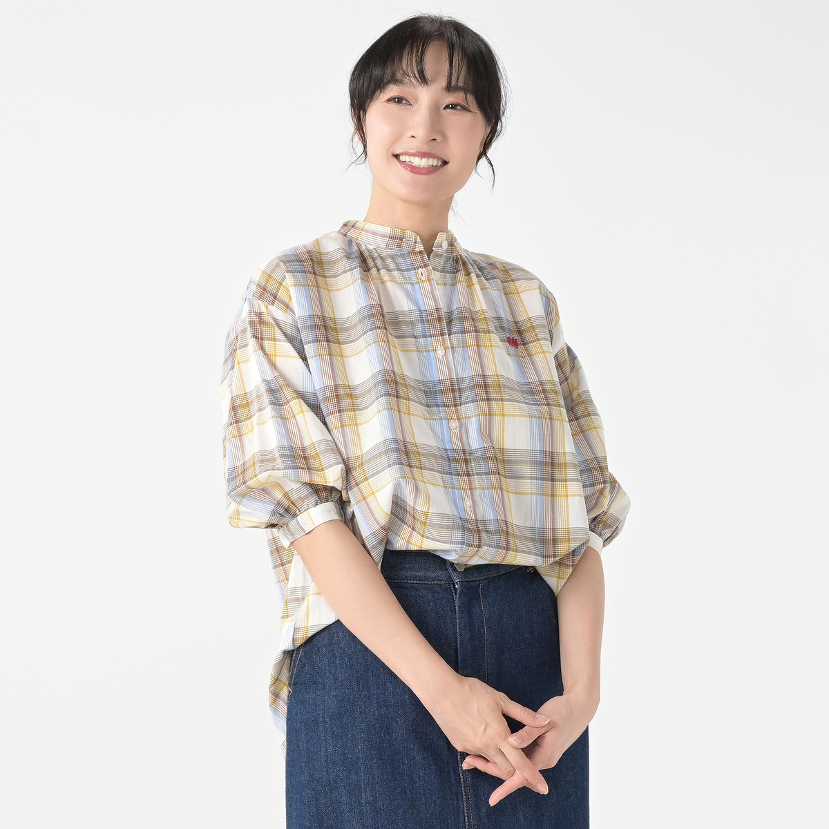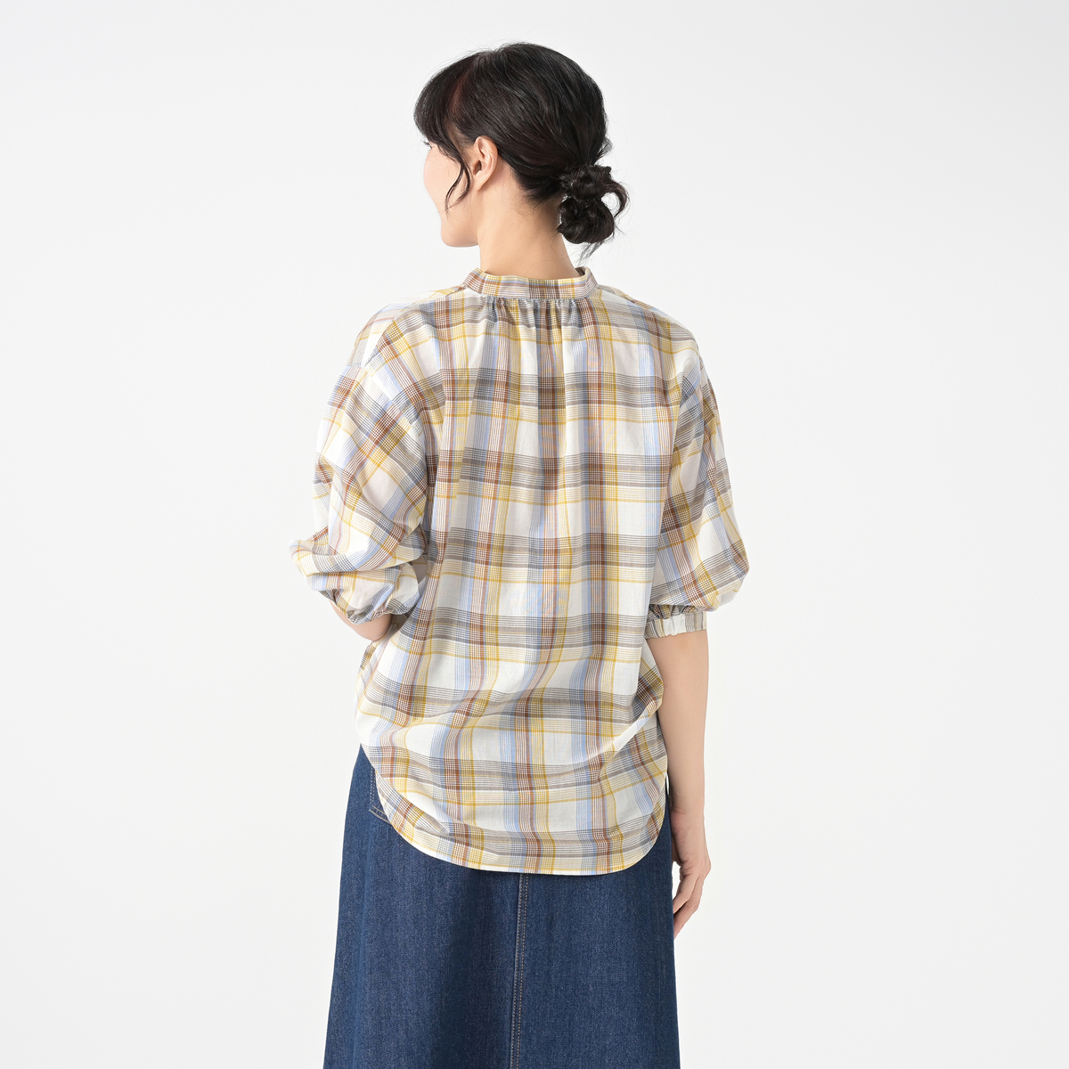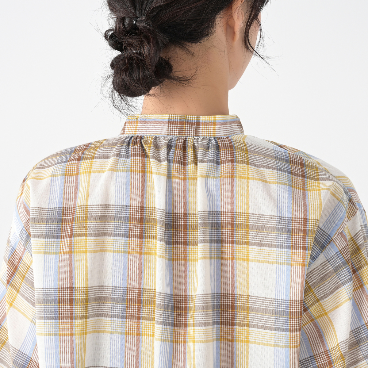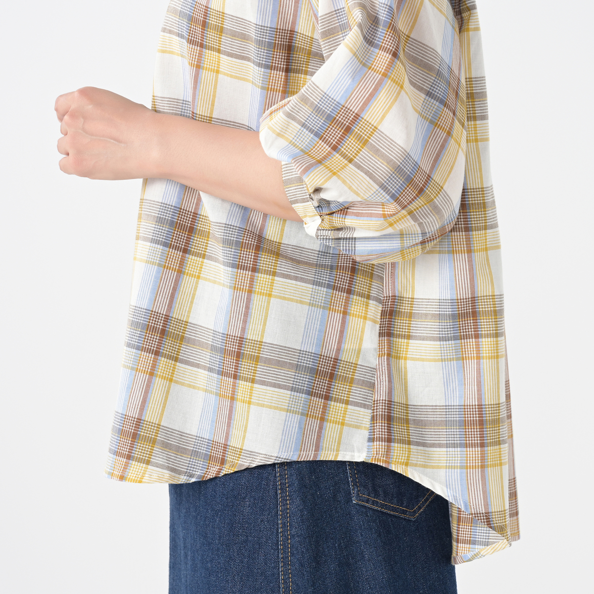 リネンのような風合いの甘撚りの先染めチェック生地を使用。ほどよい透け感が涼しげな印象を与えます