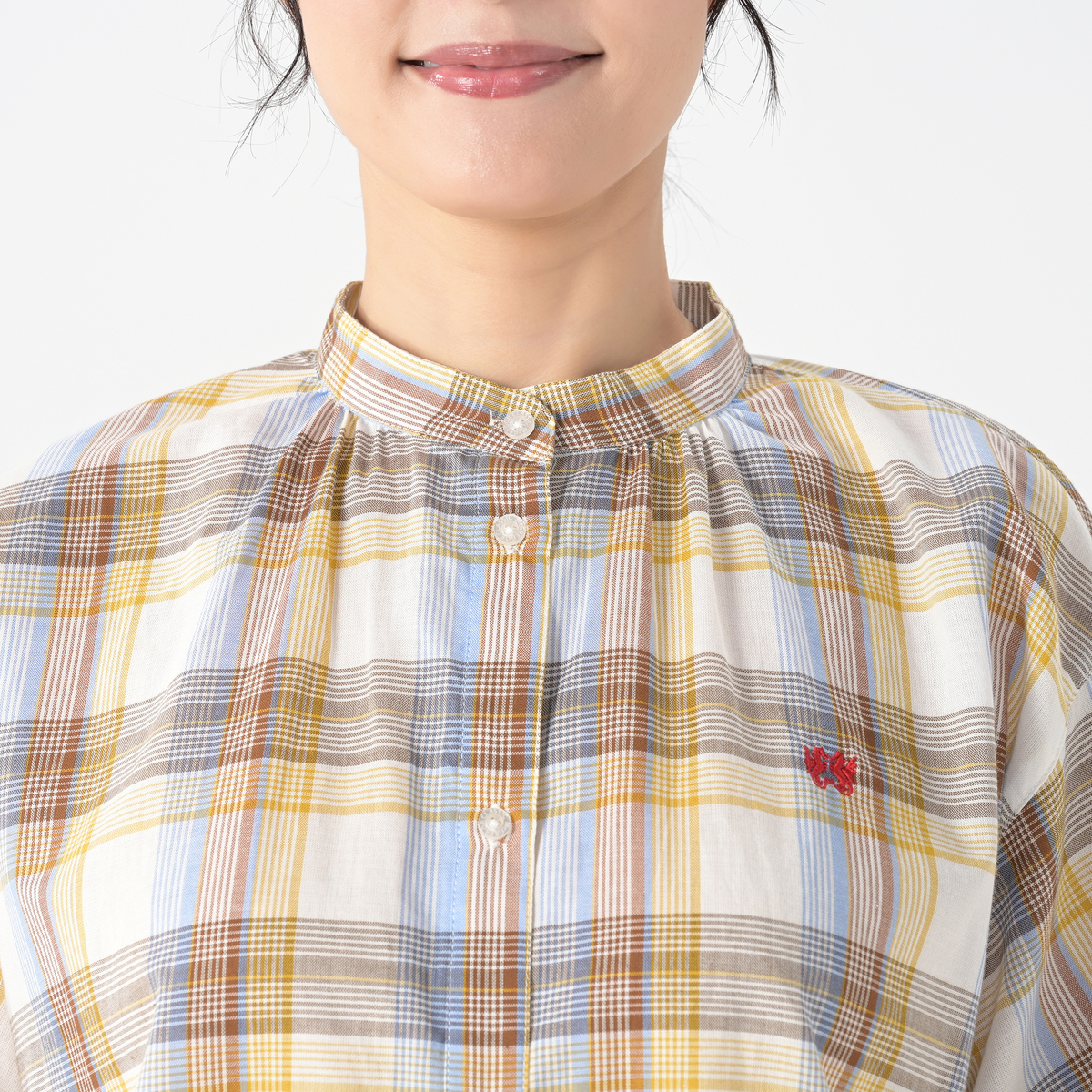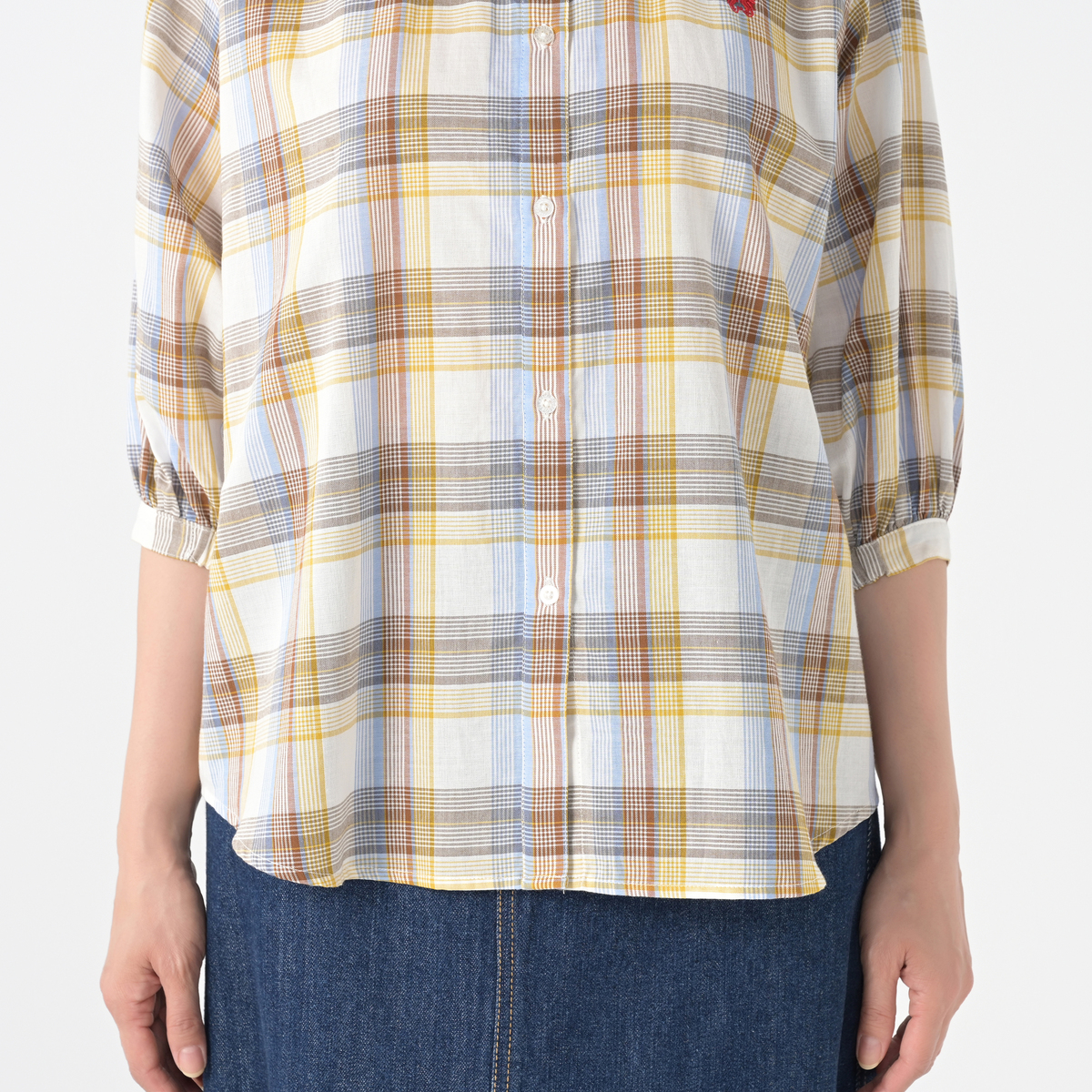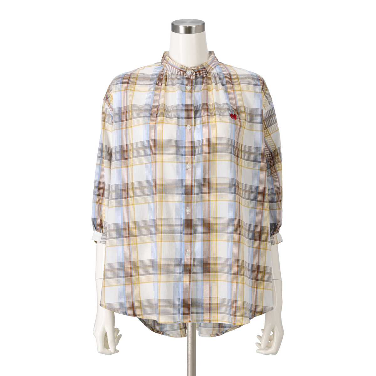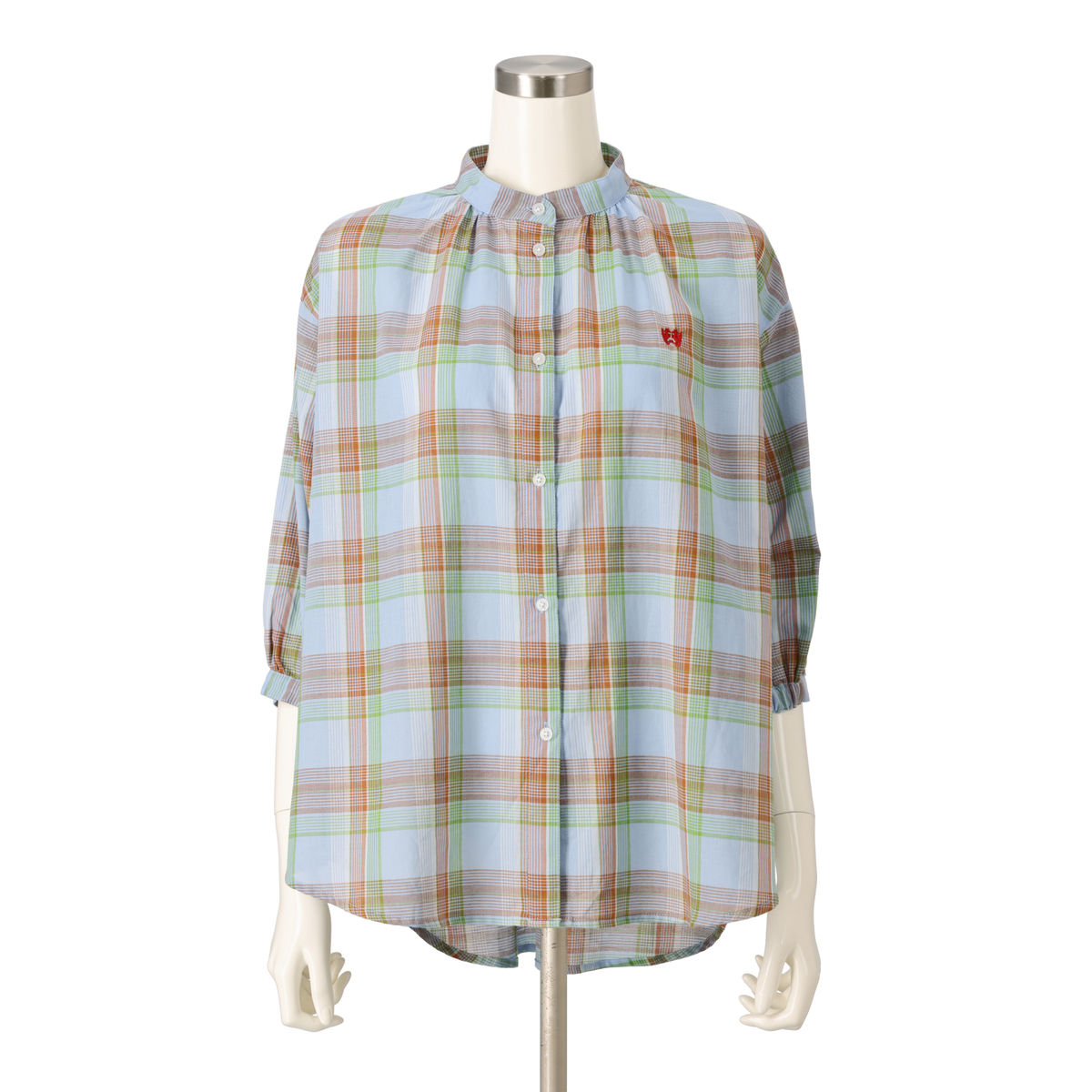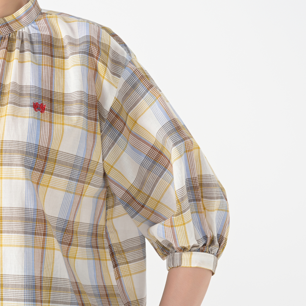 マドラスチェックの5分袖シャツ。左胸にはブランドアイコンであるドラゴンの刺繍入り。袖口内側にはゴムをあしらい、ふんわり仕上げました。フロントを開けて軽やかな羽織りとしても楽しめます