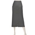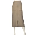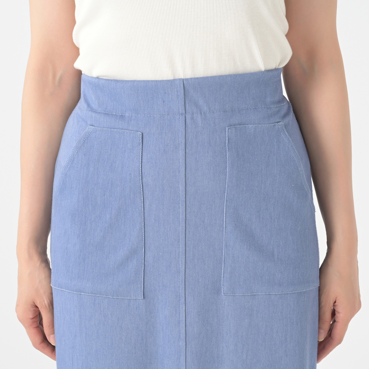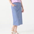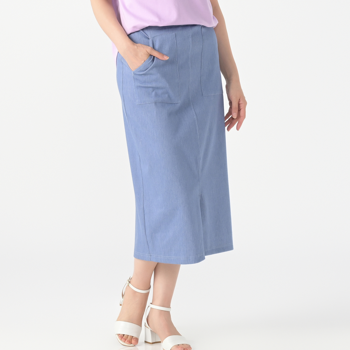 エニワイズ加工を施したソフトタッチの生地を使用したデニム風のスカート。両サイドのポケットがアクセントになったシンプルなデザインです。ウエストはプルオンタイプで穿きやすく、センタースリットがすっきりした印象を与えてくれます
