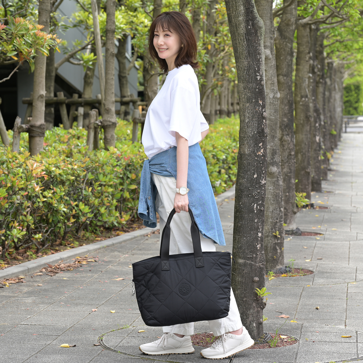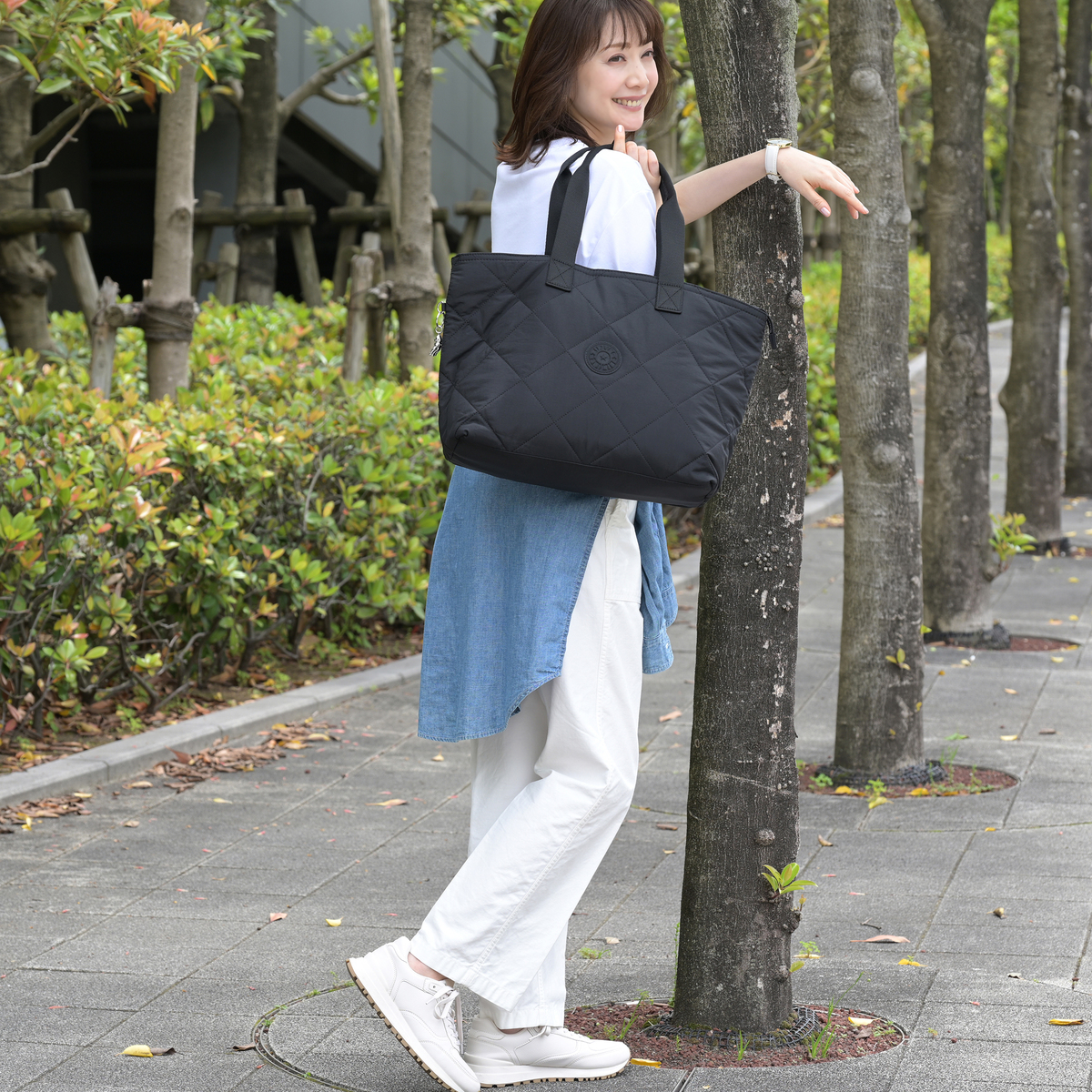 シンプルなスクエアシルエットで、大きめのトートバッグ。ハンドル立ち上がりに余裕があり、肩下げも可能です。軽くて丈夫なクリンクルナイロンにキルティング加工をした特別なコレクションで、ソフトでマットな質感の表地が柔らかな上質感を演出しています