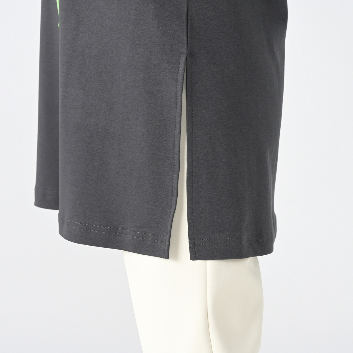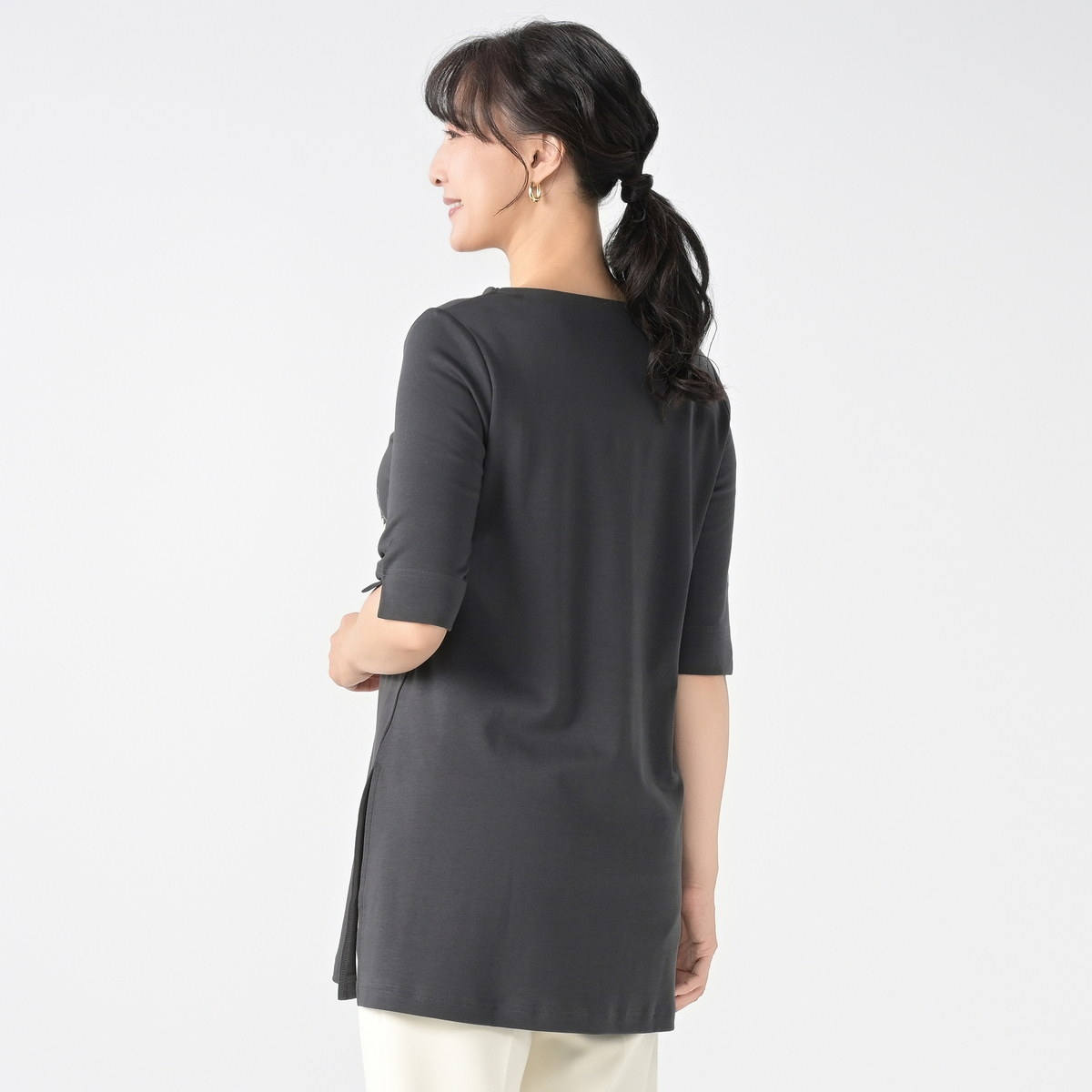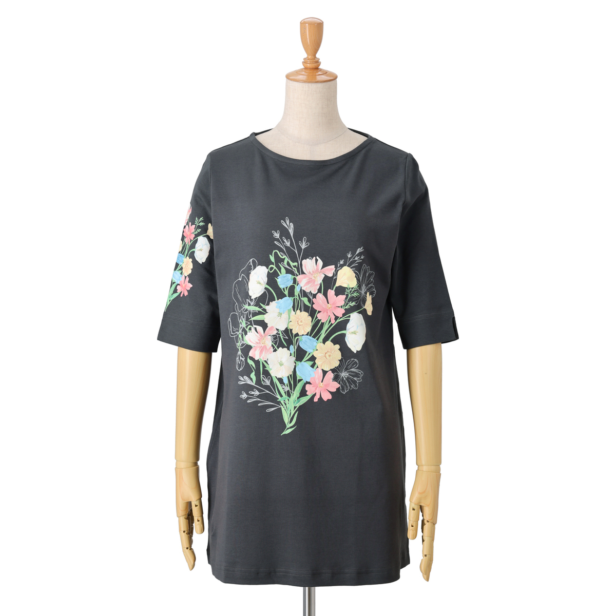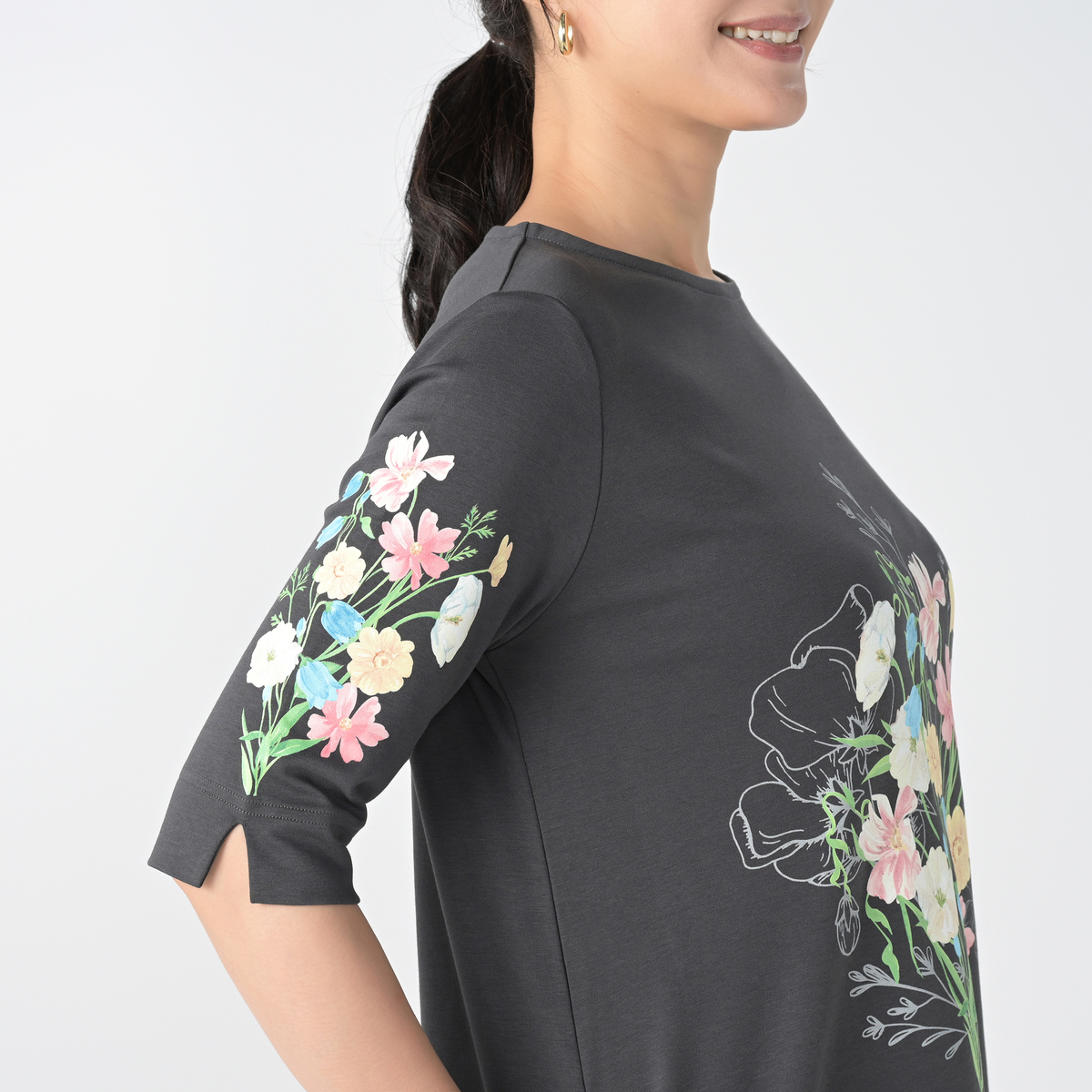 美しいプリントが目を引くチュニック。緻密に計算されたネックラインは胸元を美しく見せ、袖はアームホールをたっぷりとり、二の腕をほっそりと見せてくれます。サイドのスリットが縦ラインを強調。お腹やヒップまわりをしっかりカバーしてくれる丈感です