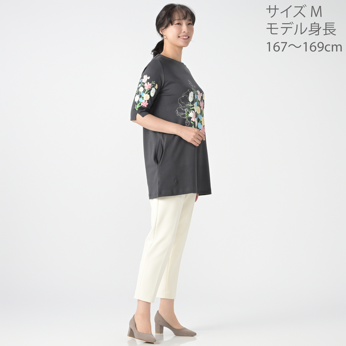 高身長(166センチ、体重58キロ)、長めのチュニック丈が好きなため、Lの着丈は77センチ、LLは78センチを確認し、LLを注文しました。 届いたお品は一緒に頼んだ着丈78センチのお品より明らかに短いので、測ってみたら74センチしか有りませんでした(泣) 74センチの着丈なら絶対に購入しなかったので返品させていただきました。 試着して購入が出来ないのですから、出来上がり寸法は、お手数でもしっかり検品していただきたいです。 生地、着心地はとても良かったので、これからもリピートしたいのですが、あまり大きな派手なお花より、小さなお花を品よくあしらったデザインを増やしていただけたら嬉しいです。