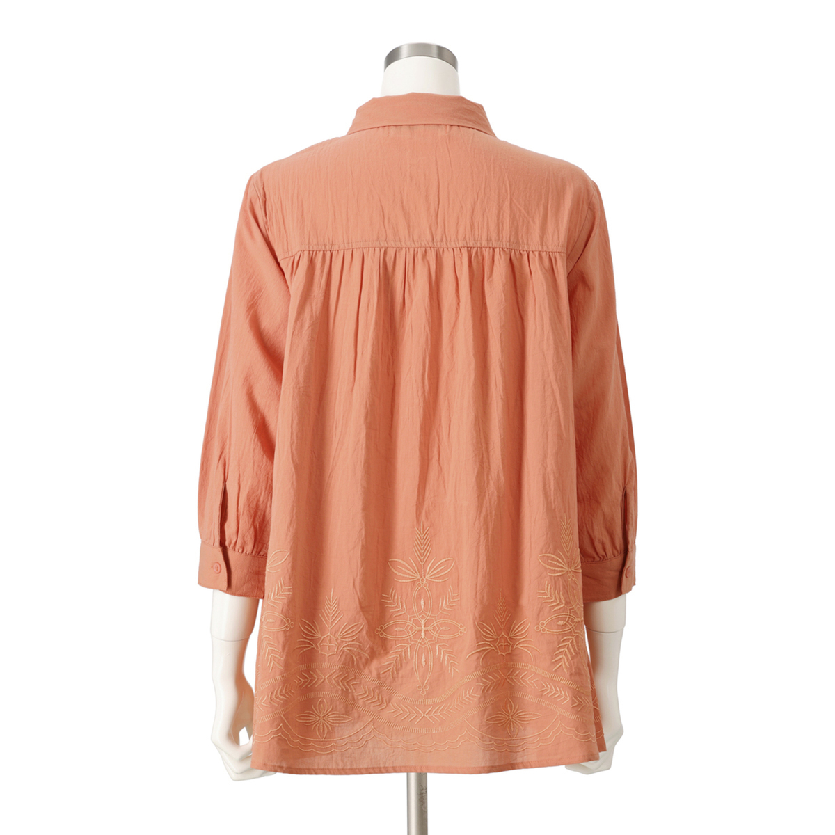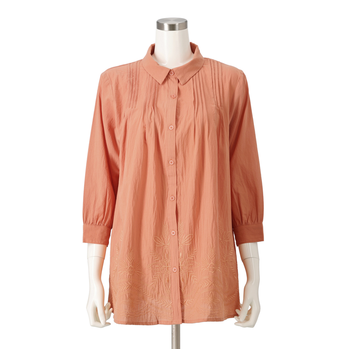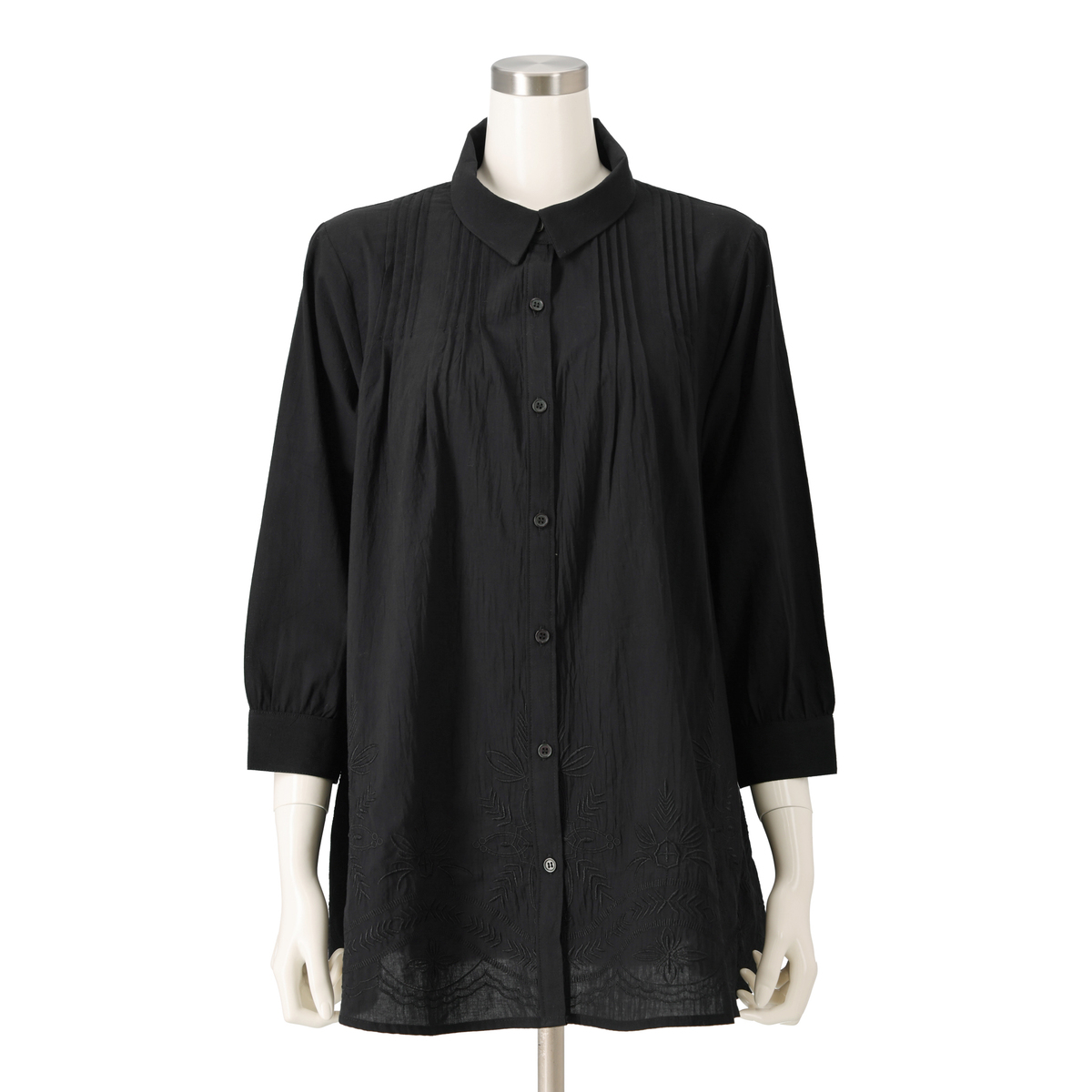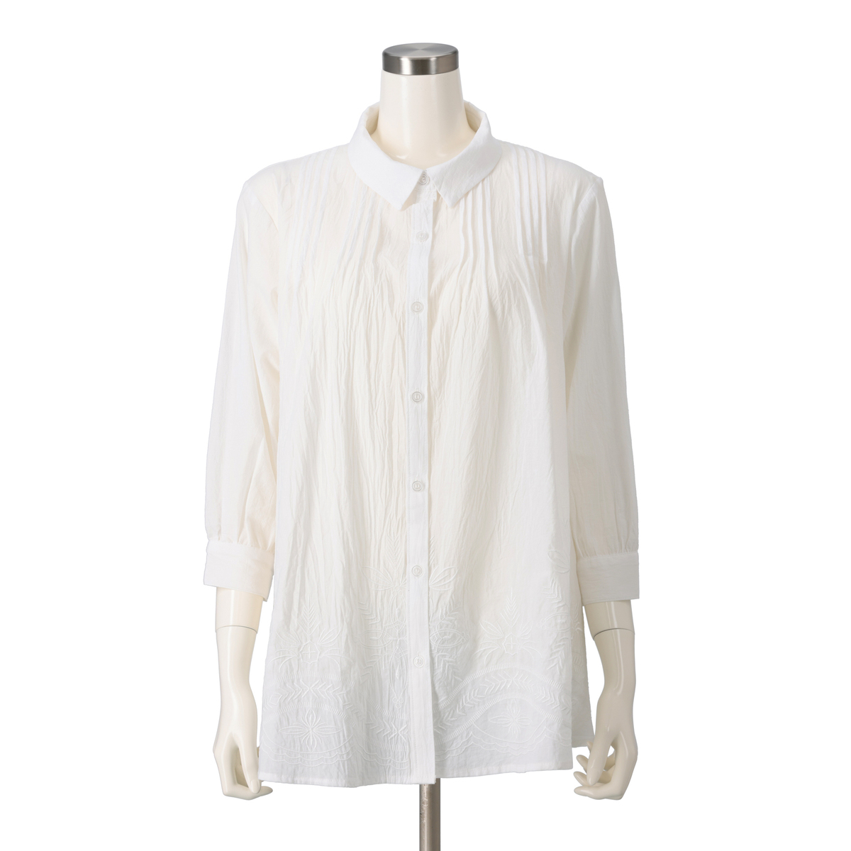 裾にぐるりと華やかな刺繍を施したシャツ。繊細で細やかな刺繍に高級感が漂います。さらりと気持ち良い綿100%素材で、少しのワッシャー感が優しい表面感。胸元は細かいピンタック入りで、縦線が強調され、細見え効果にも期待できます
