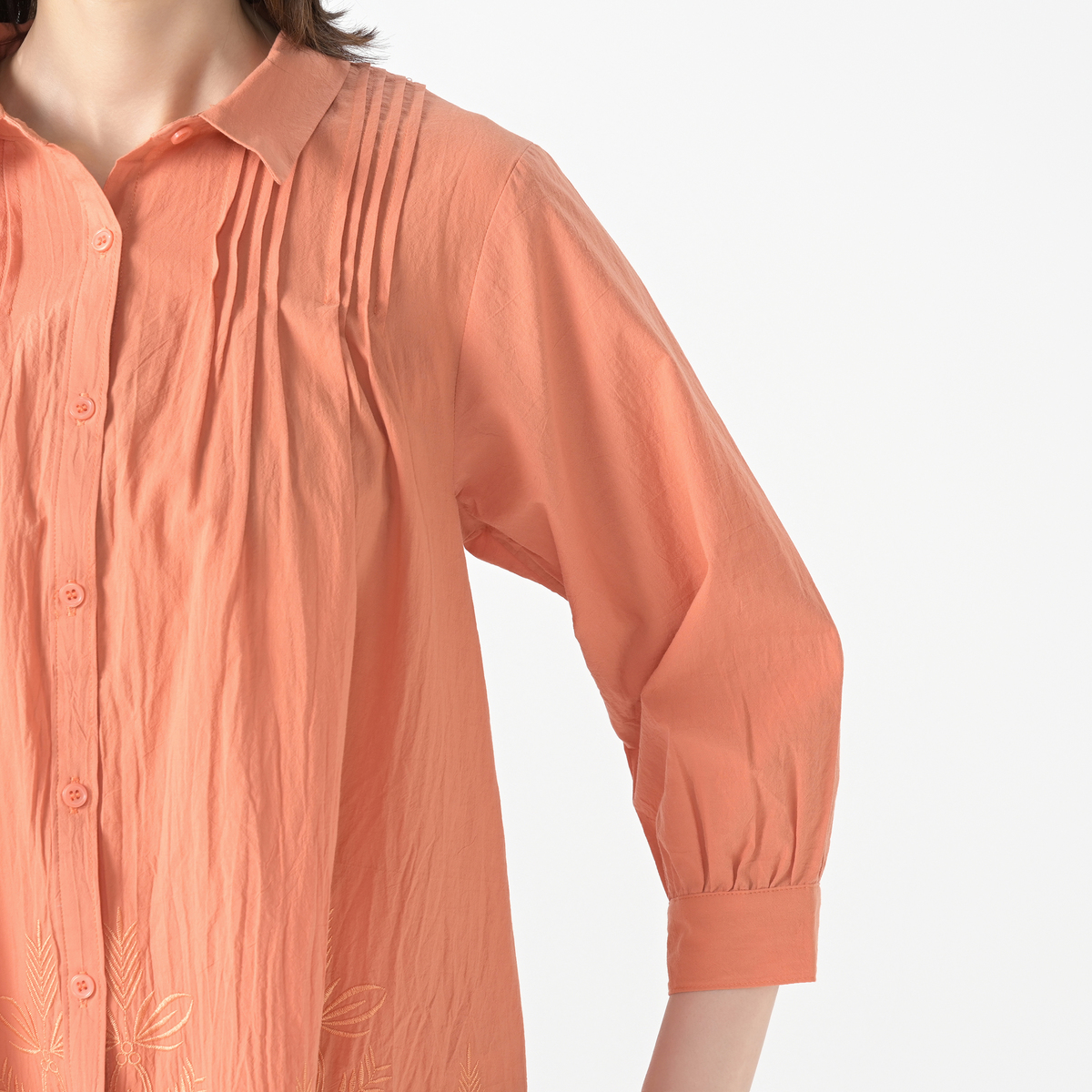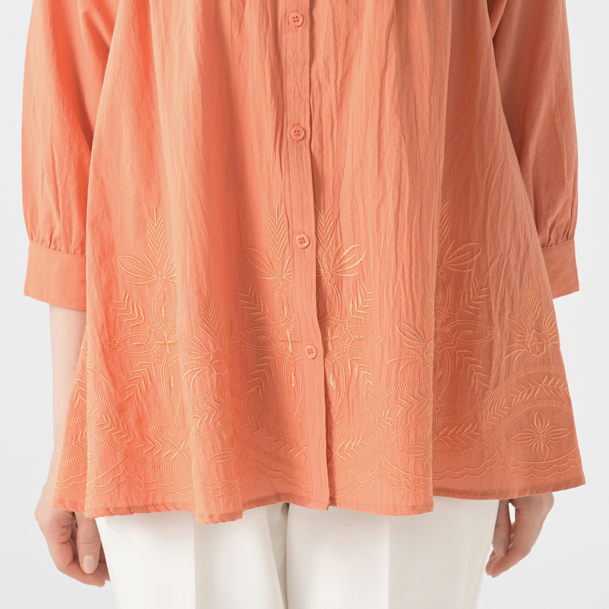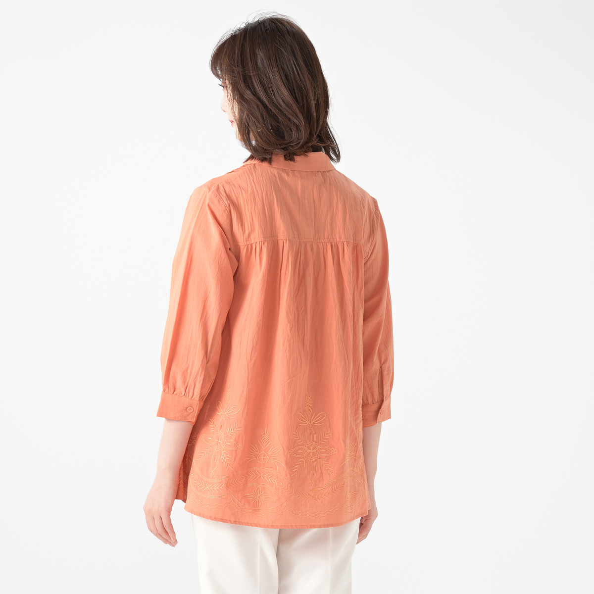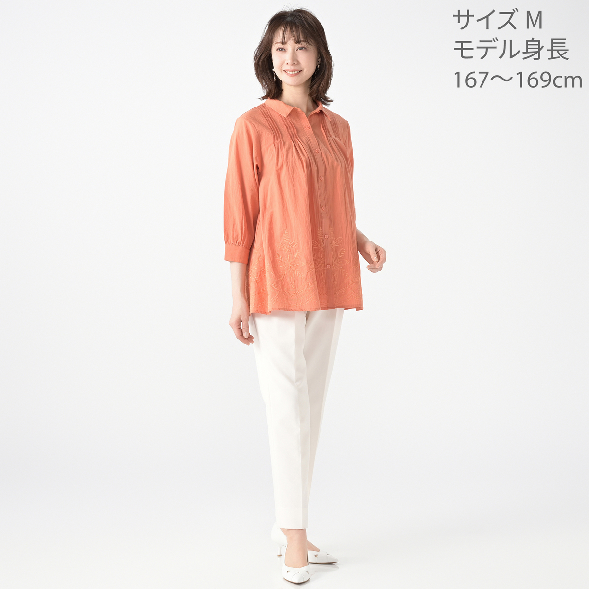 裾にぐるりと華やかな刺繍を施したシャツ。繊細で細やかな刺繍に高級感が漂います。さらりと気持ち良い綿100%素材で、少しのワッシャー感が優しい表面感。胸元は細かいピンタック入りで、縦線が強調され、細見え効果にも期待できます