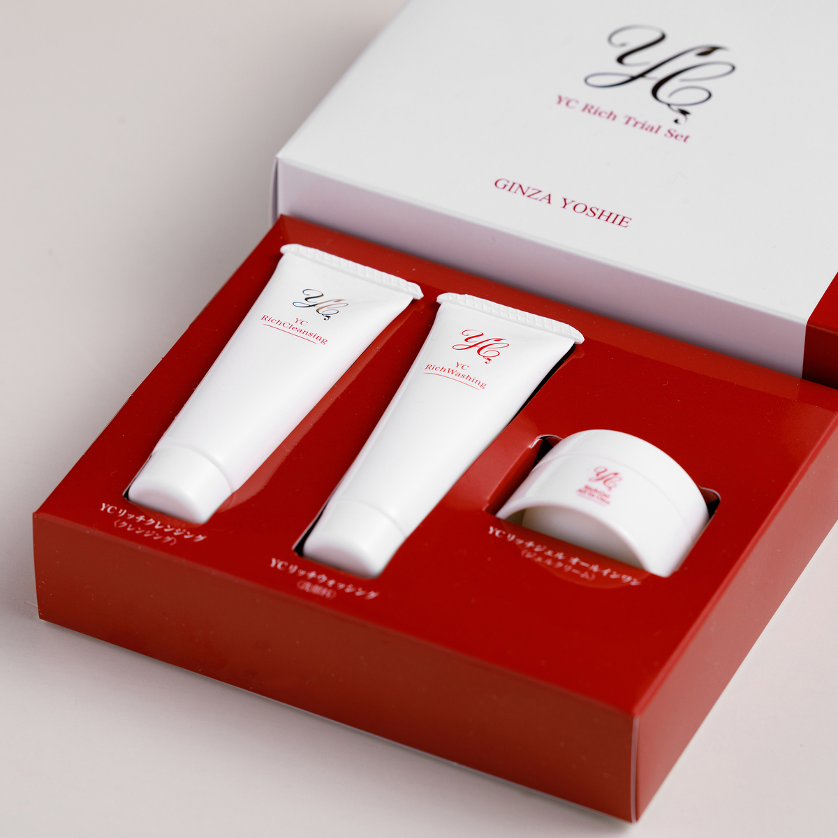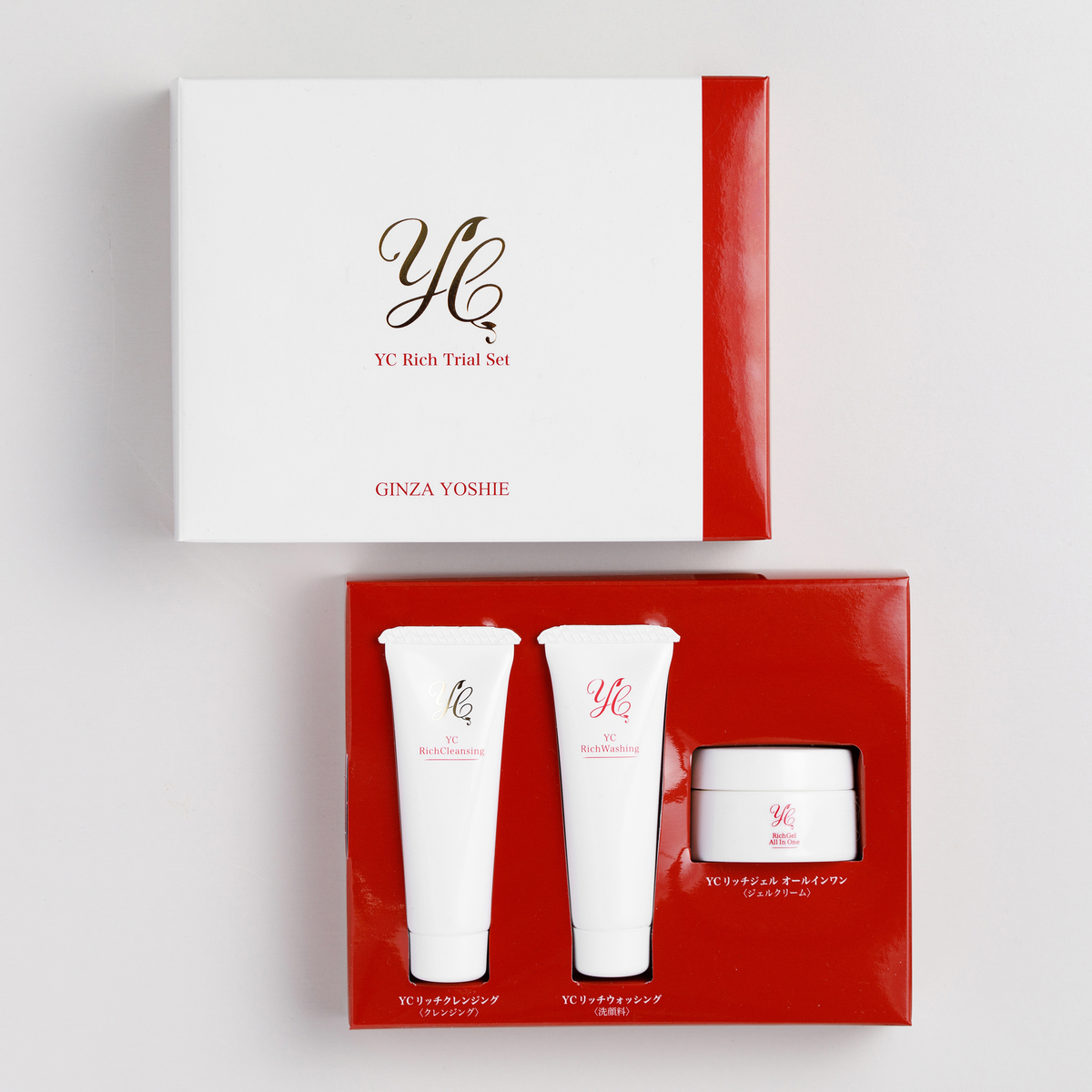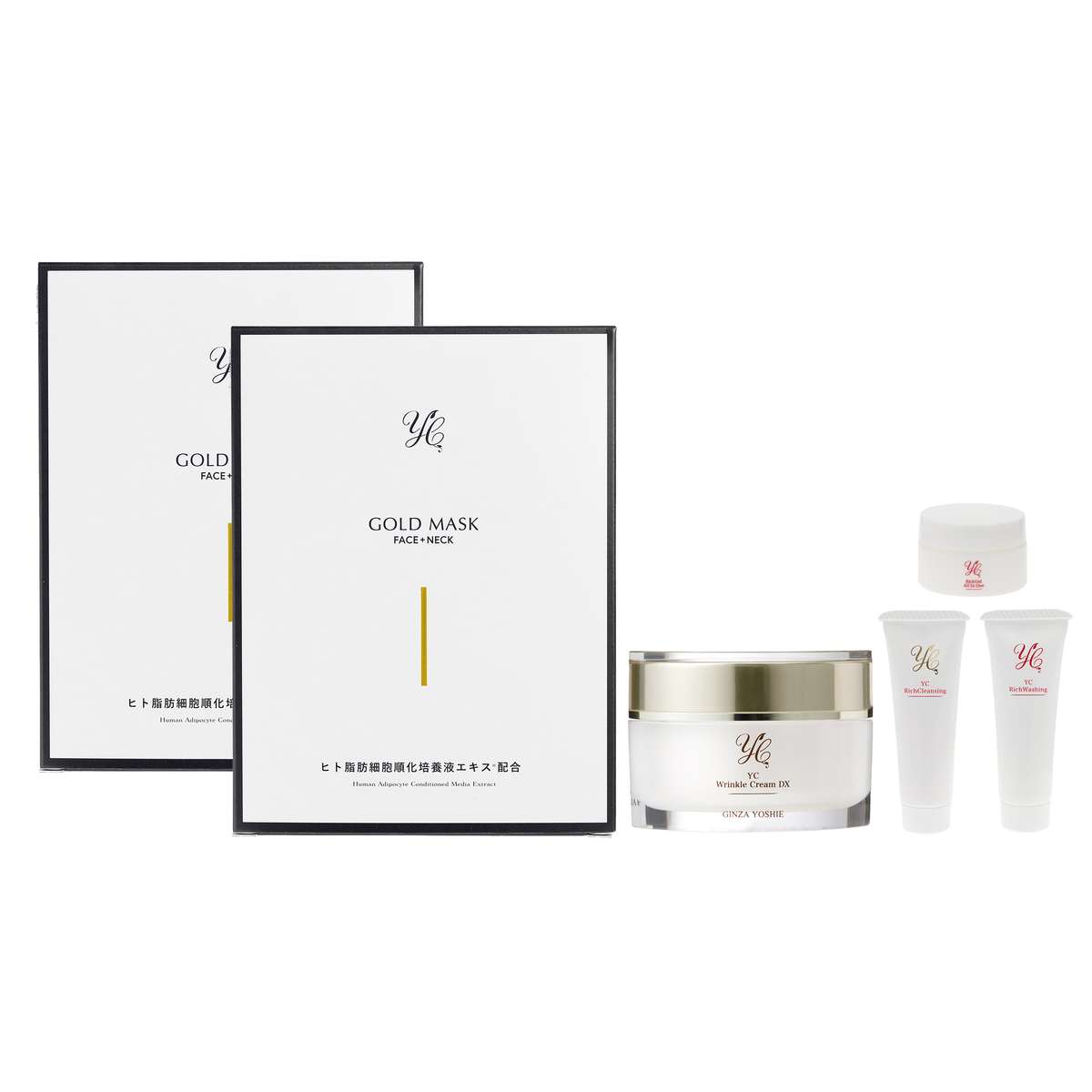 保湿など年齢に応じた肌のお手入れをサポートする、YCゴールドマスクスペシャルセット。CPCゴールドマスク5枚入り2箱に、YCリンクルクリームDX 30g、YC リッチウォッシング 10g、YC リッチオールインワンジェル 10g、YC リッチクレンジング 10gをセットにしました