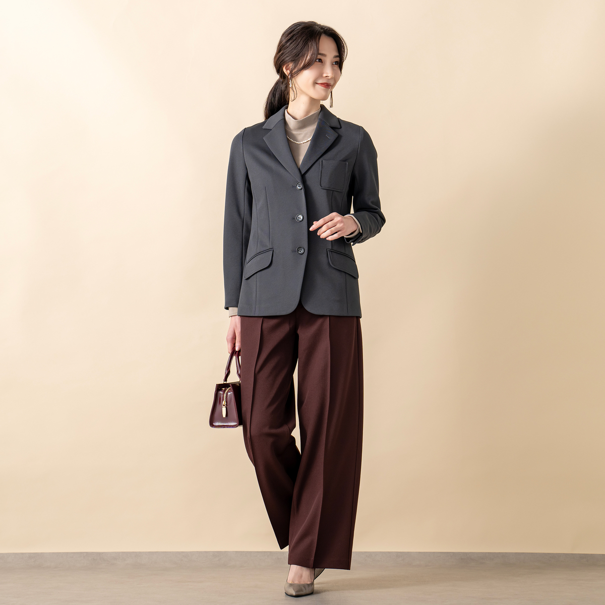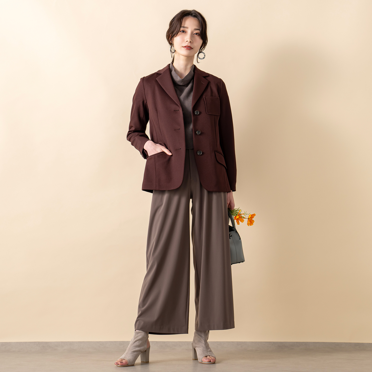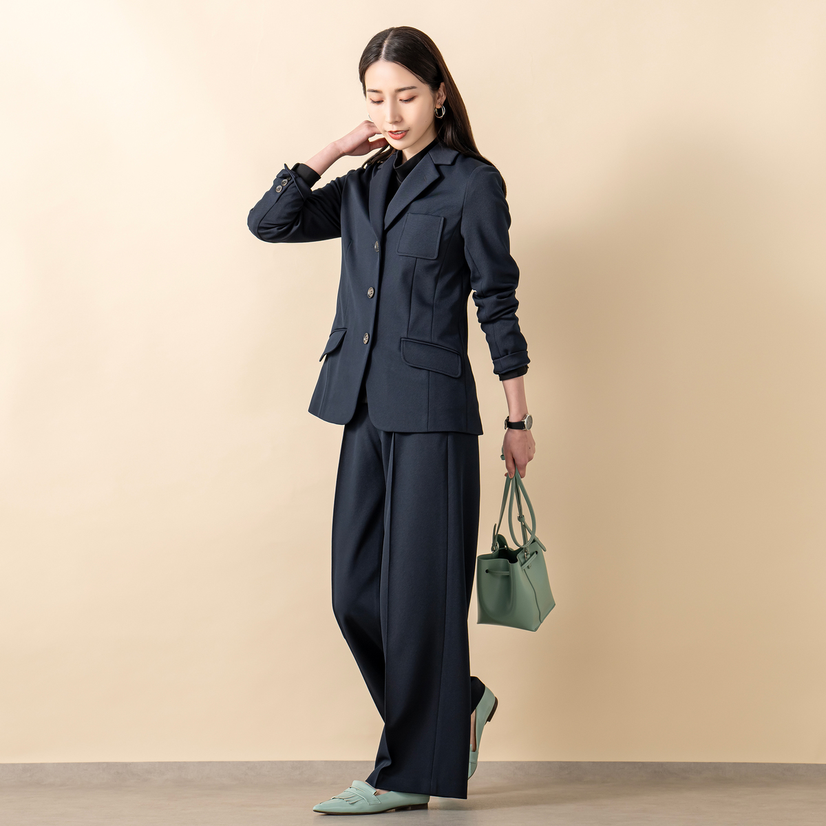 仕事でスーツとして上下で購入致しました。 シルエットはとても気に入りました。しかし絶賛更年期中で汗が止まらないため、このしっかりした生地感は、私には冬でも暑くて多分すぐに袖を通さなくなりそうてす。デザイン、生地はしっかりしていますが着心地はとても柔らかいです。が私には…残念です。