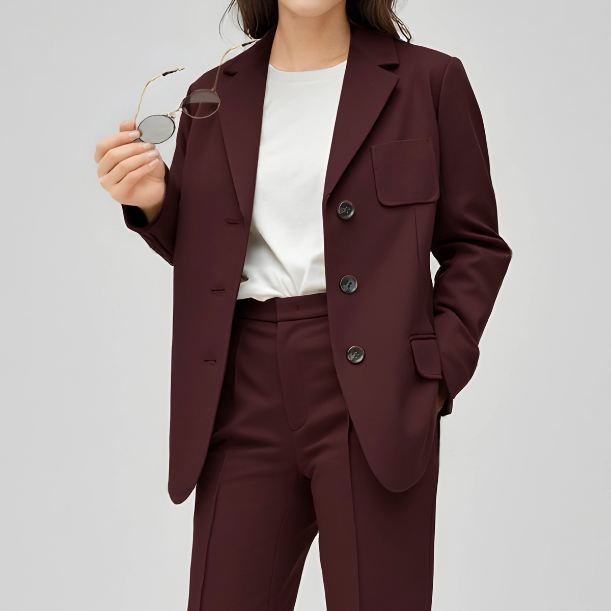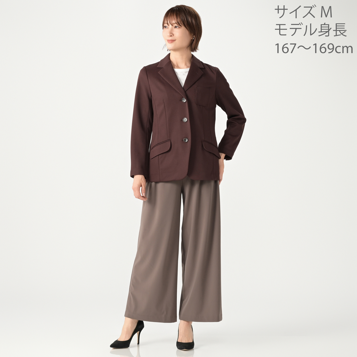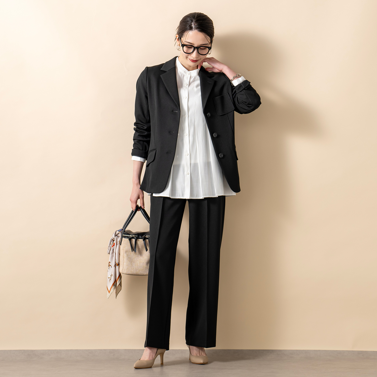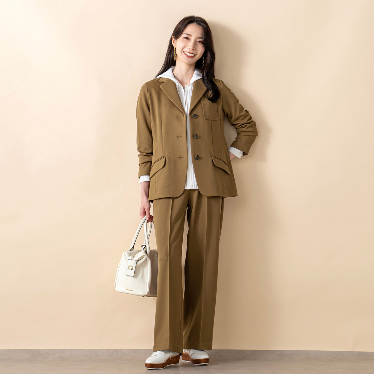 仕事でスーツとして上下で購入致しました。 シルエットはとても気に入りました。しかし絶賛更年期中で汗が止まらないため、このしっかりした生地感は、私には冬でも暑くて多分すぐに袖を通さなくなりそうてす。デザイン、生地はしっかりしていますが着心地はとても柔らかいです。が私には…残念です。