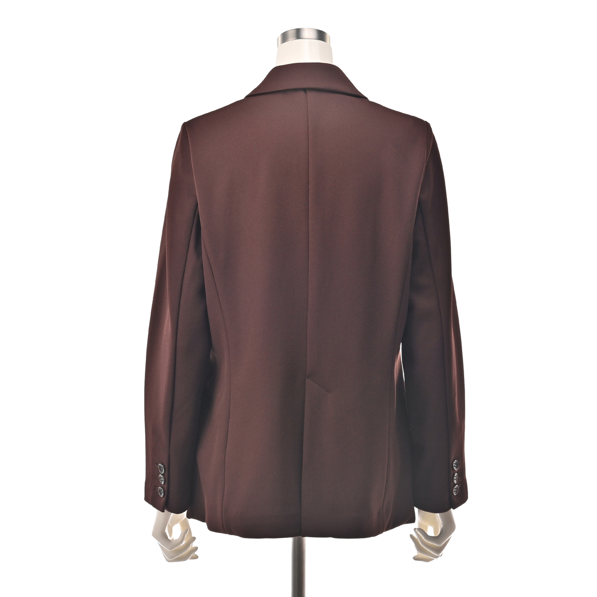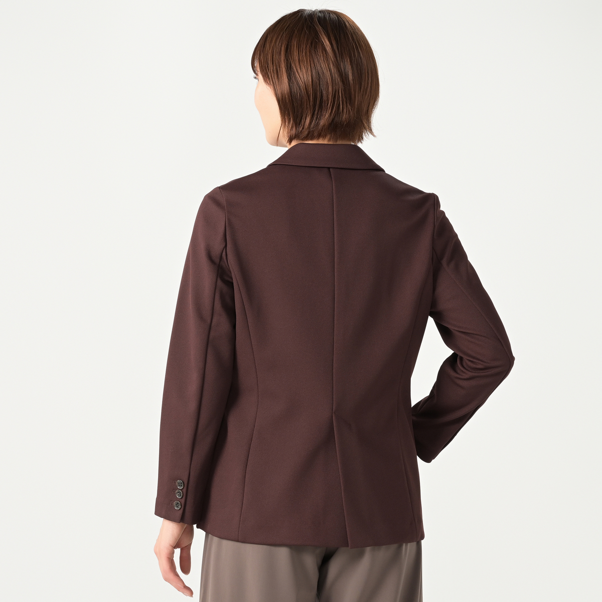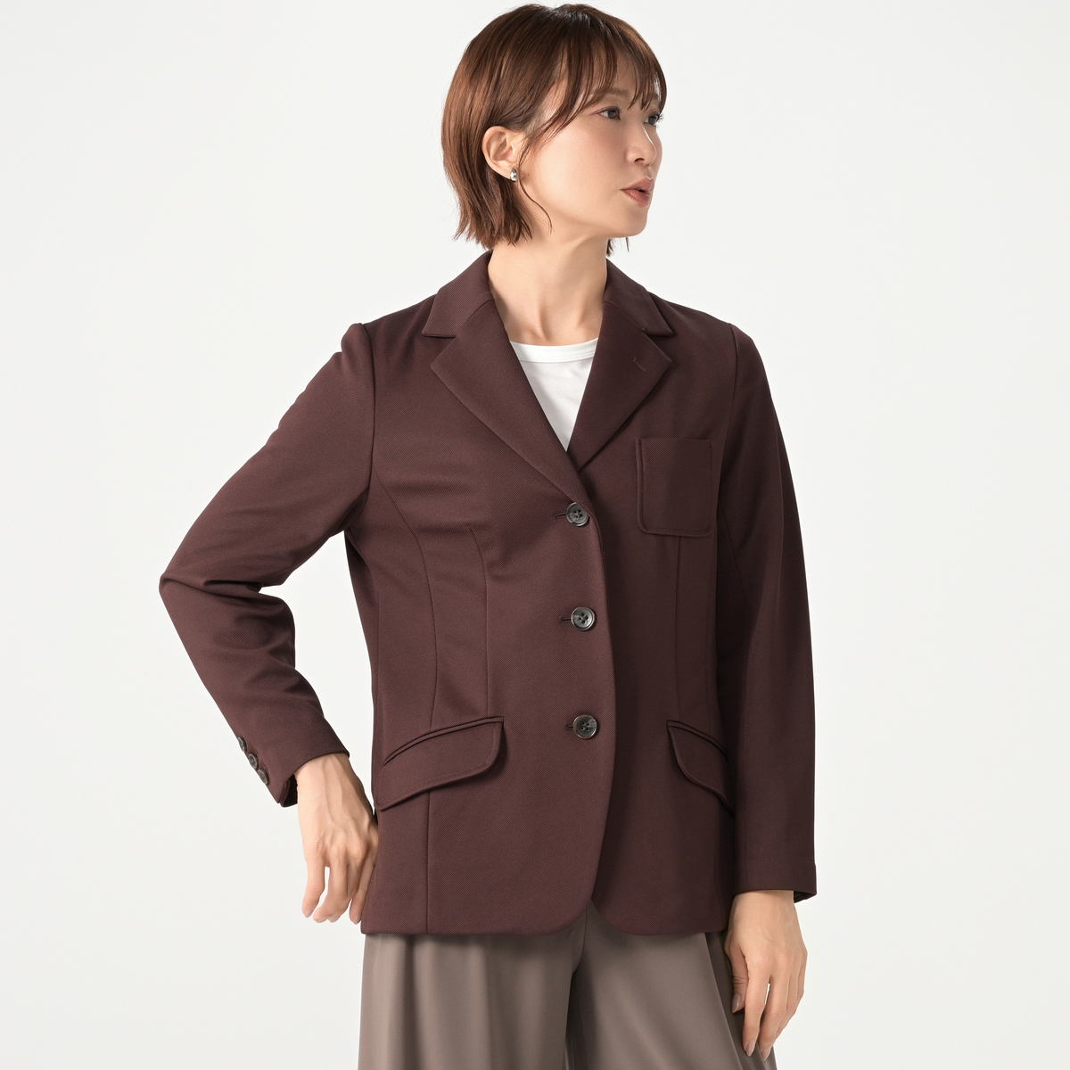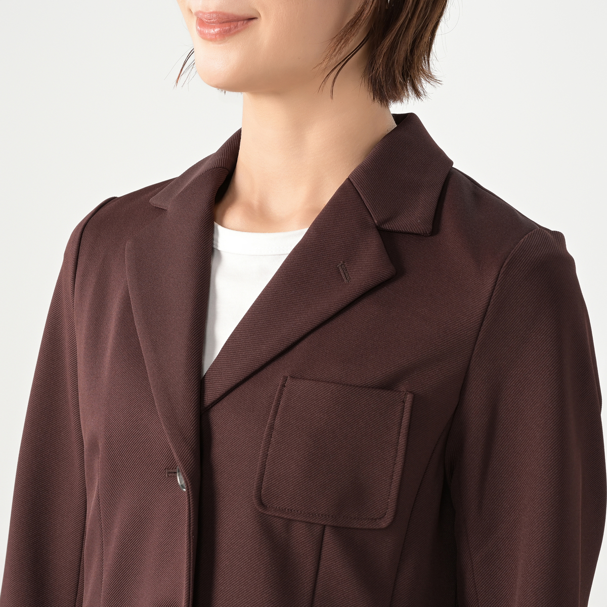 ウエストをソフトに絞った適度なゆとりのあるセミフィットシルエットのジャケット。ボトムスやインナーに合わせやすい着丈で、背中心裾は動きやすいベント仕様。前見返し端・背中心〜ベントまで、メタリック色のパイピング始末を施しています