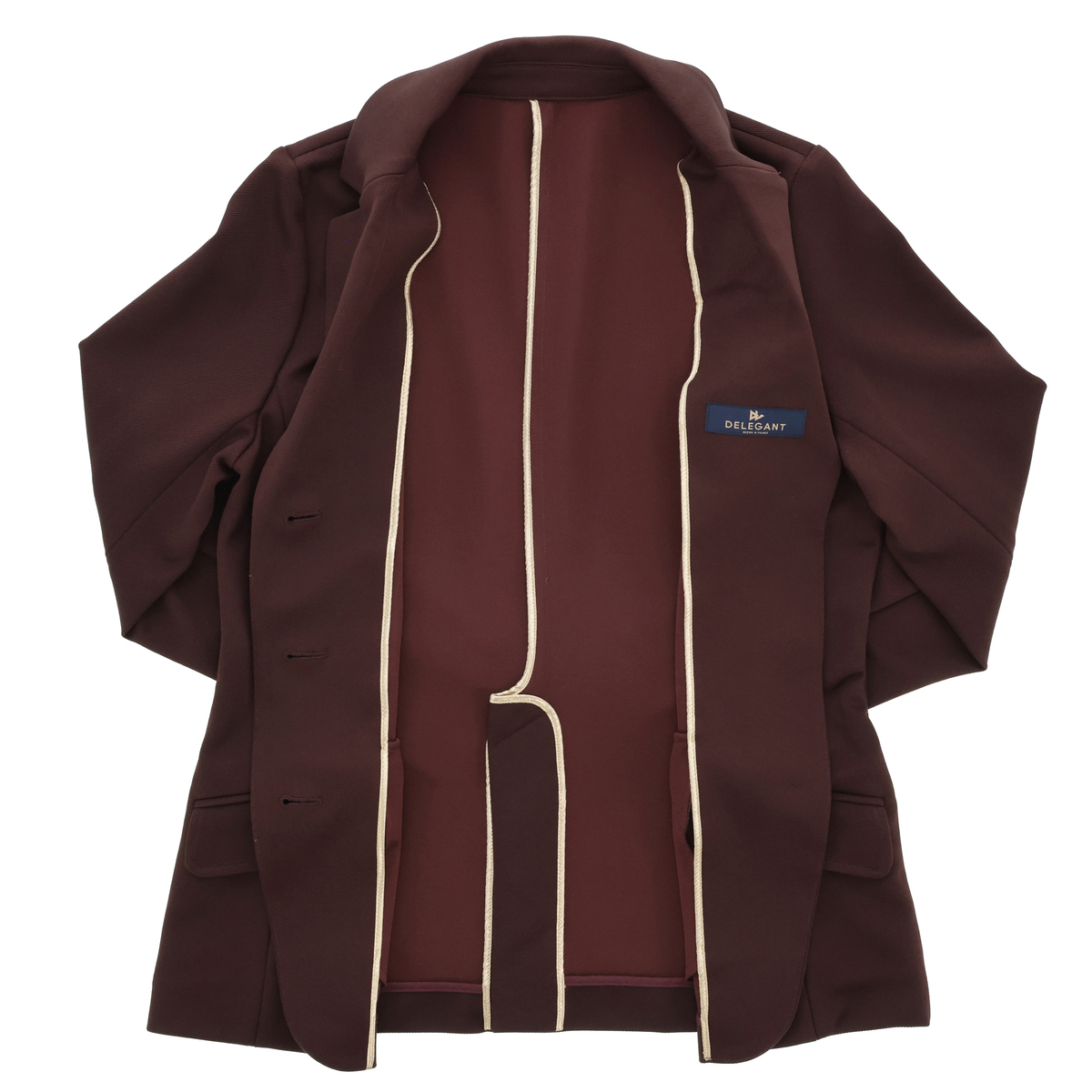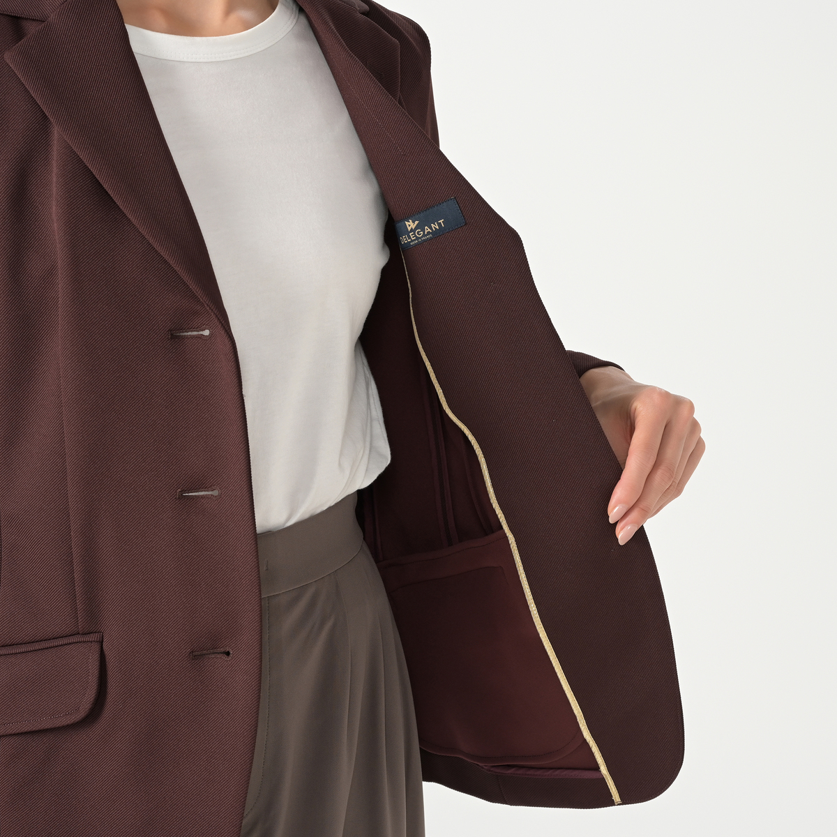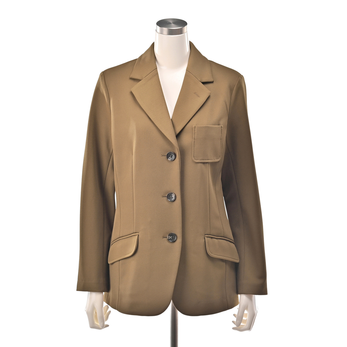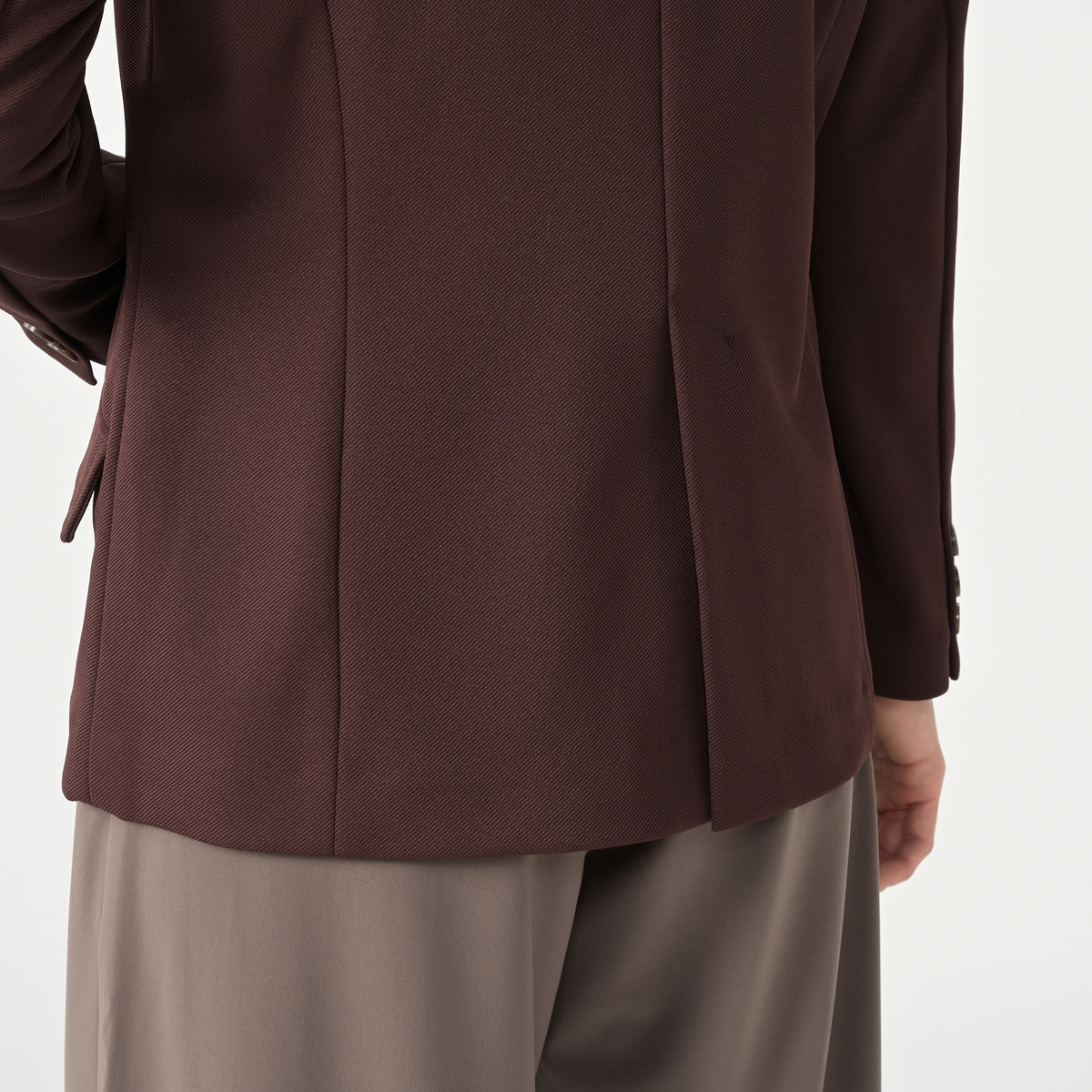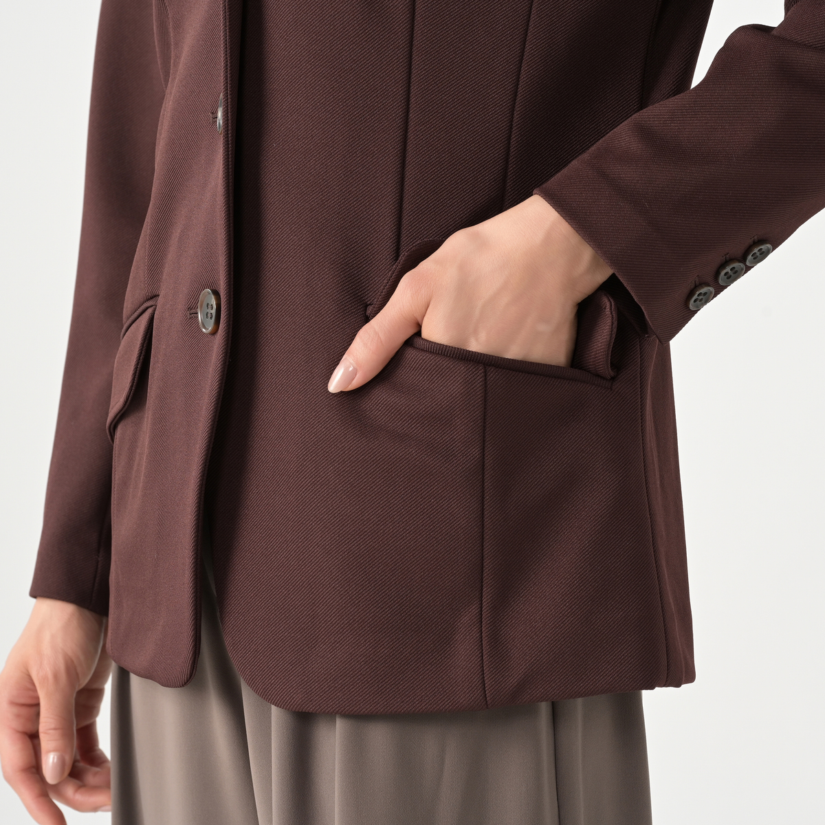 ウエストをソフトに絞った適度なゆとりのあるセミフィットシルエットのジャケット。ボトムスやインナーに合わせやすい着丈で、背中心裾は動きやすいベント仕様。前見返し端・背中心〜ベントまで、メタリック色のパイピング始末を施しています
