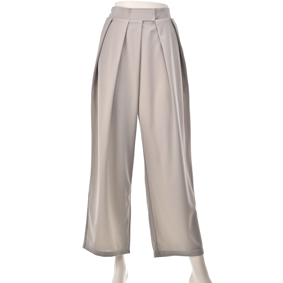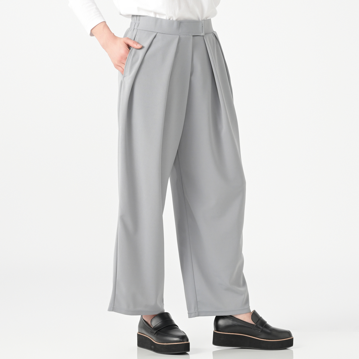 美しいラインと快適な着心地を兼ね備えたワイドパンツ。特別なパターン設計により、すっきりとした縦ラインを強調し、脚長効果を演出。フロントウエスト部分に4本のタックが入ることで立体的なドレープが生まれ、このタックが影と光を生み、シルエットに奥行きを与えます