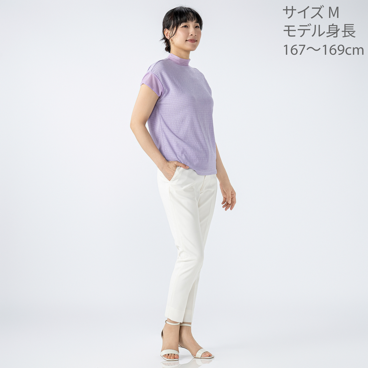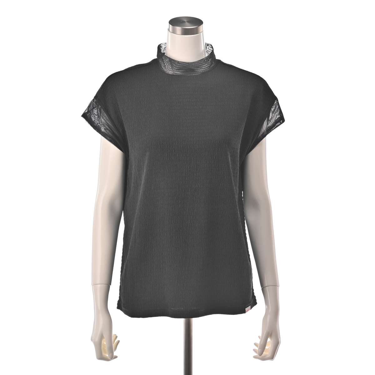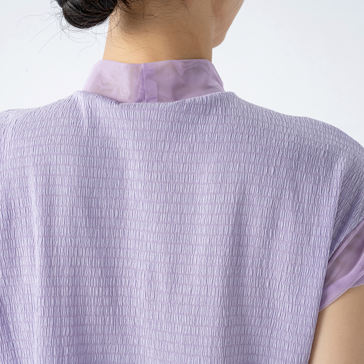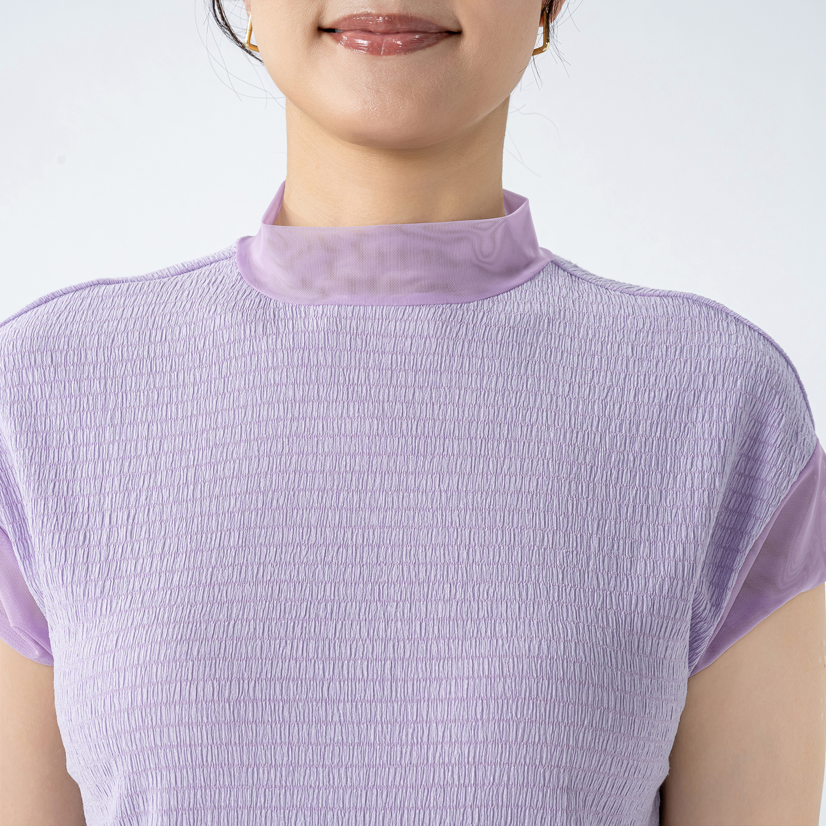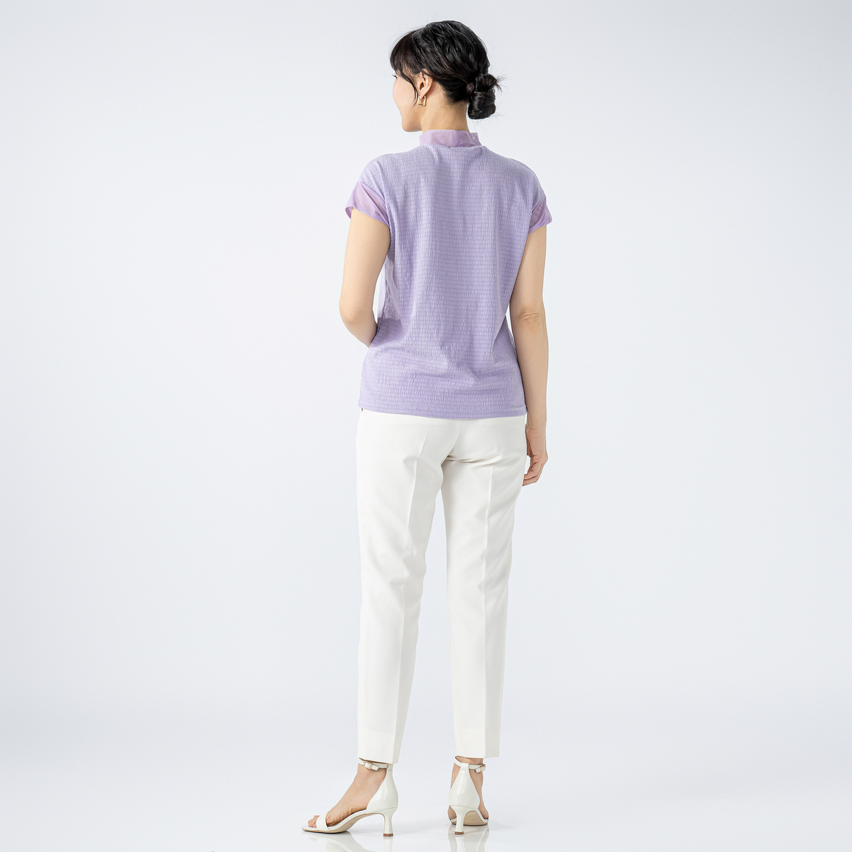 Tシャツ感覚で着心地がよい、ワンランク上のプルオーバー。スタンドカラーにシアー素材を採用し、お顔周りを華やかな印象に。お袖もシアー素材の上品で洗練されたデザインです