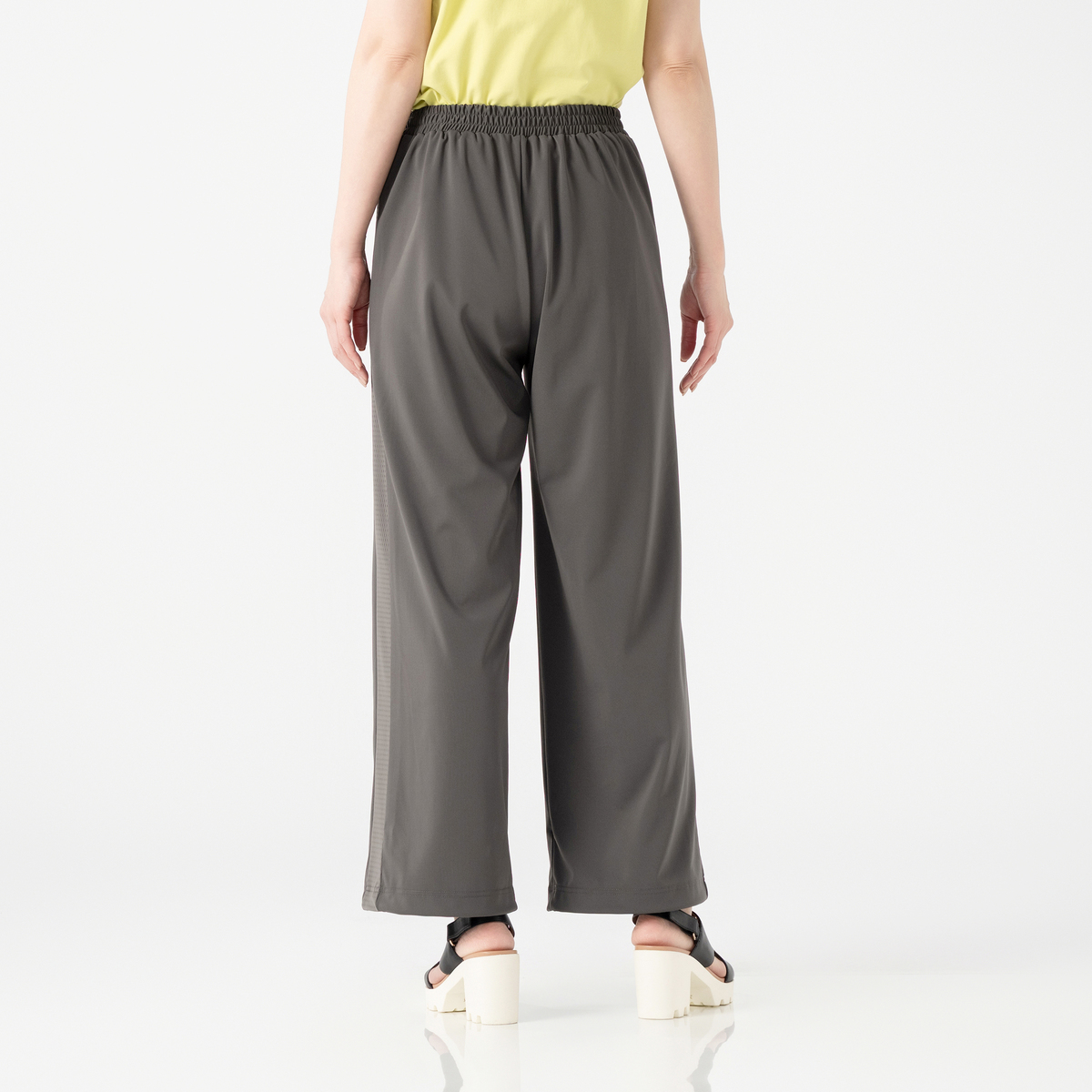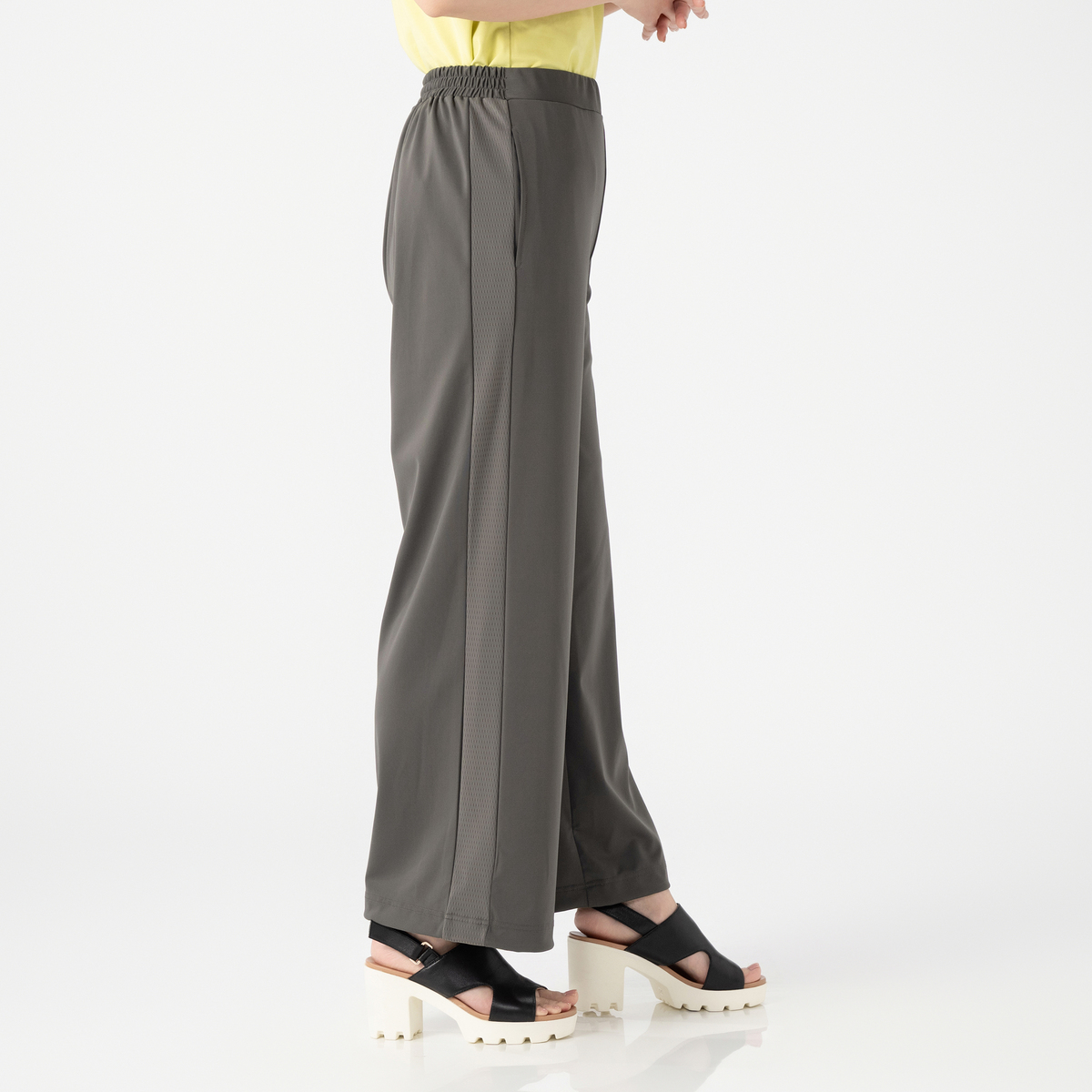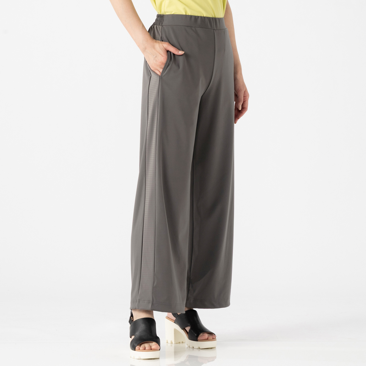 強撚スムース素材で仕立てたワイドパンツ。メッシュのサイドラインがポイントのシンプルなデザインです