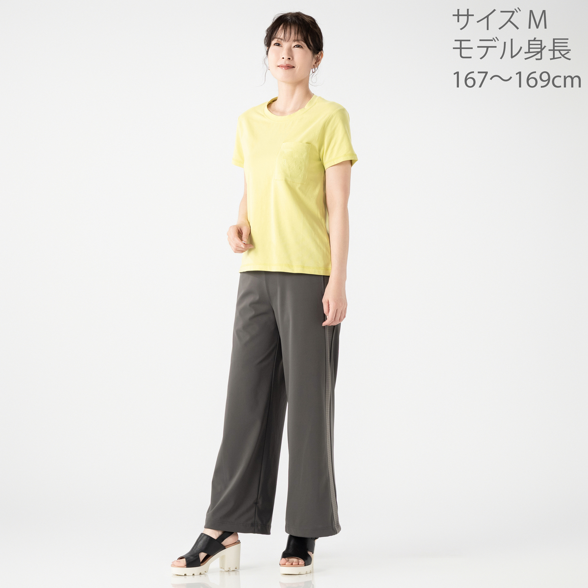 商品番号742463 『MASAGO 強撚スムースとメッシュ使いパーカー』とセットアップできるスタイリッシュなワイドパンツです。