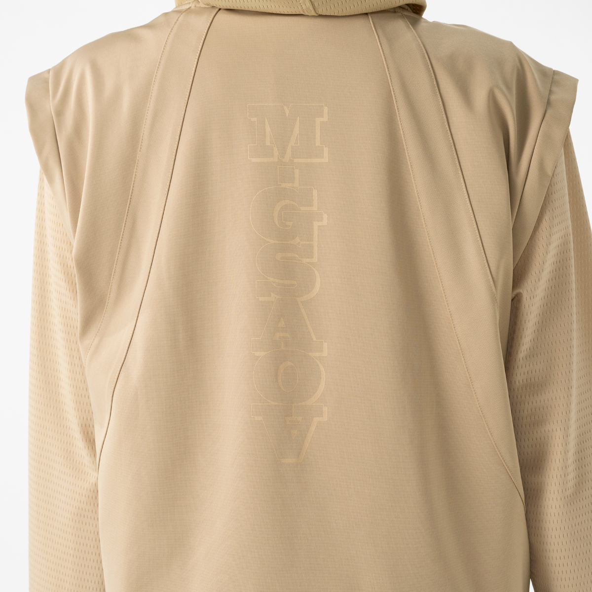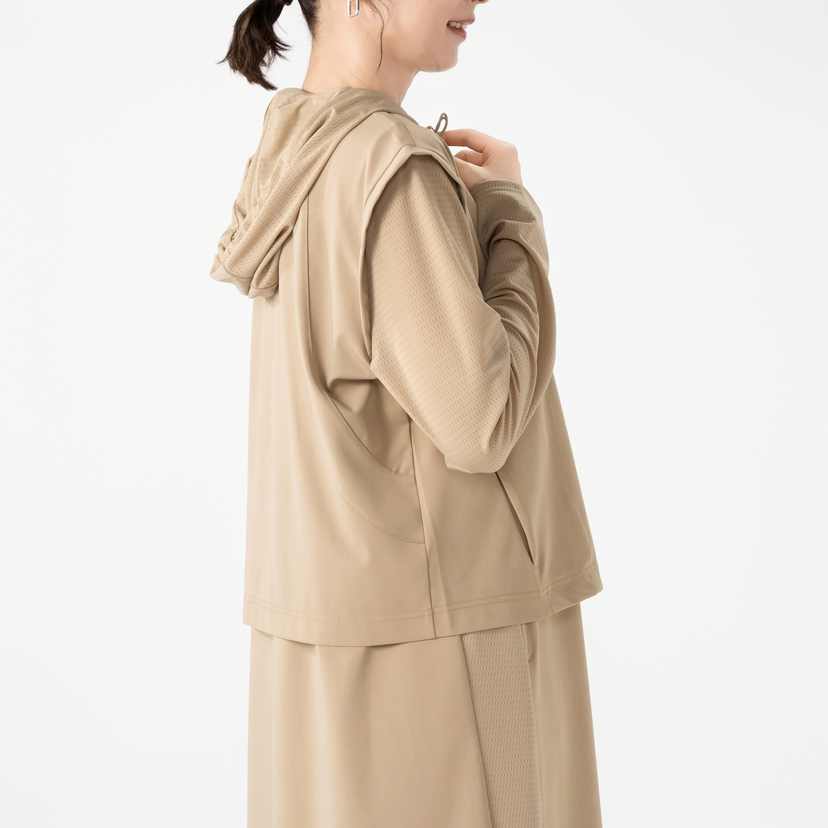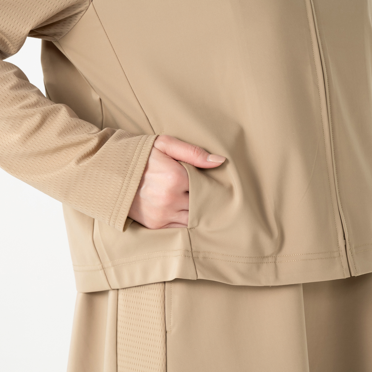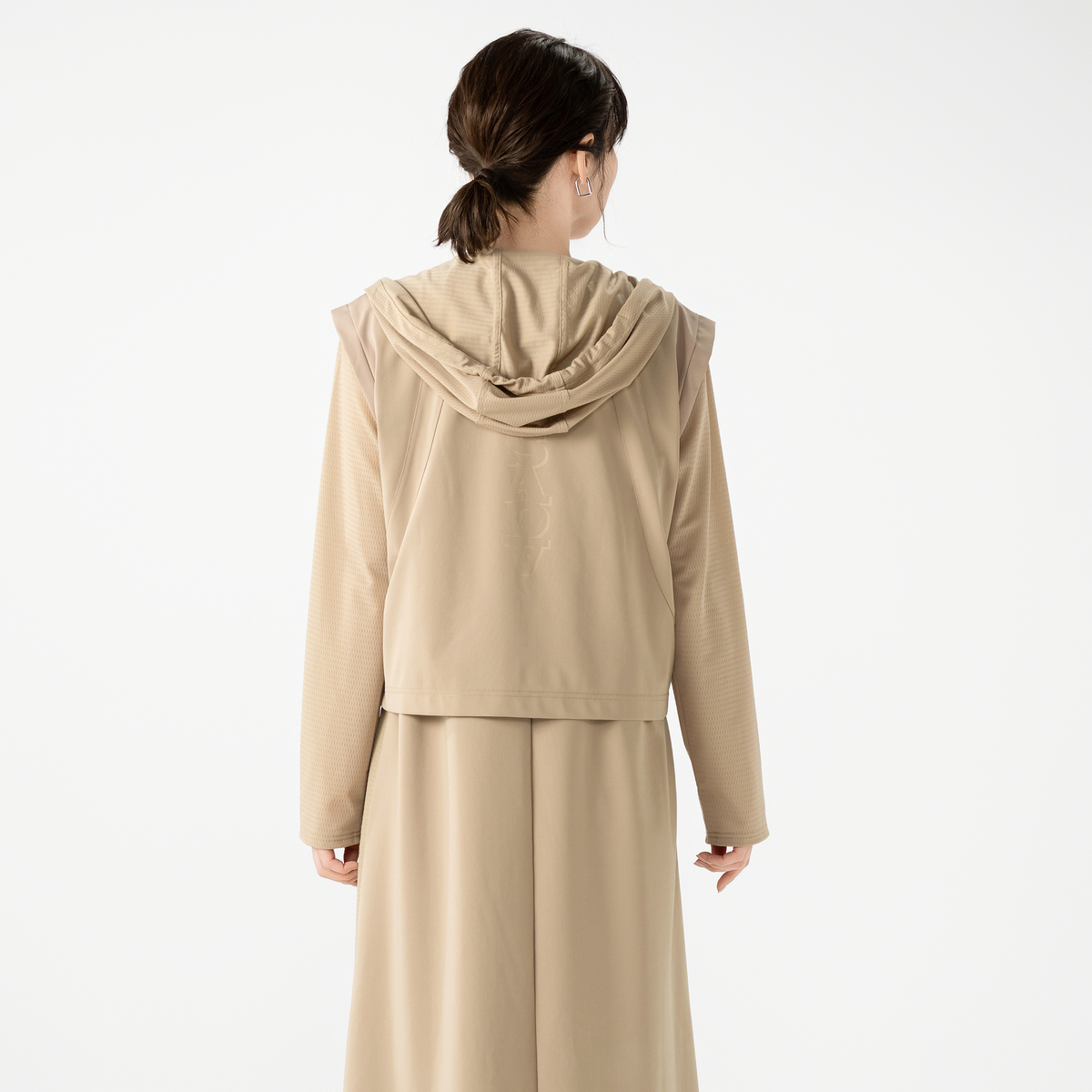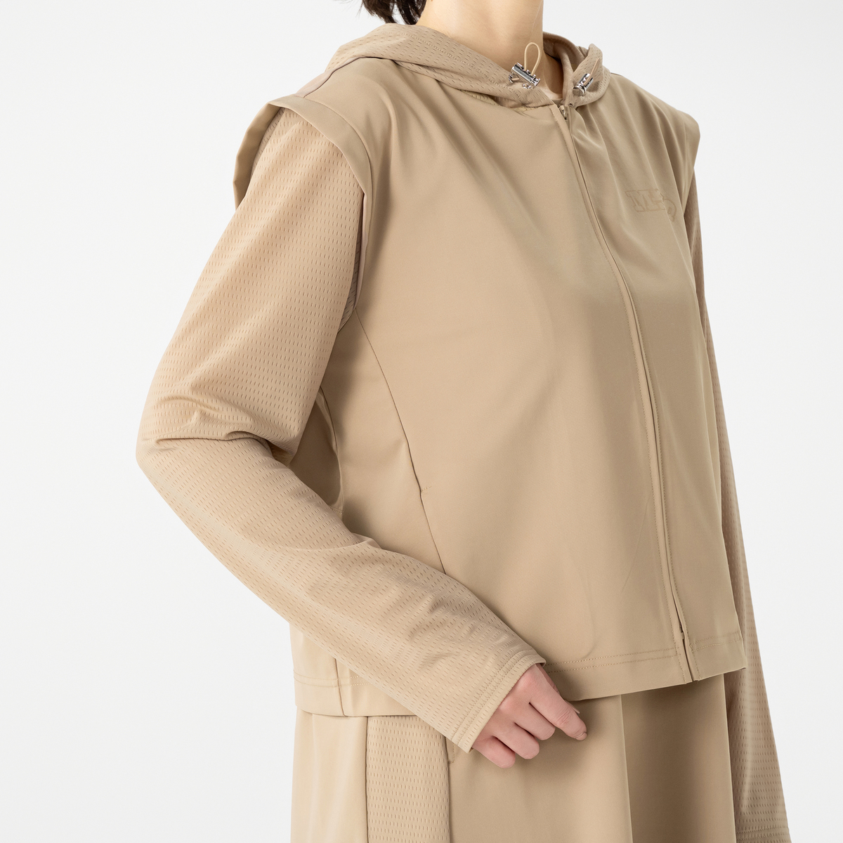 パンツとセットアップにするか悩みましたが購入。生地は申し分無しです。 肩山のタックは袖が取り外せるパーカーに見えて何だかなぁ。袖が長いのは承知ですがこのツルツルの上着で袖まくりができないデザインはストレスになりそうです。ジップは生地と同色ですがフードの金具とのバランスを考えるとチープな気がします。