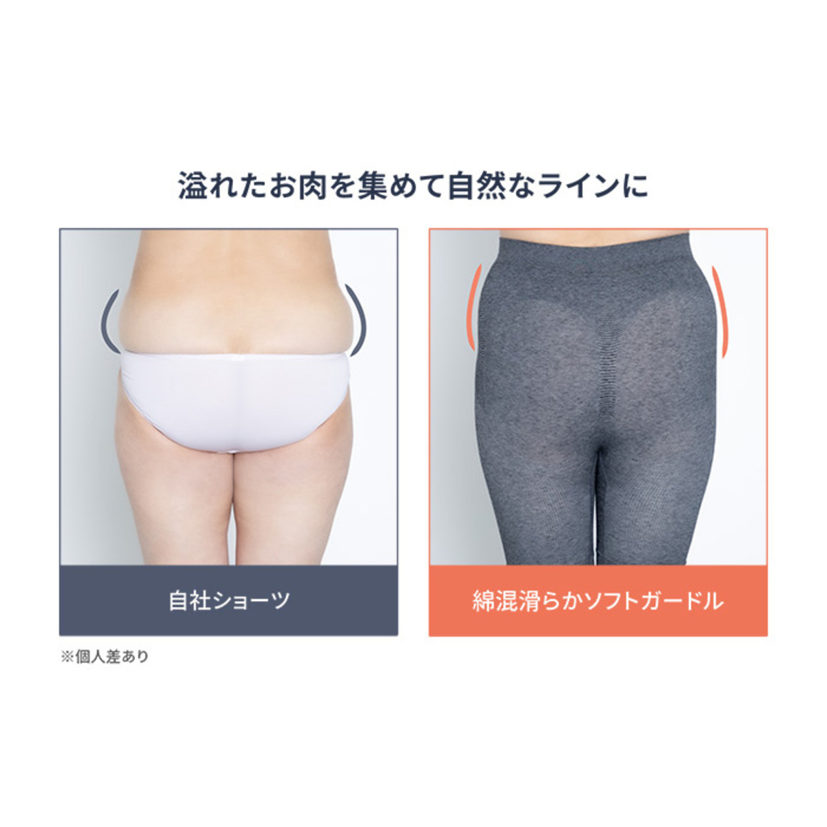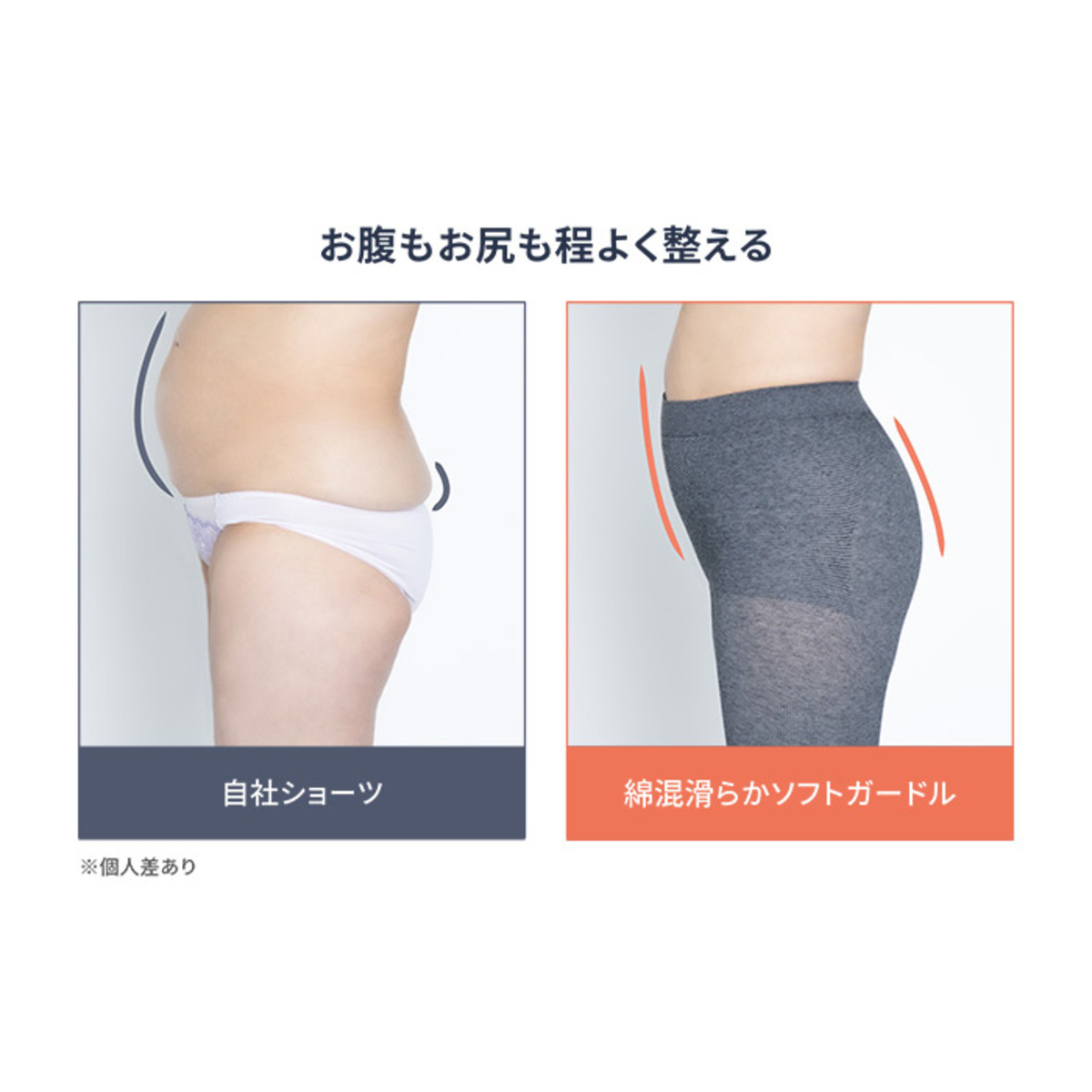 ソフトガードルとショーツの2役を1枚で。快適な肌触り、着心地、様々なボトムスに合わせやすい膝上のミドル丈で、1枚穿きもできるため、締め付け感の強い補正下着が苦手な方にもおすすめのアイテムです。ボーンやホックを使用せず、生地の伸縮性により緩やかに補正するソフトガードルです